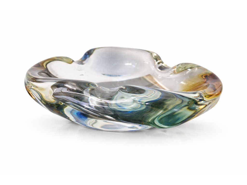 Krásná masivní mísa z hutního skla z kolekce RHAPSODY dle autorského návrhu Františka Zemka, sklárna Mstišov, r. 1958. Výška 8 cm, délka 24 cm. 100% TOP stav. Má hodně tlusté stěny, je to krásný málo vídaný typ z této kolekce.