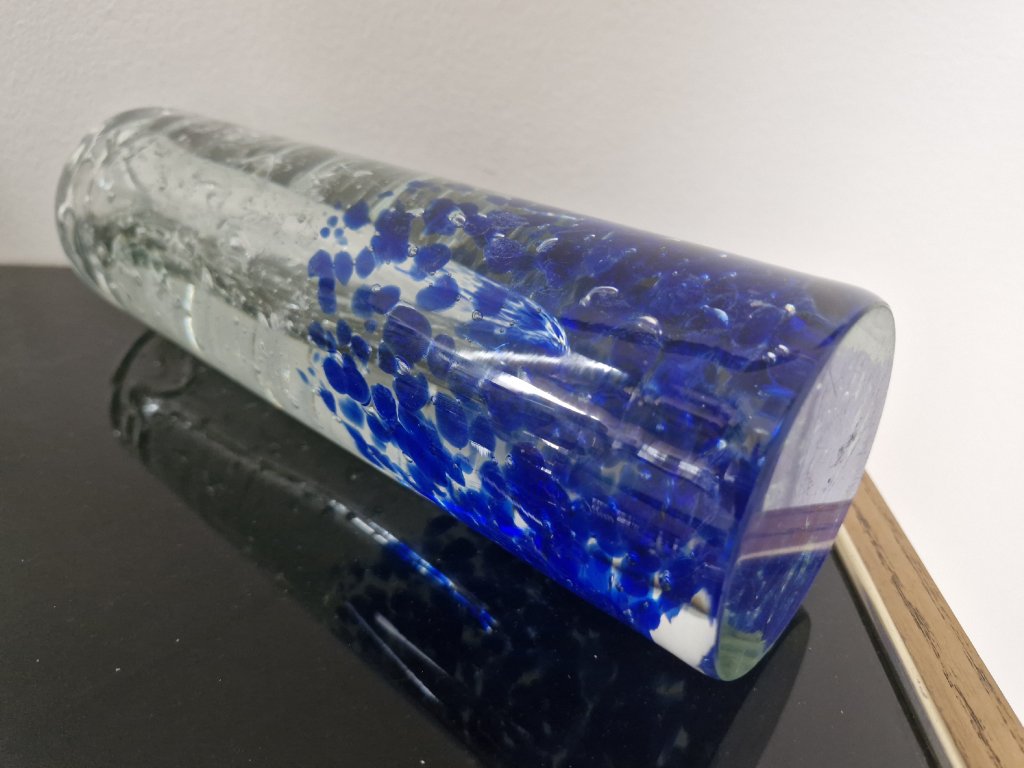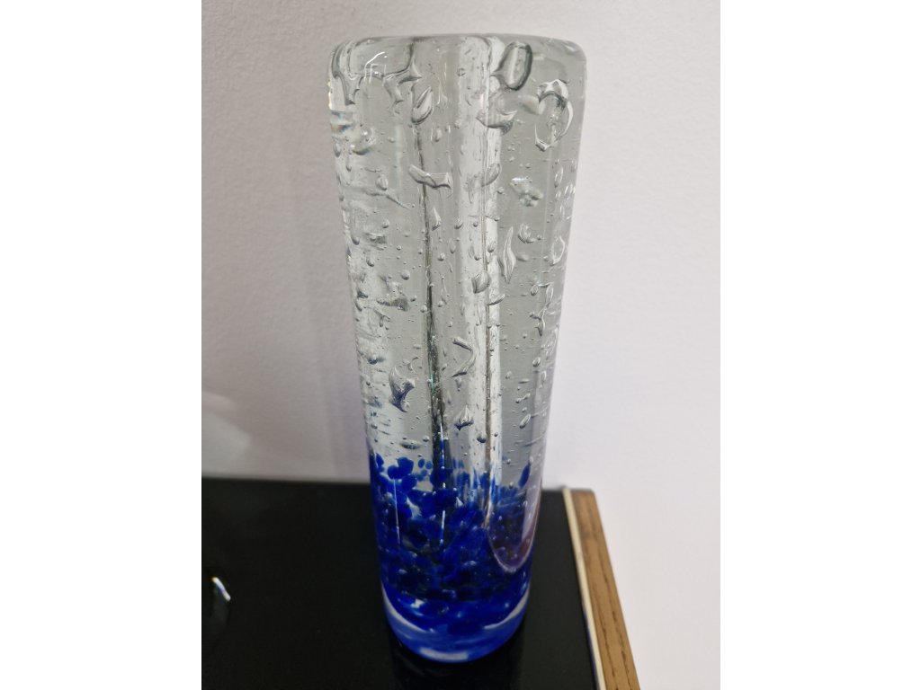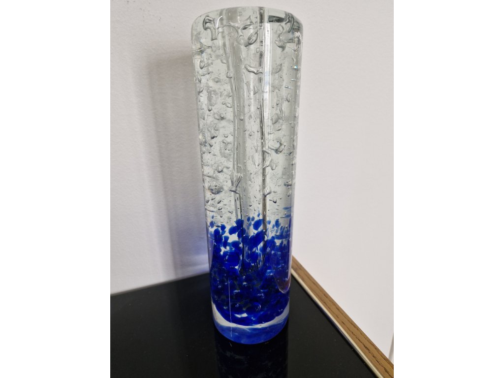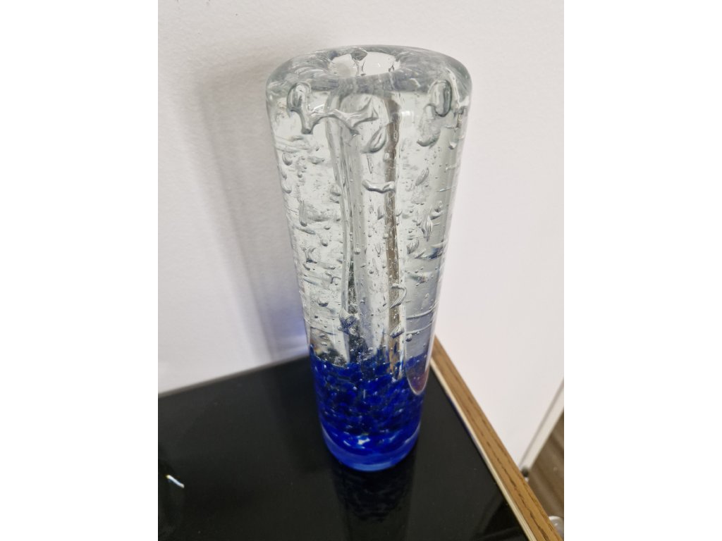 Parádní masivní váza z hutního skla v kombianci čiré a kobaltové skloviny s efektem bublin dle autorského návrhu Jaroslava Svobody, sklárna Škrdlovice, r. 1969. Výška 28 cm. Top stav.