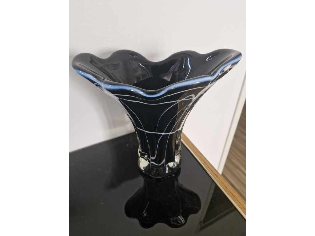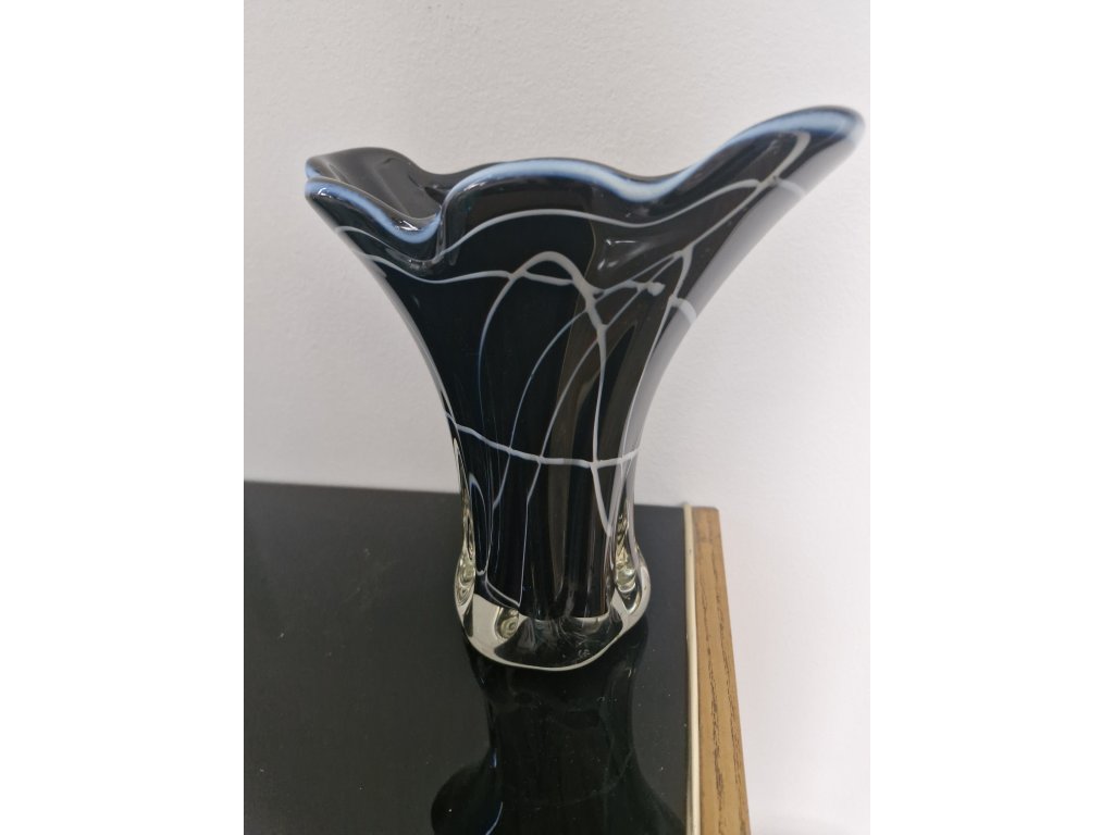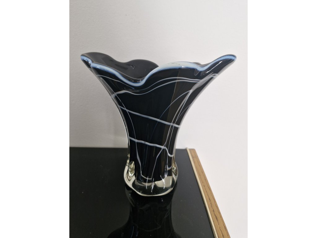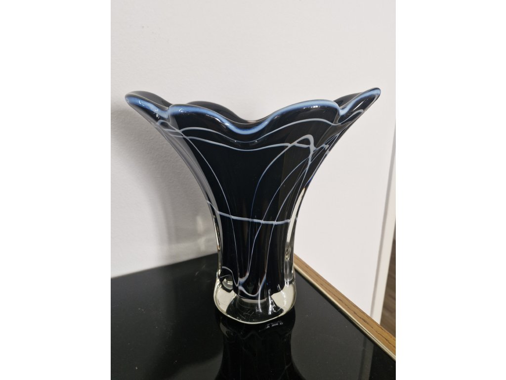 Nádherná masivní váza z hutního skla v černé barvě s bílým nitkovým dekorem. Autorský návrh Josef Kubinec, sklárna Lenora, r. 1966. Výška 22,5 cm. Top sběratelský stav.