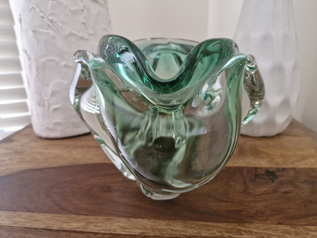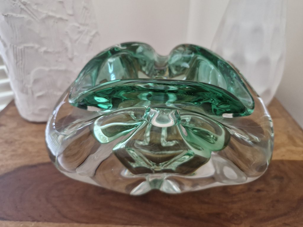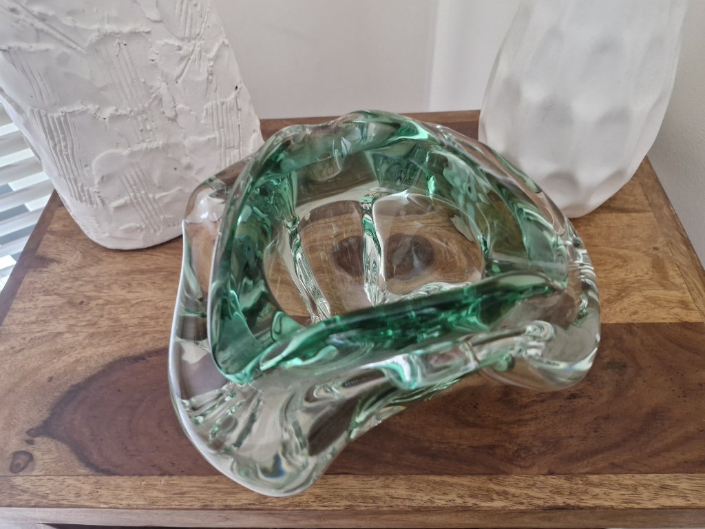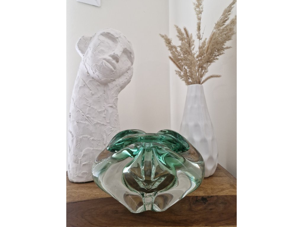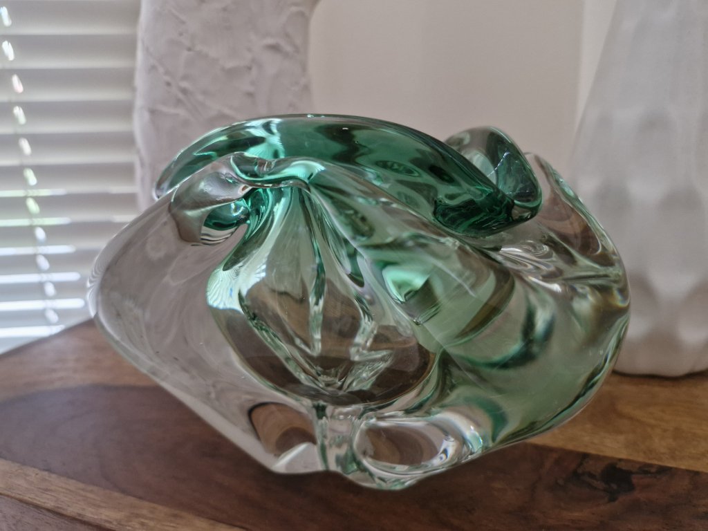 Krásná, těžká mísa z hutního skla v krásné barevné kombinaci - spodní část je čirá a postupně prochází do smaragdově zelené. Autor návrhu Josef Hospodka, sklárna Chřibská, 60. léta 20. století. Výška 15 cm, průměr 21 cm. Top stav.