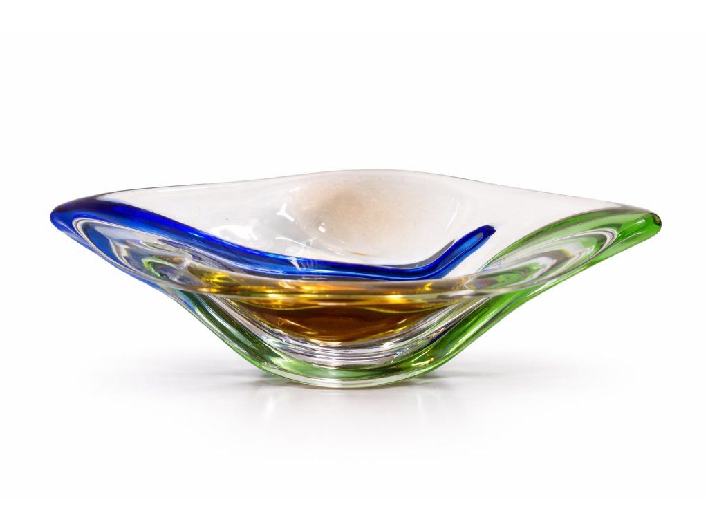 Krásná mísa z hutního skla z kolekce RHAPSODY dle autorského návrhu Františka Zemka, sklárna Mstišov, r. 1958. Výška 10 cm, délka 34 cm. Na podstavě stopy po píšťale.