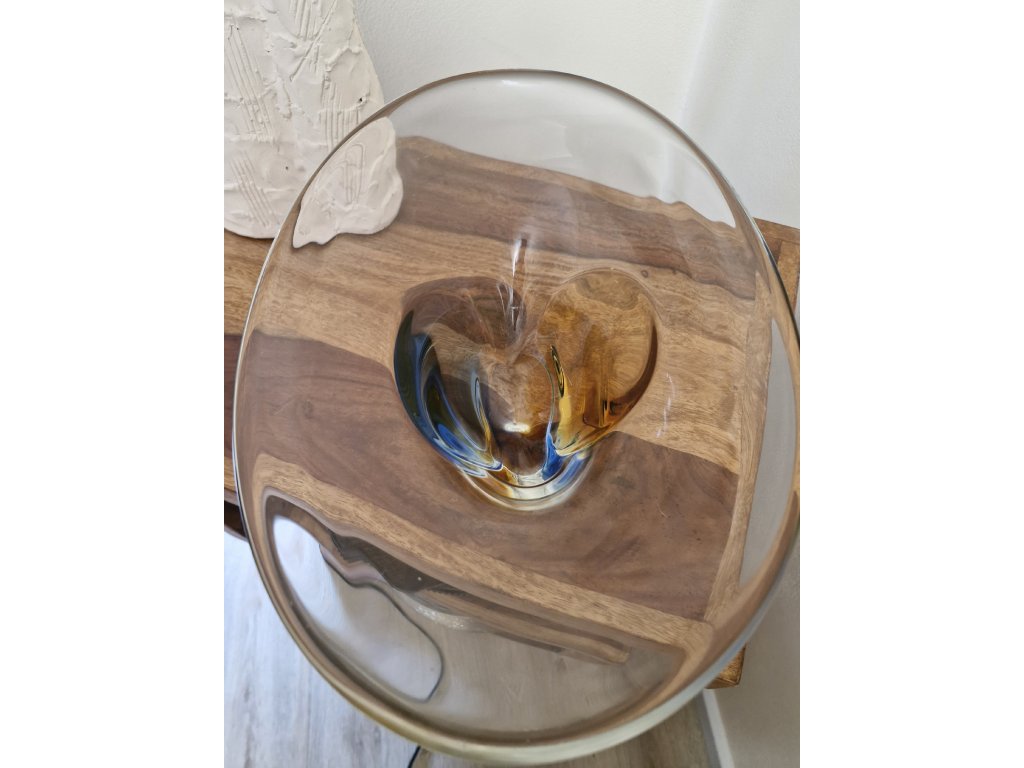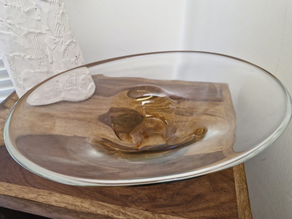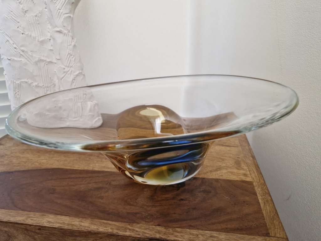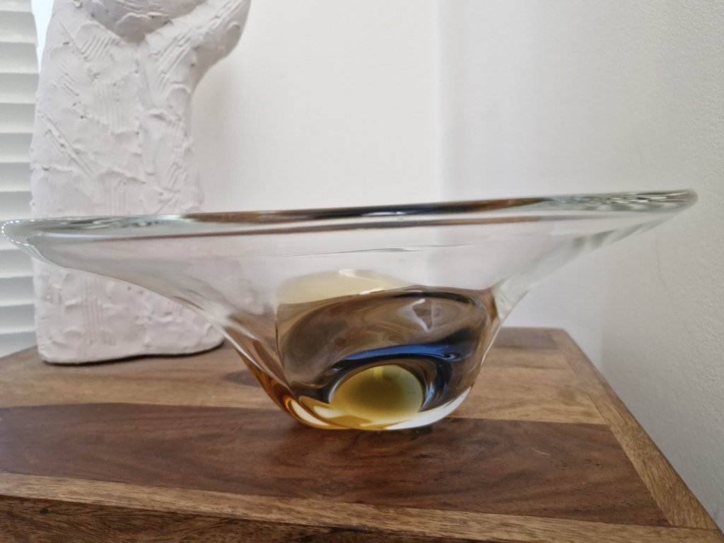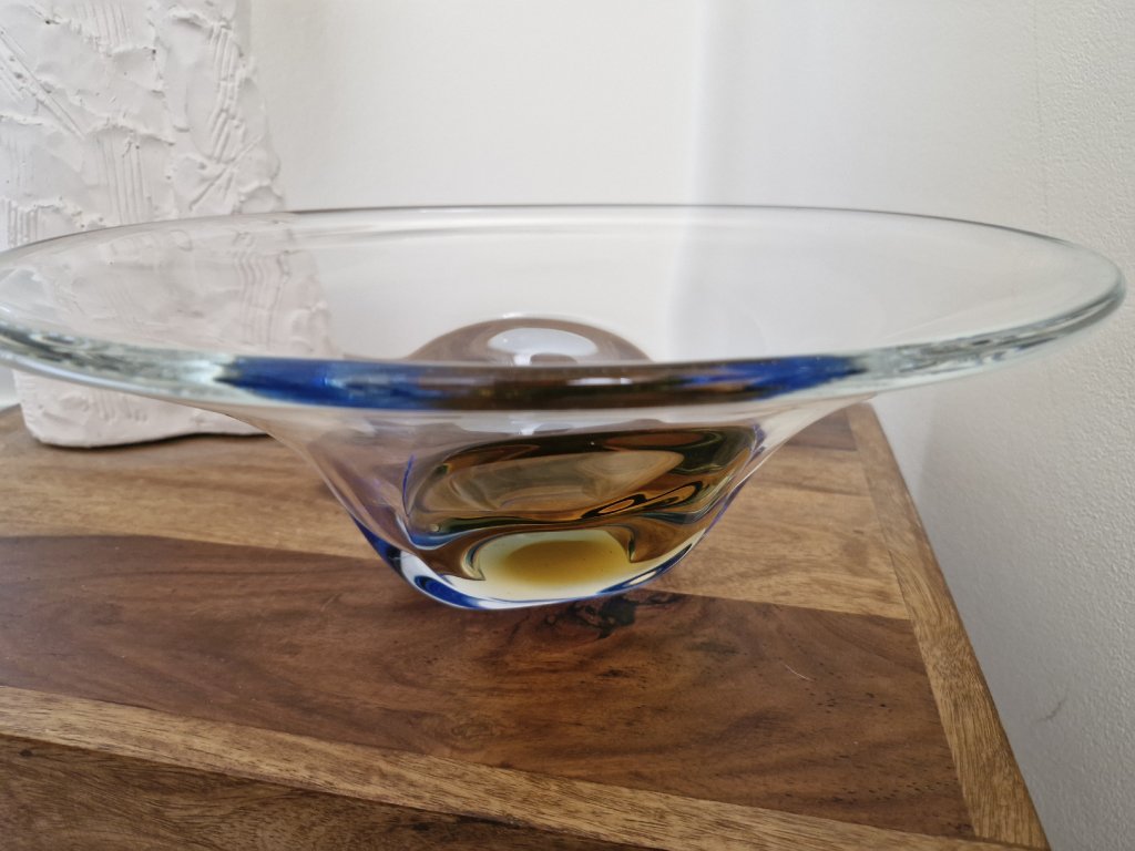 Mísa z hutního skla, návrh Oldřich Lípa + Luboš Metelák, Moser. Výška 11 cm, délka 32 cm. Top stav.