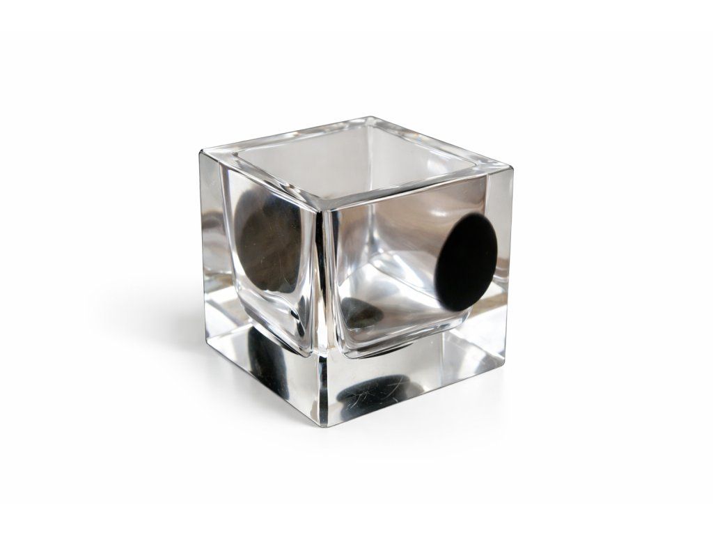 Zajímavá miska z broušeného skla s dekorem fleků/puntíků z tmavé skloviny. Z produkce Art Glass PRINC, Žďár nad Sázavou, 90. léta 20. století. Rozměry: 8x8 cm. Top stav.