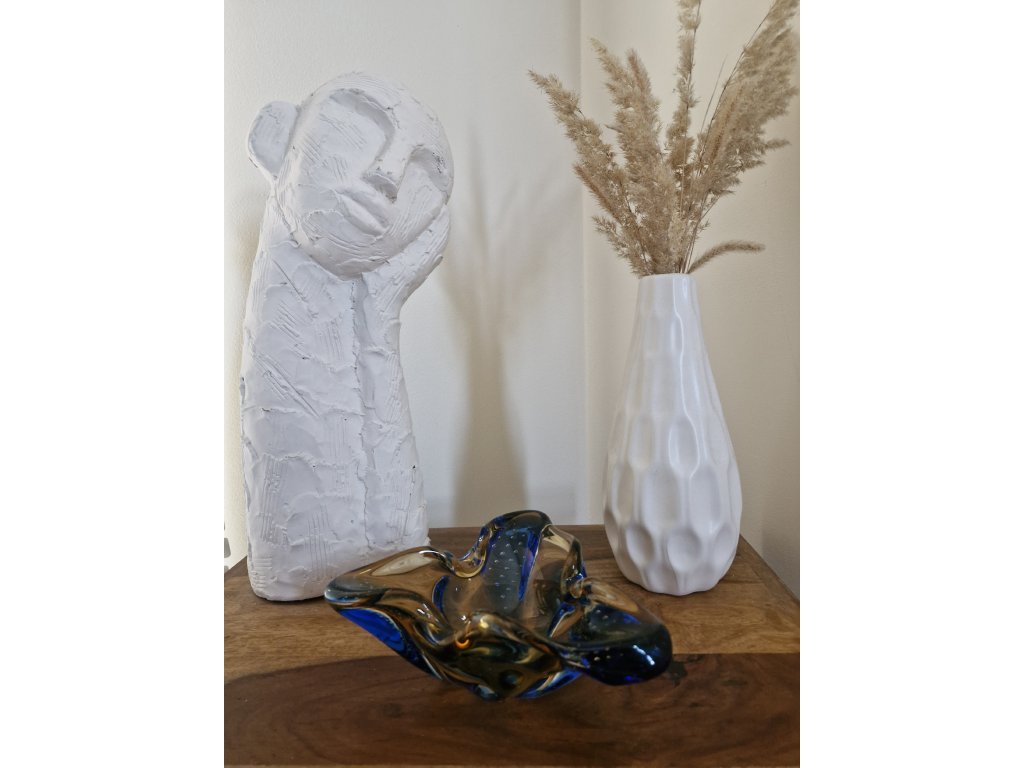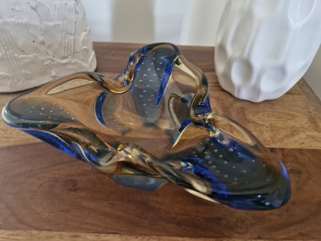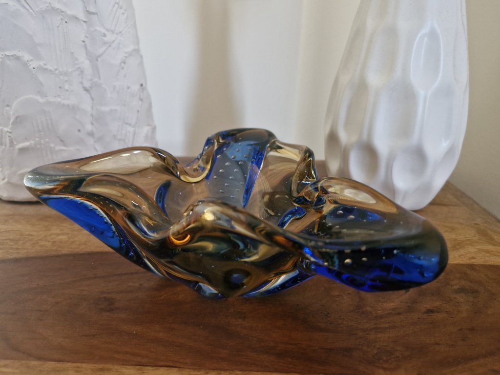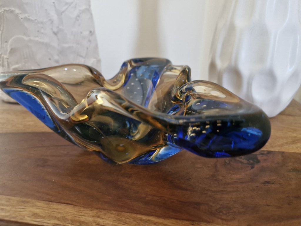 Nádherná dvoubarevná miska/popelník z hutního skla s dekorem řízených bublinek z kolekce HANA, autorský návrh Karel Zemek, sklárna Mstišov, r. 1960. Výška 6 cm, délka 19 cm. Top stav.