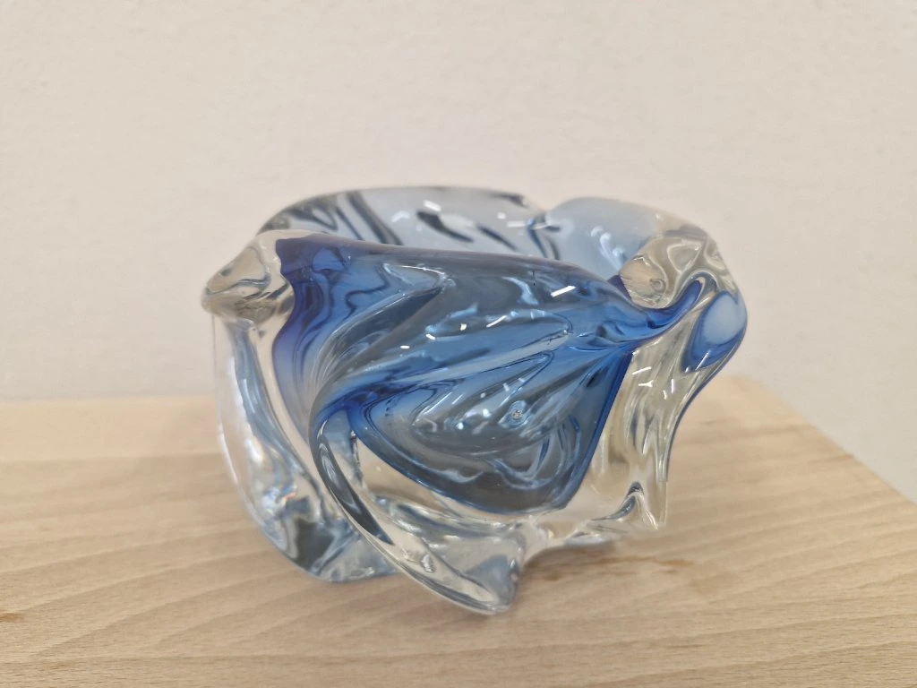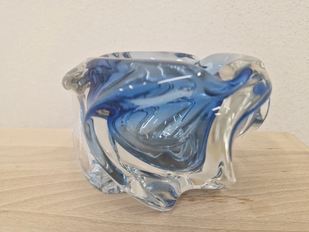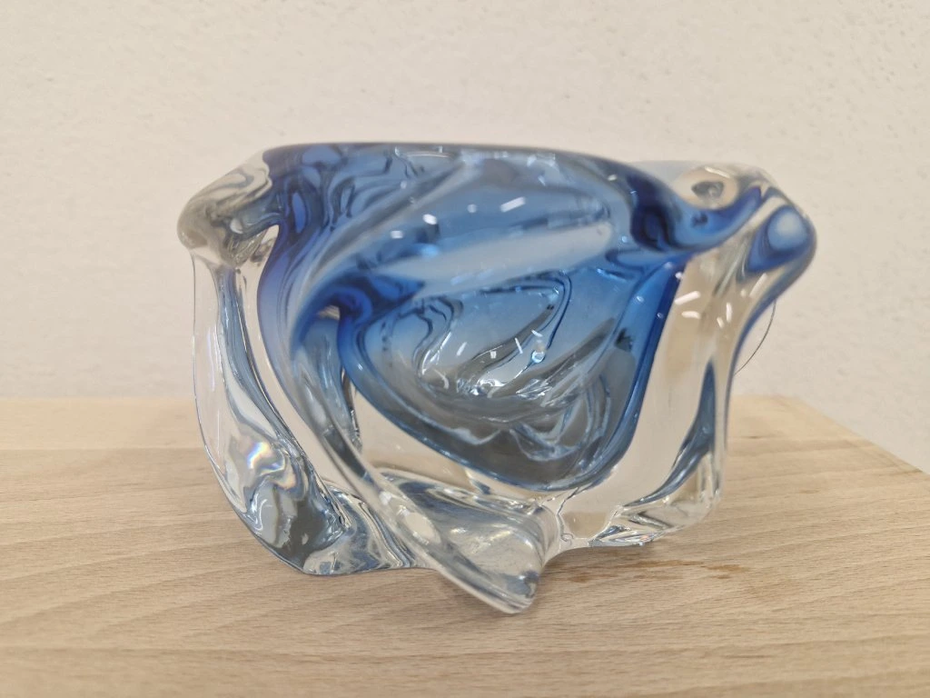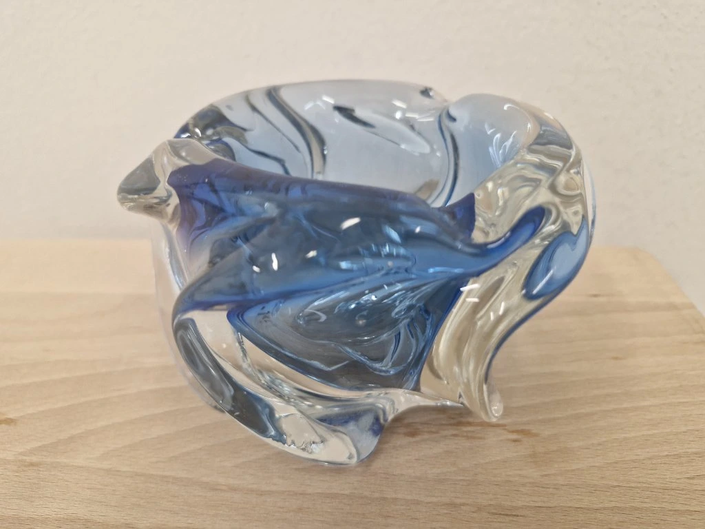 Krásná fialová miska z hutního skla zatočená do tvaru vrtule dle autorského návrhu Josefa Hospodky, sklárna Chřibská, 60. léta 20. století. Výška 9 cm, průměr 13 cm. Top stav.