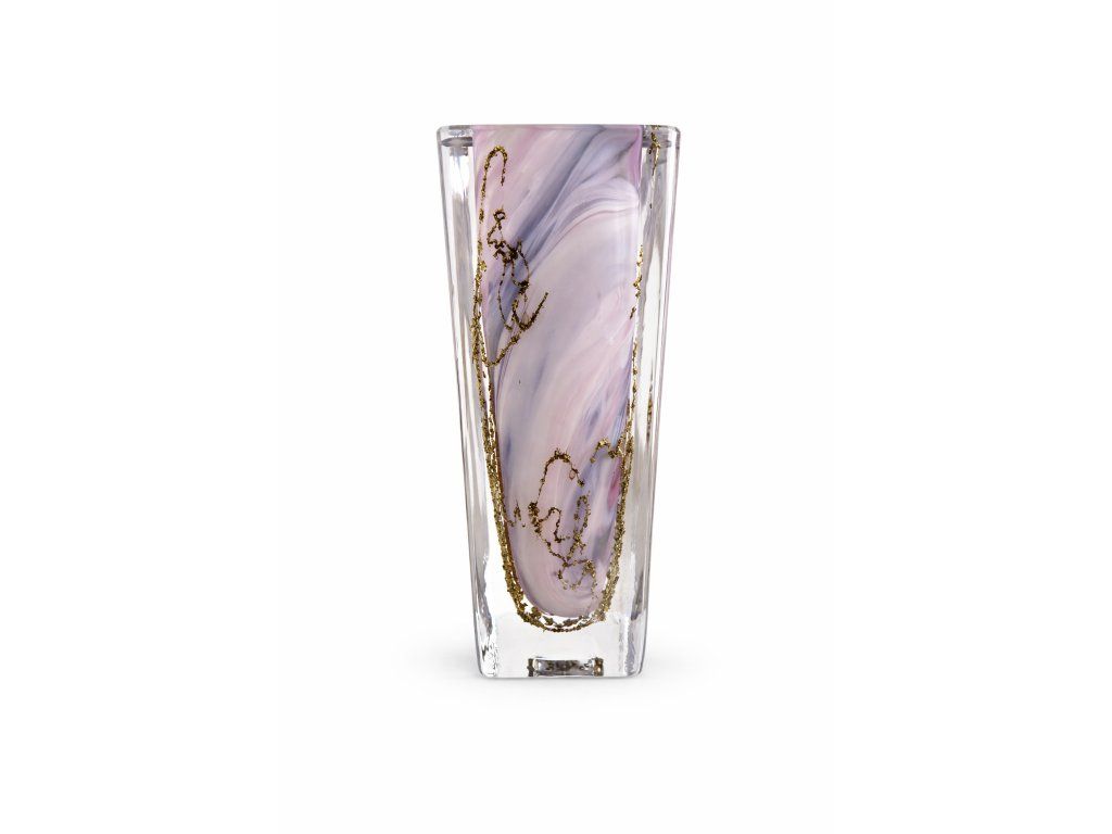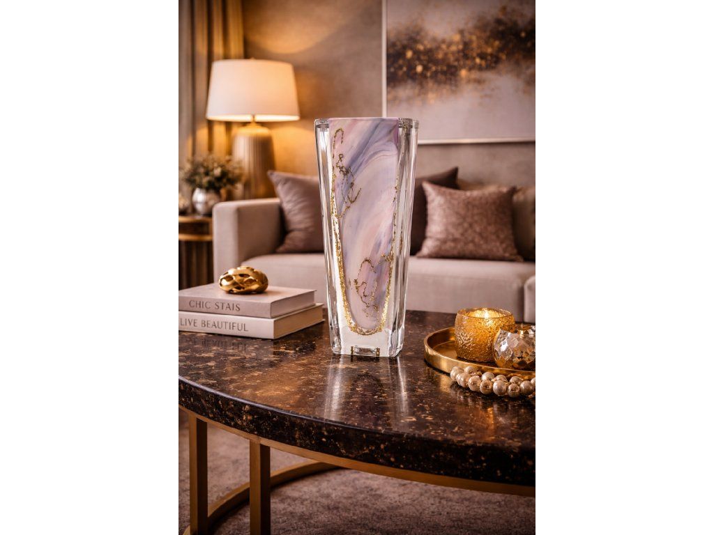 Váza z hutně tvarovaného skla s vybroušenými hranami, ve skla byla použita kombinace sklářských barev a speciálního materiálu ve skle. Jedná se o autorskou práci sklářské dizajnérky Venduly Zámečníkové. Váza je signovaná a datovaná (2025). Výška 20 cm.