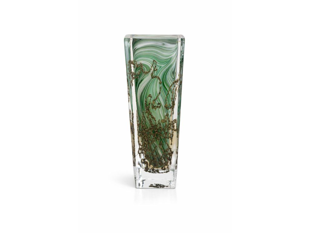 Váza z hutně tvarovaného skla s vybroušenými hranami, ve skla byla použita kombinace sklářských barev a speciálního materiálu ve skle. Jedná se o autorskou práci sklářské dizajnérky Venduly Zámečníkové. Váza je signovaná a datovaná (2025). Výška 20 cm.