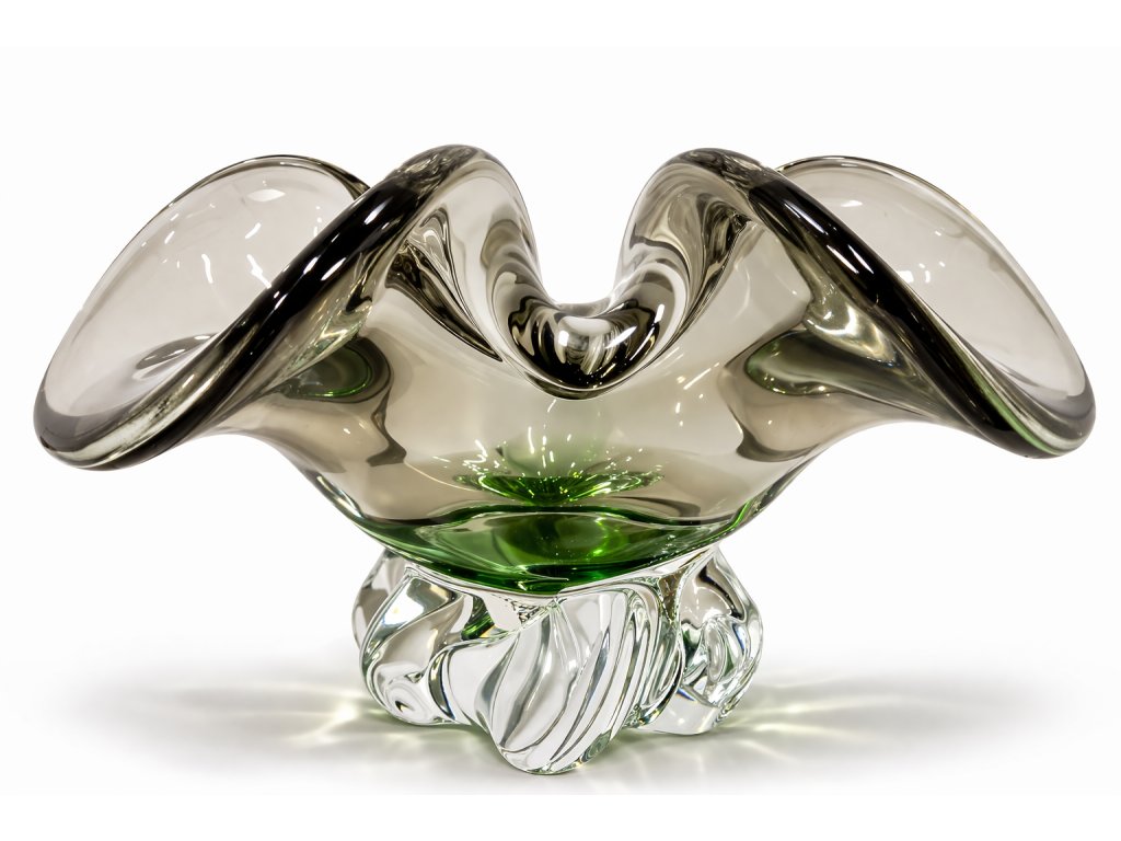 Nádherná mísa z hutního skla v krásné barevné kombnaci - kouřová s jemně zeleným středem. Z produkce sklárny Egermann Nový Bor, 90. léta 20. století. Průměr 27 cm. S původní nálepkou sklárny. Top stav nového zboží.