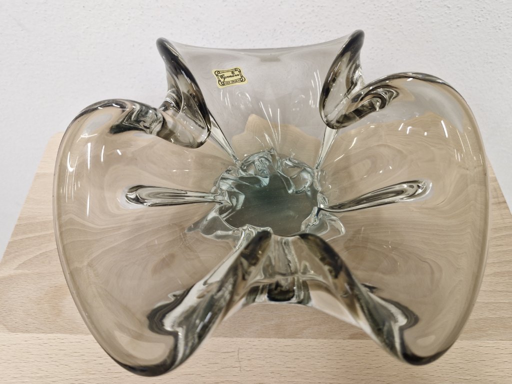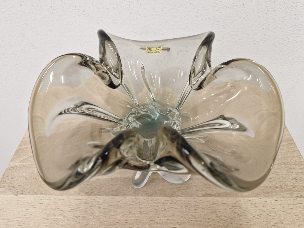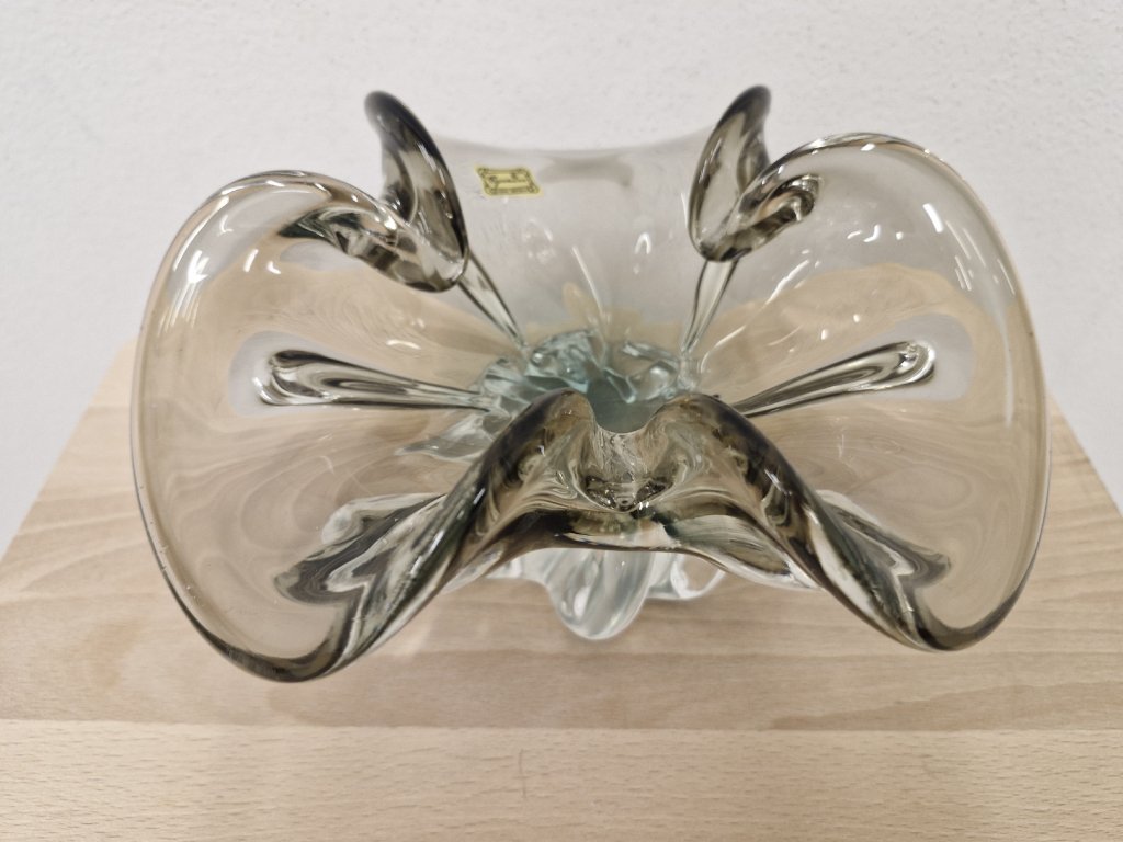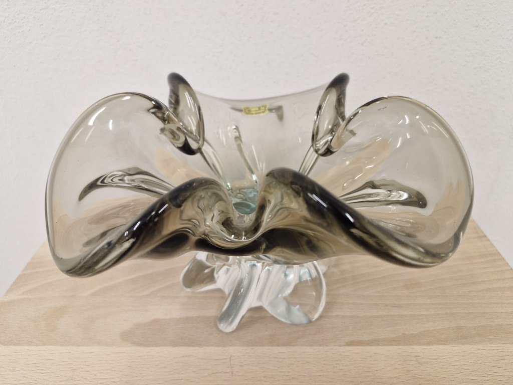 Nádherná mísa z hutního skla v krásné barevné kombnaci - kouřová s jemně modrým středem. Z produkce sklárny Egermann Nový Bor, 90. léta 20. století. Průměr 27 cm, výška 13 cm. S původní nálepkou sklárny. Top stav nového zboží.