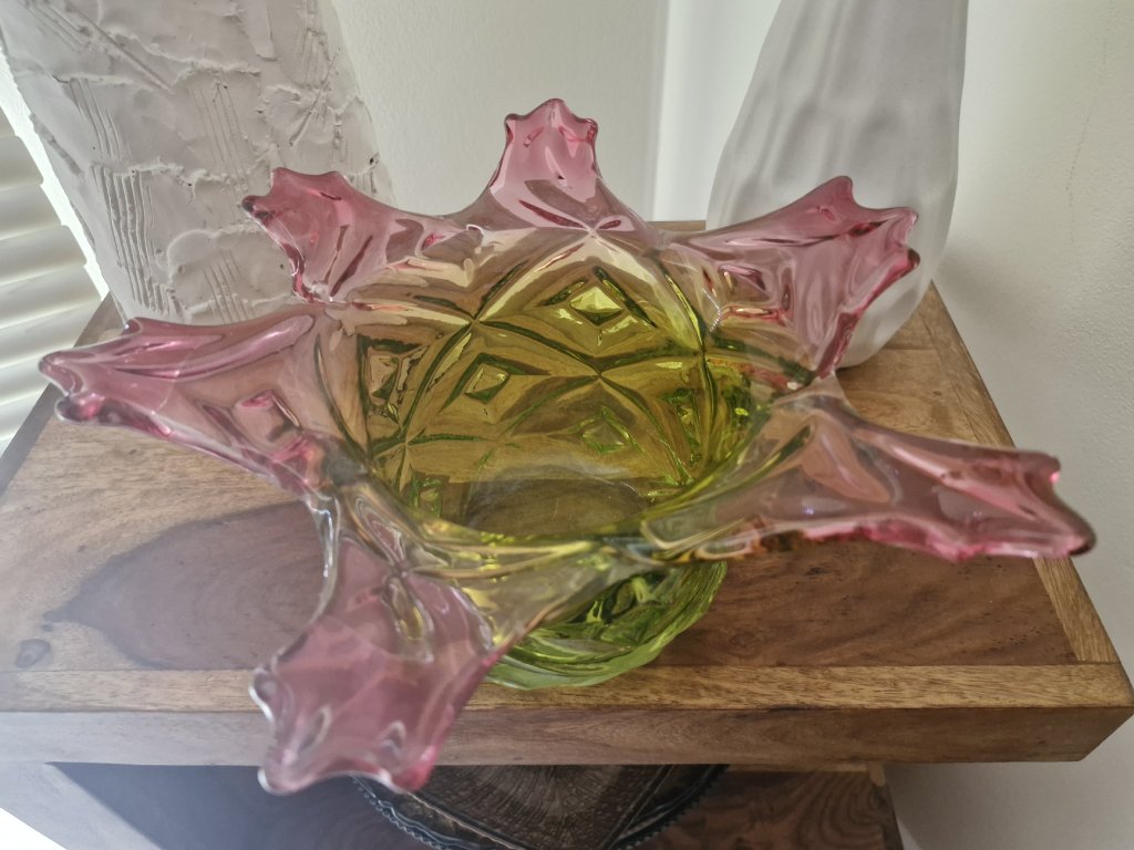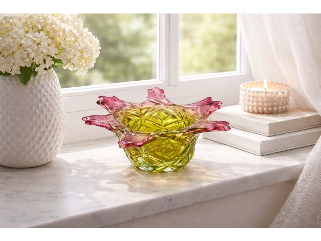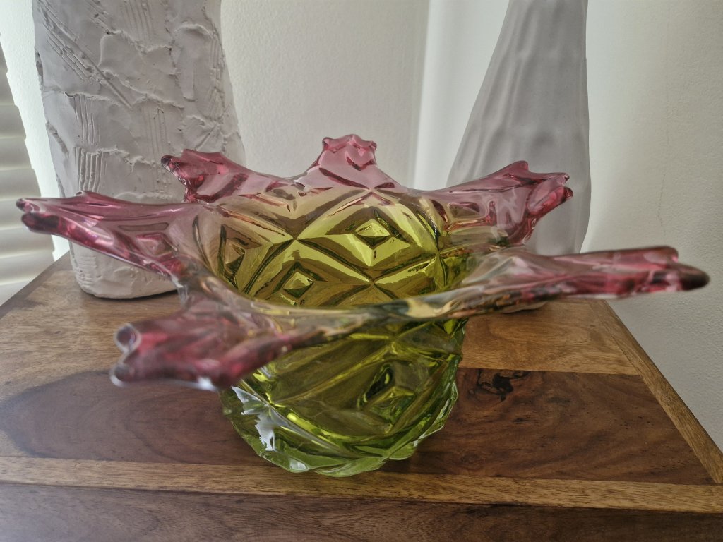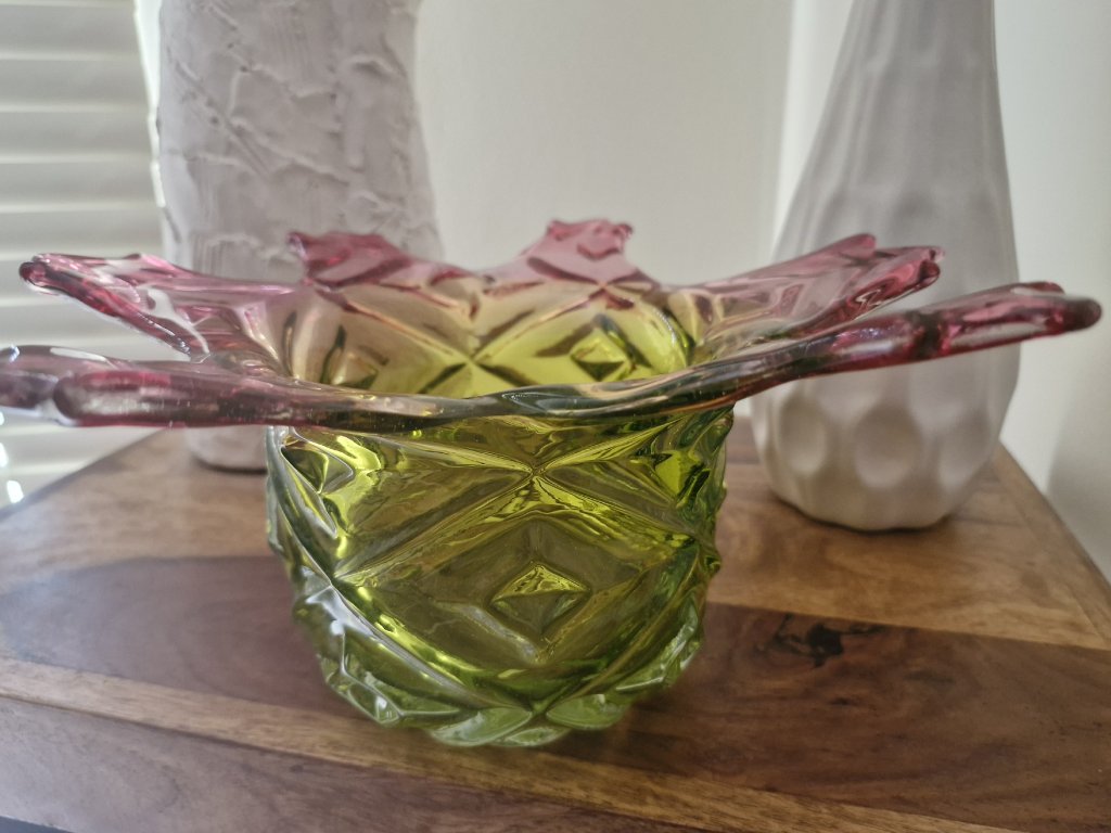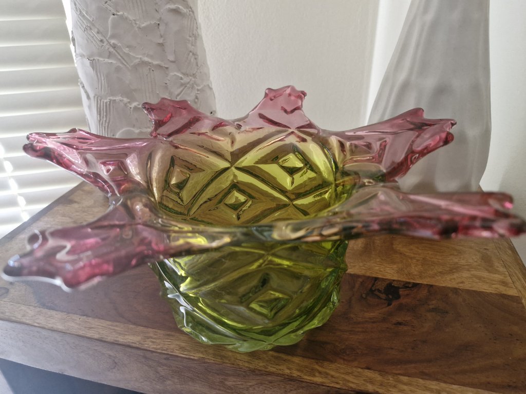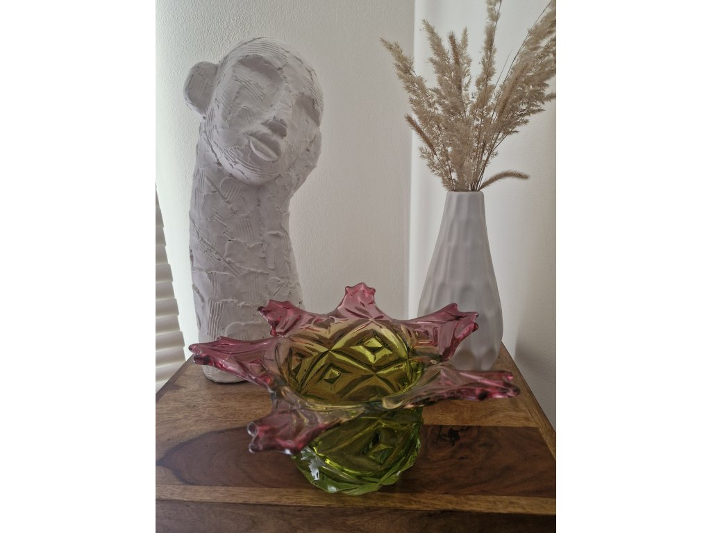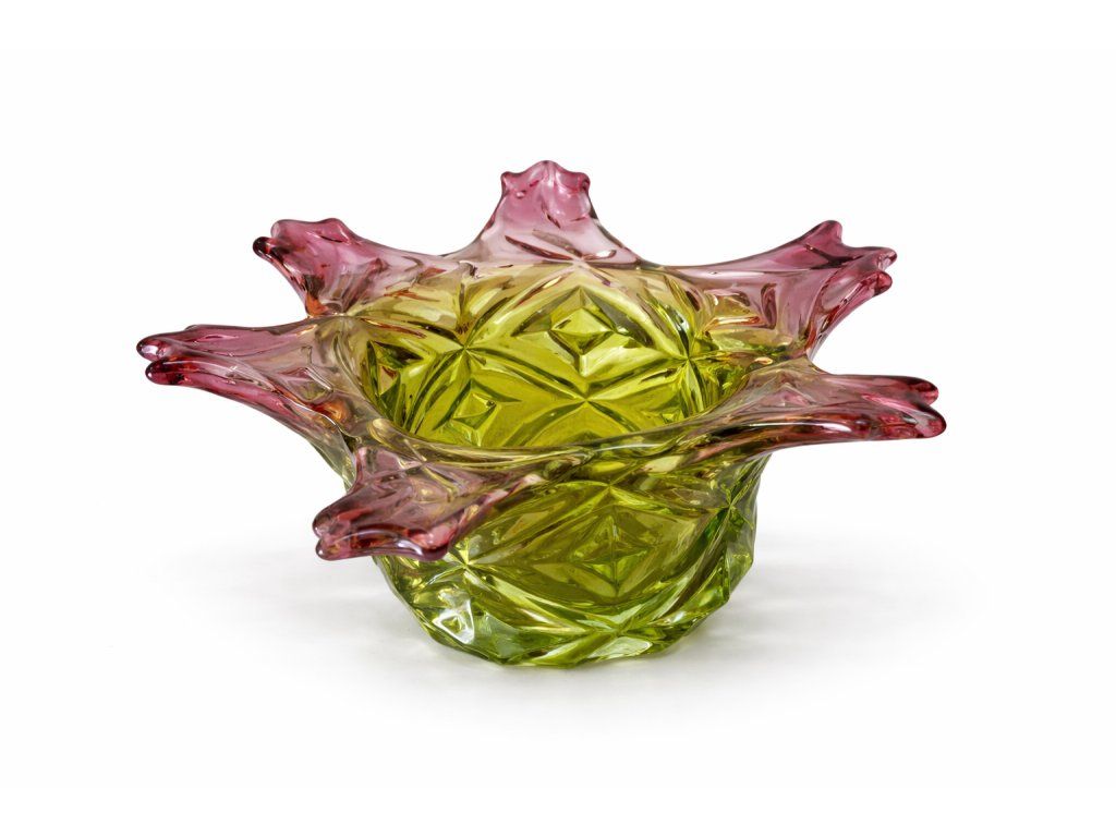 Nádherná mísa z foukaného skla v neskutečně krásné barevné kombinaci, kolekce ANANAS, autor návrhu František Koudelka, Borské sklo - Prácheň, r. 1970. Výška 13 cm, průměr 29 cm. Super stav, pouze hrany v obloučcích jsou na některých místach jemně nerovné (není to ani vidět, pouze na dotek).