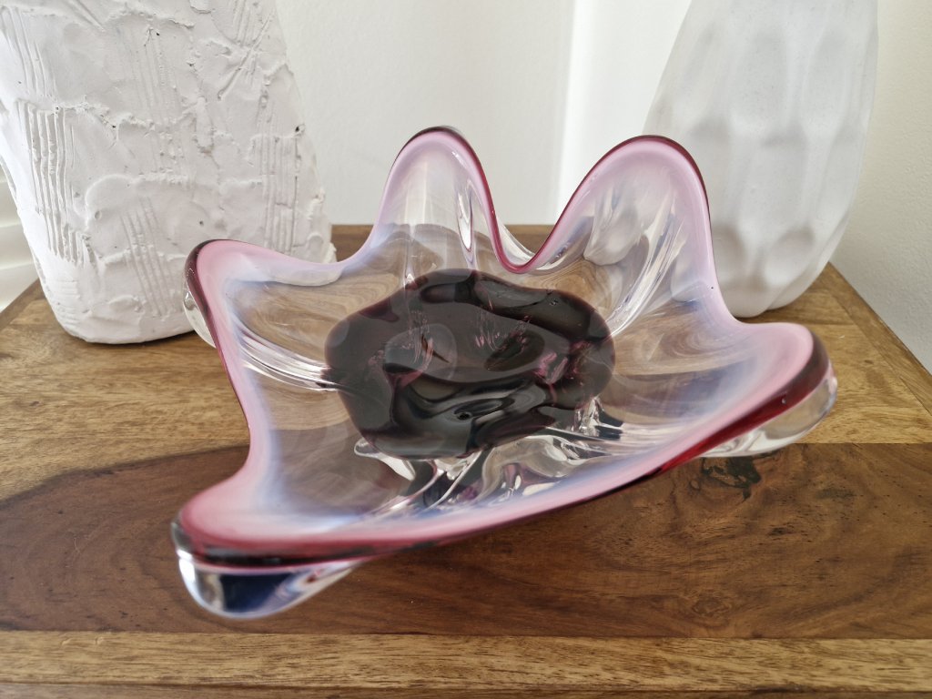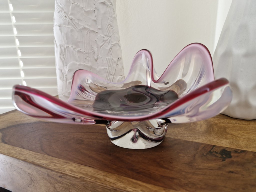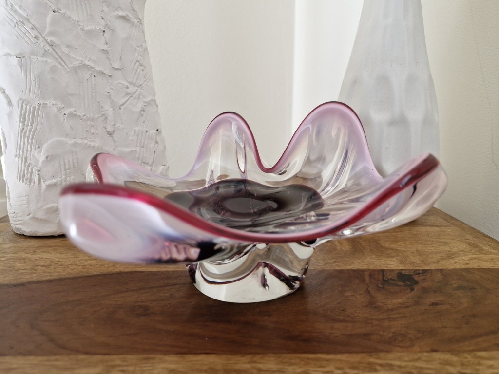 Nádherná mísa z hutního skla v luxusní barevné kombinaci. Autor návrhu Josef Hospodka, sklárna Chřibská, 60. léta 20. století. Výška 11 cm, průměr 22 cm. Top stav.