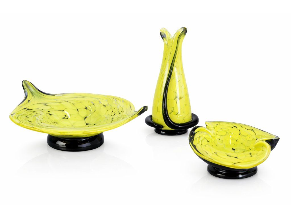 Nádherná sada z hutního skla s tmavěmodrými nálepy, sestávajúcí z vázy, mísy a menší misky. Z produkce (pravděpodobně) sklárny Crystalex Nový Bor, 2. pol. 20. století. Váza: výška 24 cm Mísa: výška 10 cm, délka 34 cm Miska: výška 7 cm, průměr 17 cm. Všechno v top stavu.