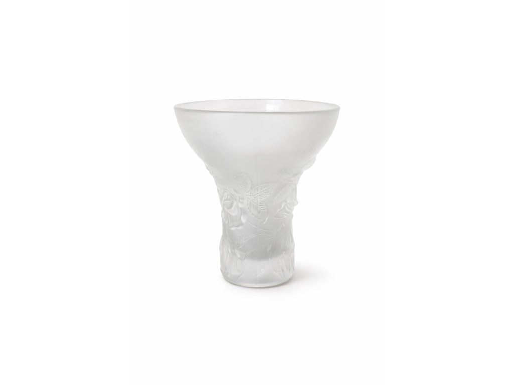 Nádherná váza Barolac z lisovaného skla v matované úpravě s krásným motivem růží po obvodu. Dle autorského návrhu Rudolfa Schrotera, sklárna Rudolfova hu´ť, před r. 1948. Výška 20 cm. S původním značením. 100% TOP stav.