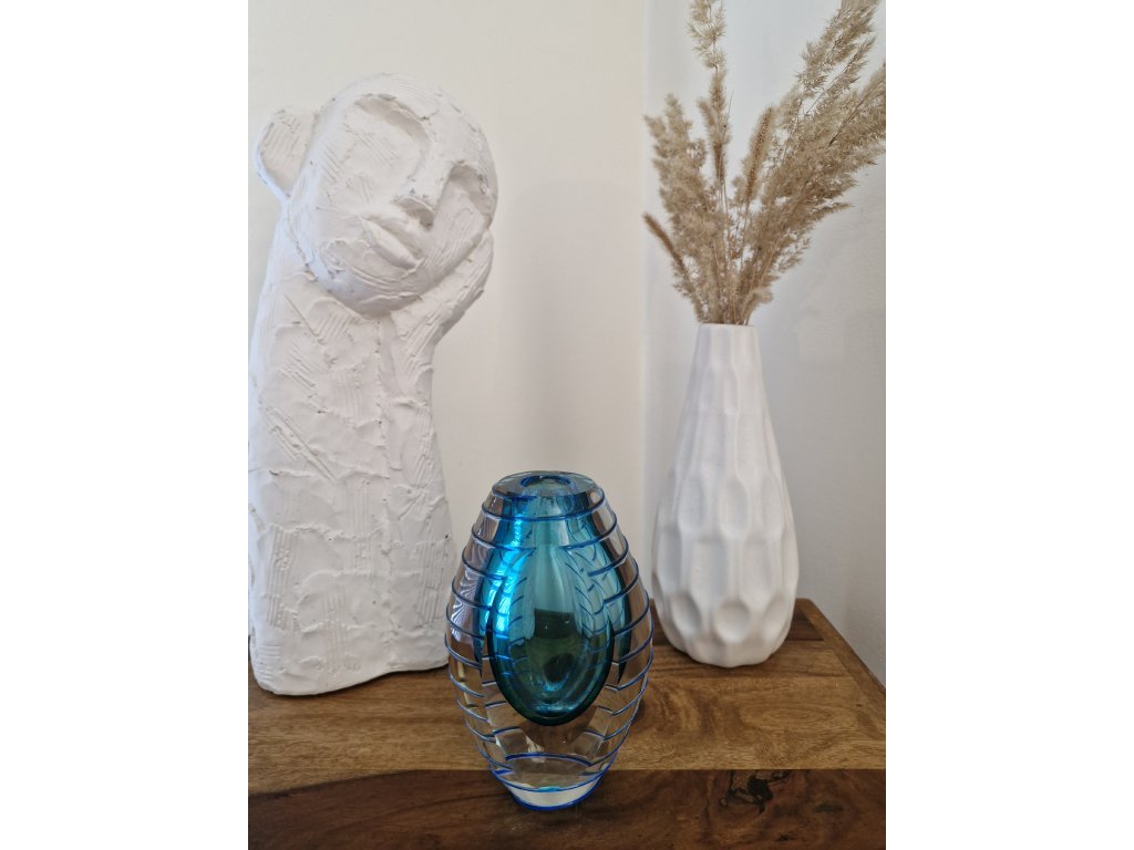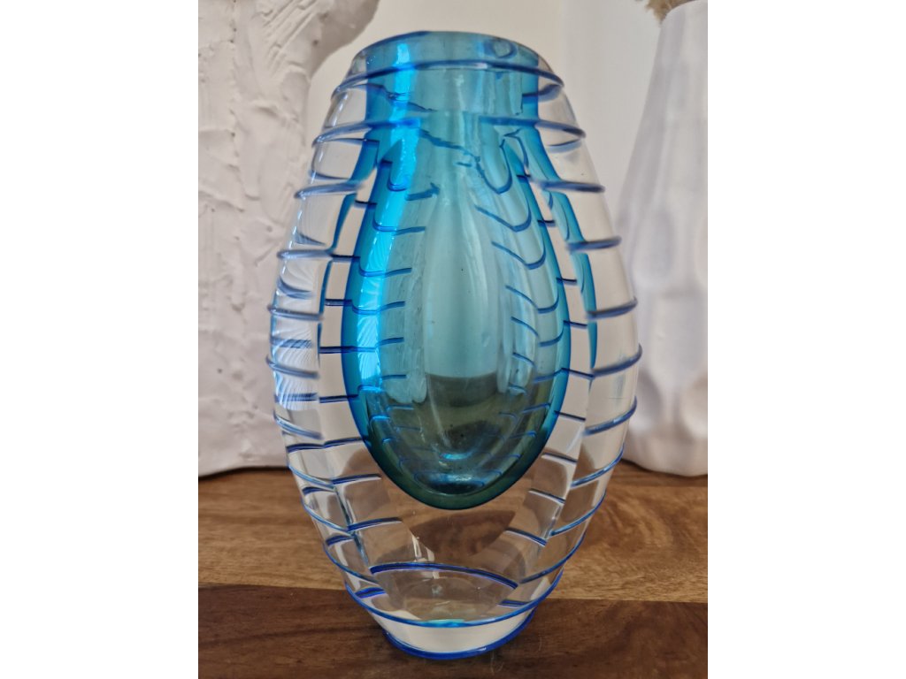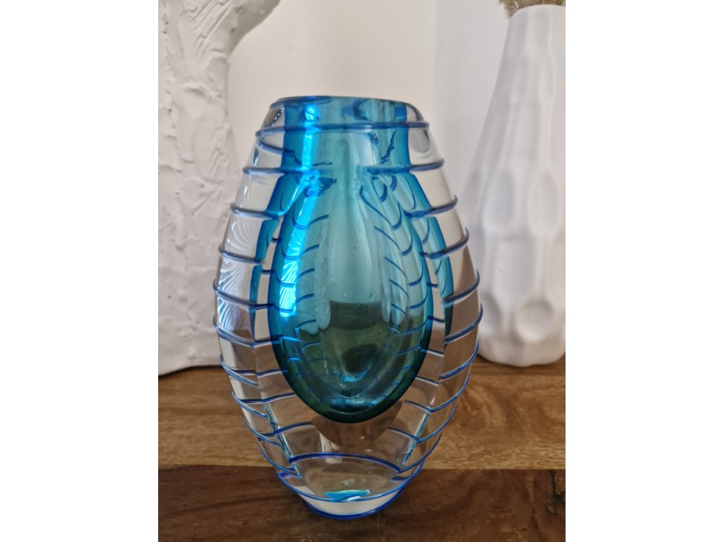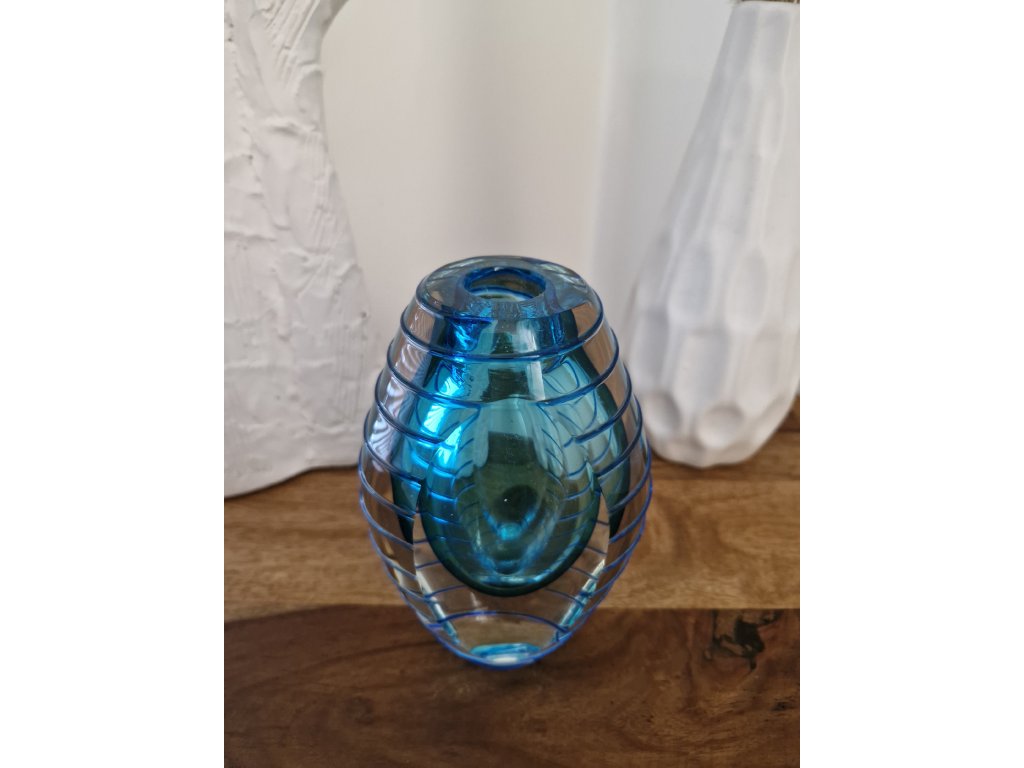 Luxusní broušená váza z vrstveného skla (sommerso) s tyrkysovým jádrem. S efektem spirály na vnější straně. Výška 16 cm. Top stav.