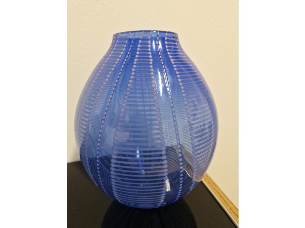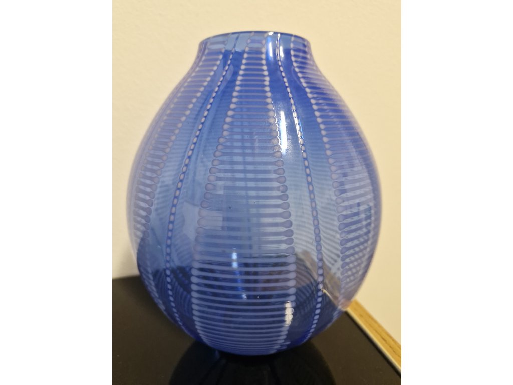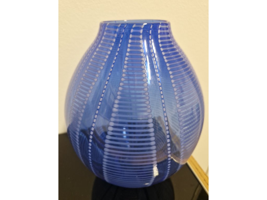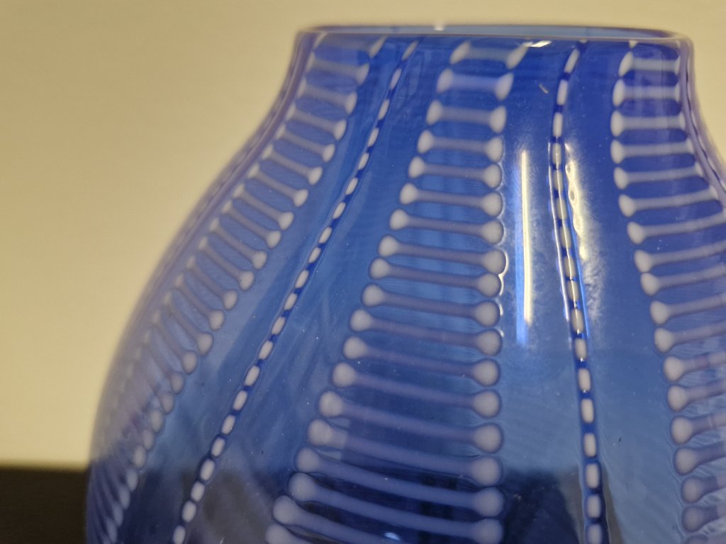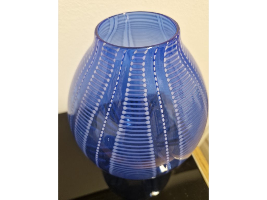 Originální váza z foukaného skla v modré barvě s bílým plastickým dekorem dle autorského návrhu Jiřího Šuhájka, sklárna Crystalex, 70. léta 20. století. Výška 25 cm. Top stav.