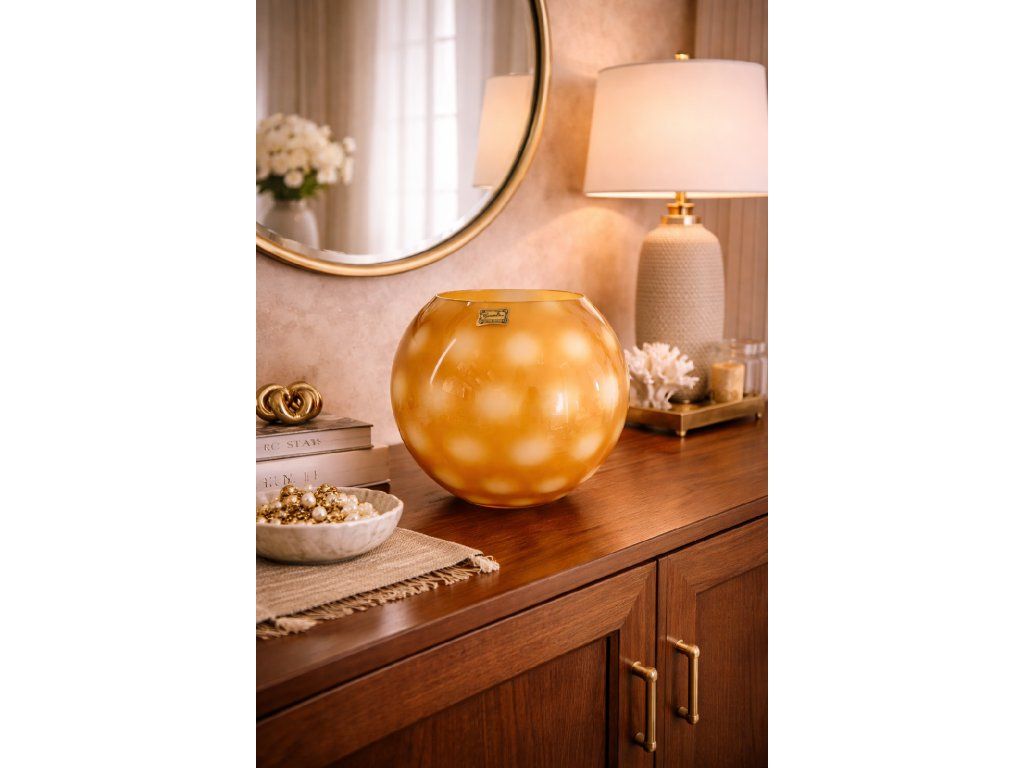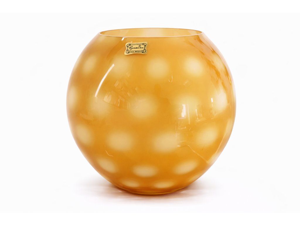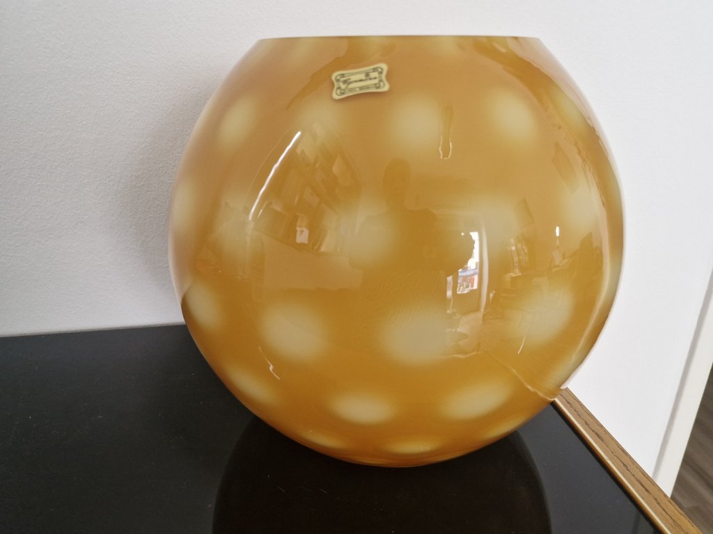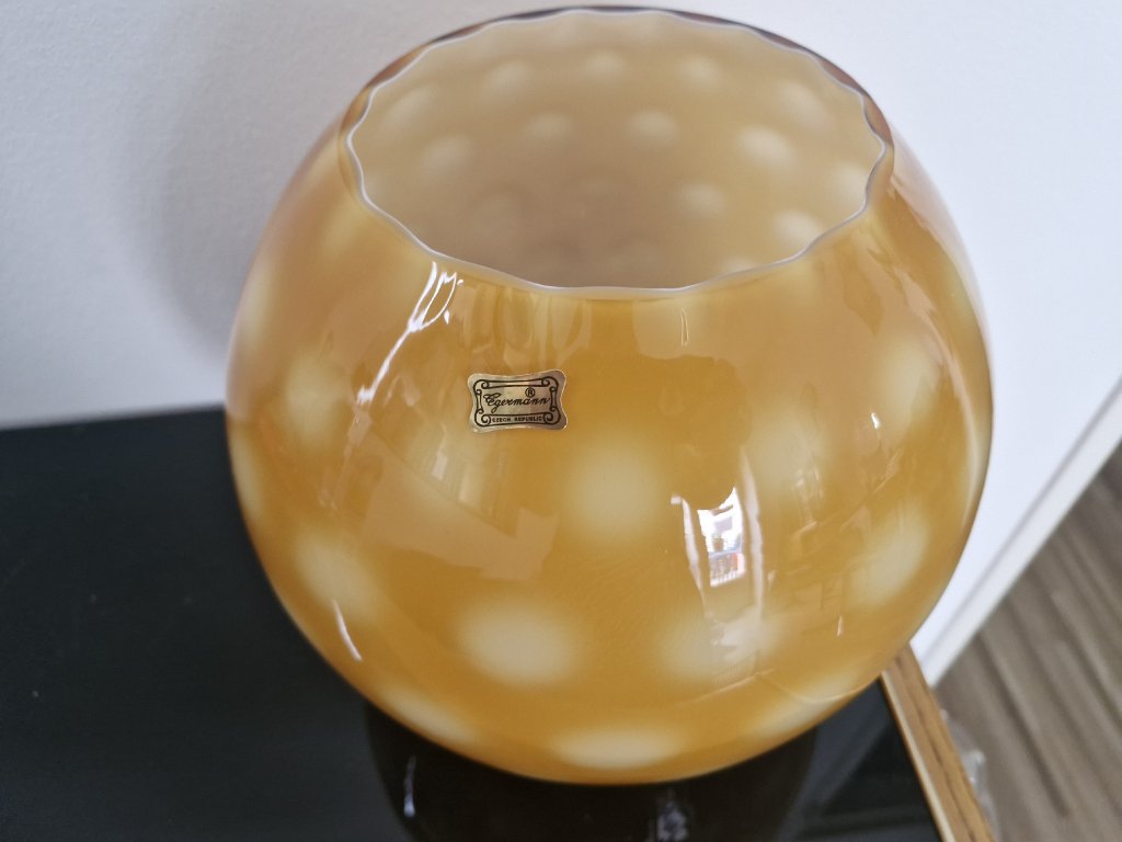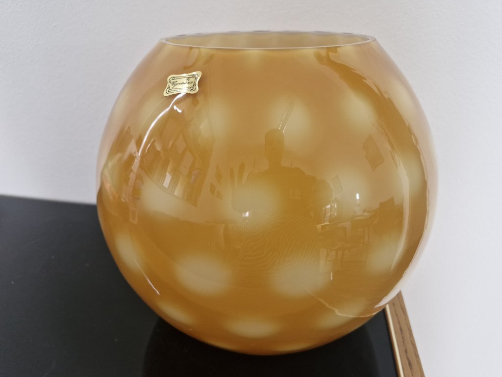 Jedinečná váza z foukaného skla s opalovým jádrem a jantarovou vnější části. Z produkce sklárny Egermann, Nový Bor, 2. pol. 20. století. Výška 25 cm, průměr 26 cm. S původní nálepkou sklárny. Top stav nového zboží. Nádherný solitér do moderního interiéru :)