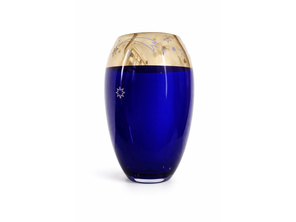 Nádherná kobaltová váza z foukaného skla se zlatým vánočním dekorem. Z produkce sklárny Crystalex Nový Bor, 70. léta 20. století. Výška 24 cm. Top stav.