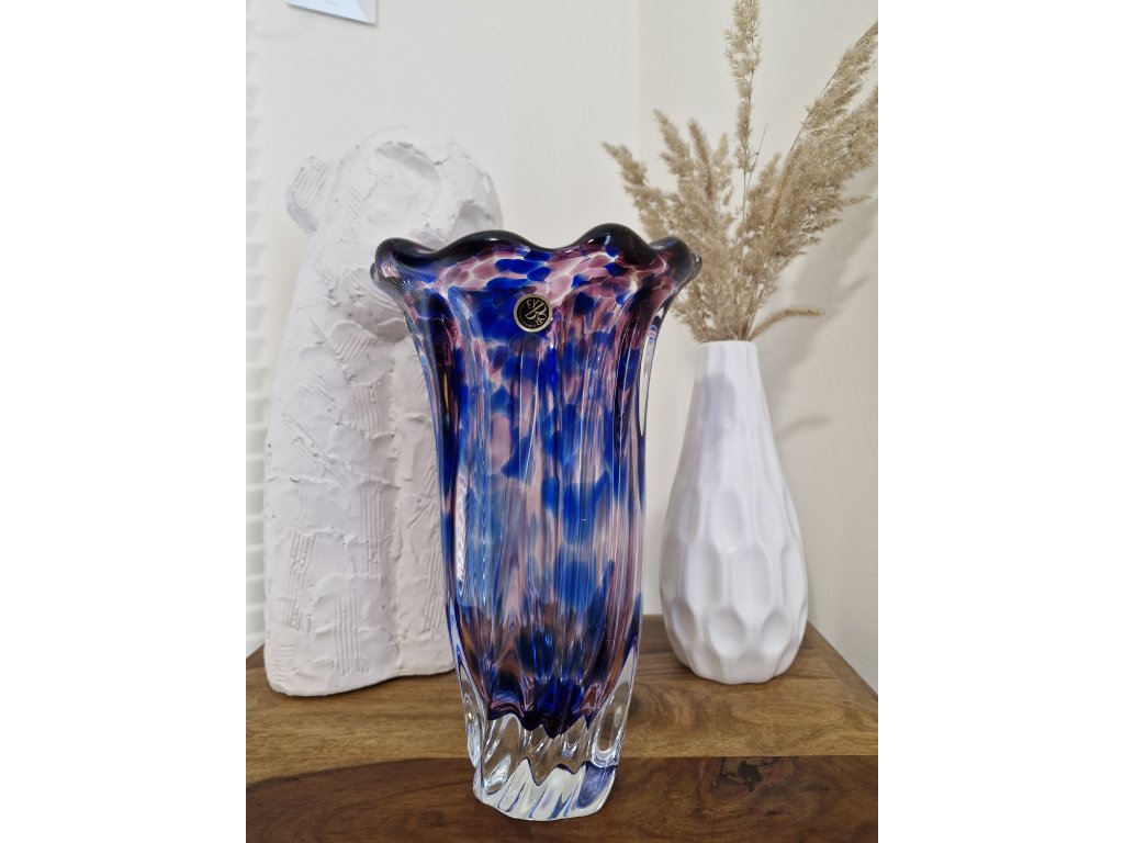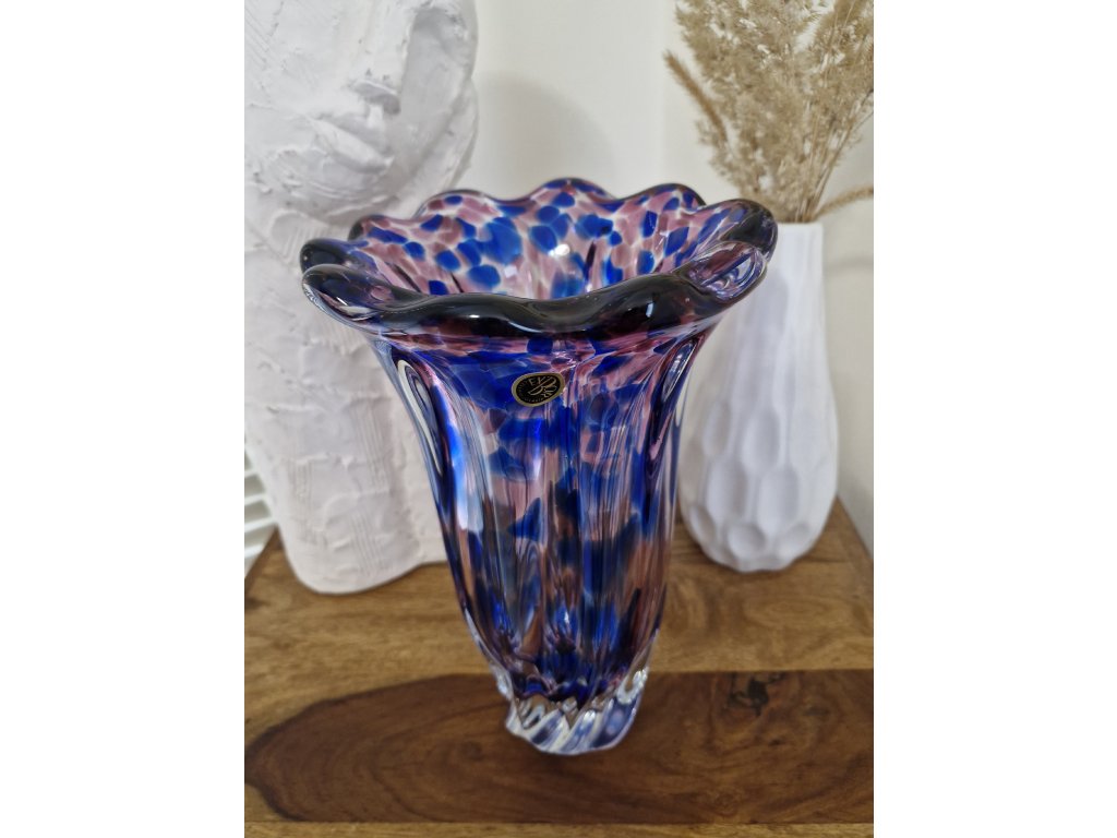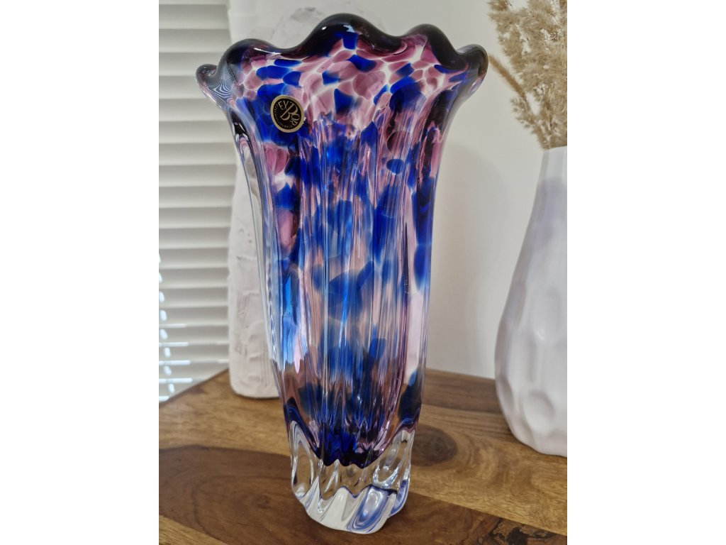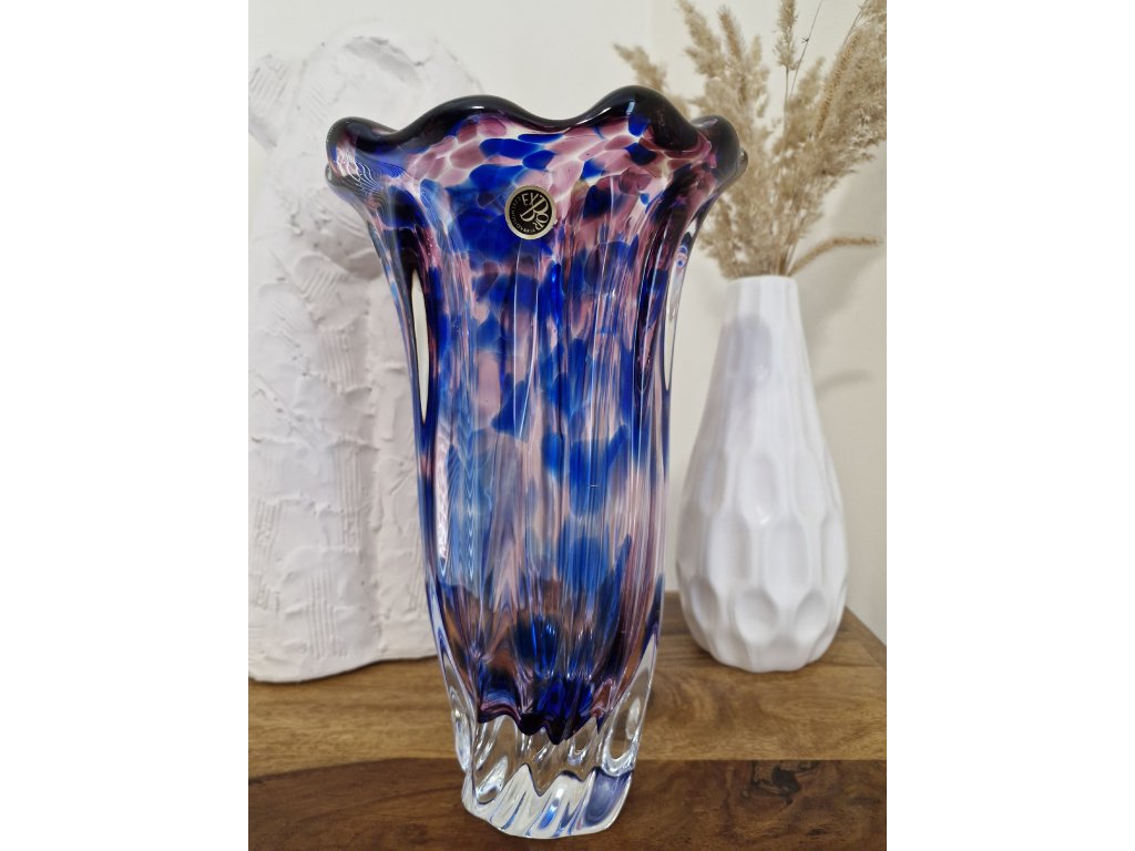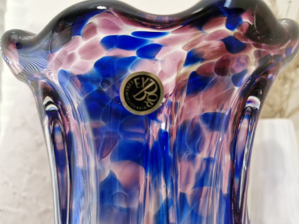 Fantastická váza z hutního skla v dokonalé barevné kombinaci růžovo modrého žihování v čiré sklovině. Z produkce sklárny Egermann/Exbor, Nový Bor, 2. pol. 20. století. Výška 27 cm. Top stav nového zboží. S původní nálepkou sklárny.