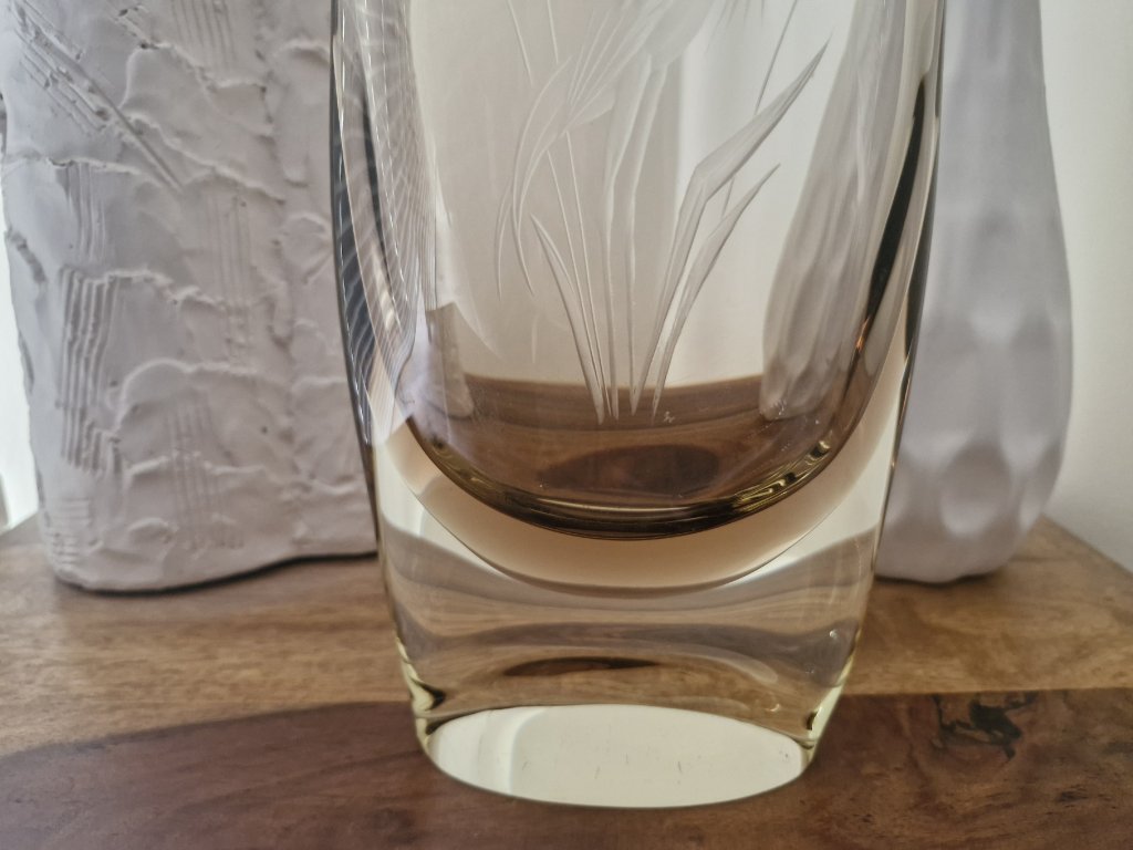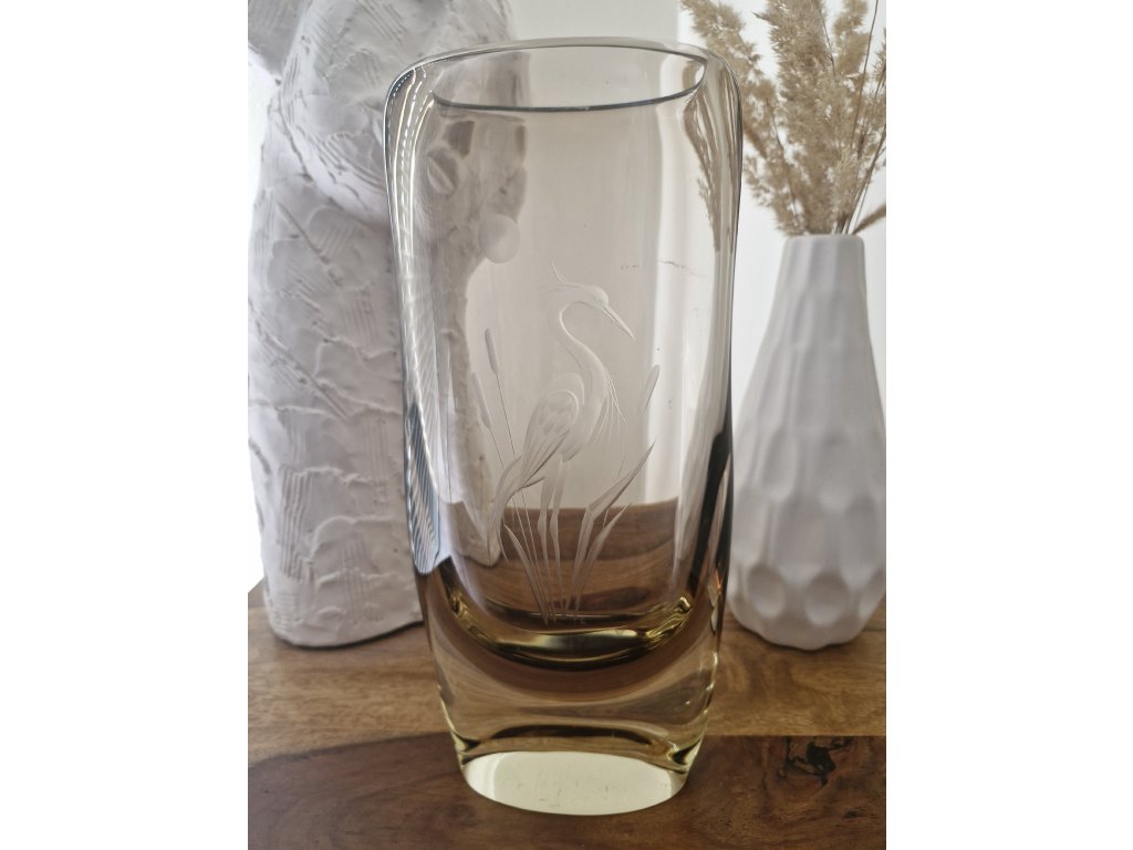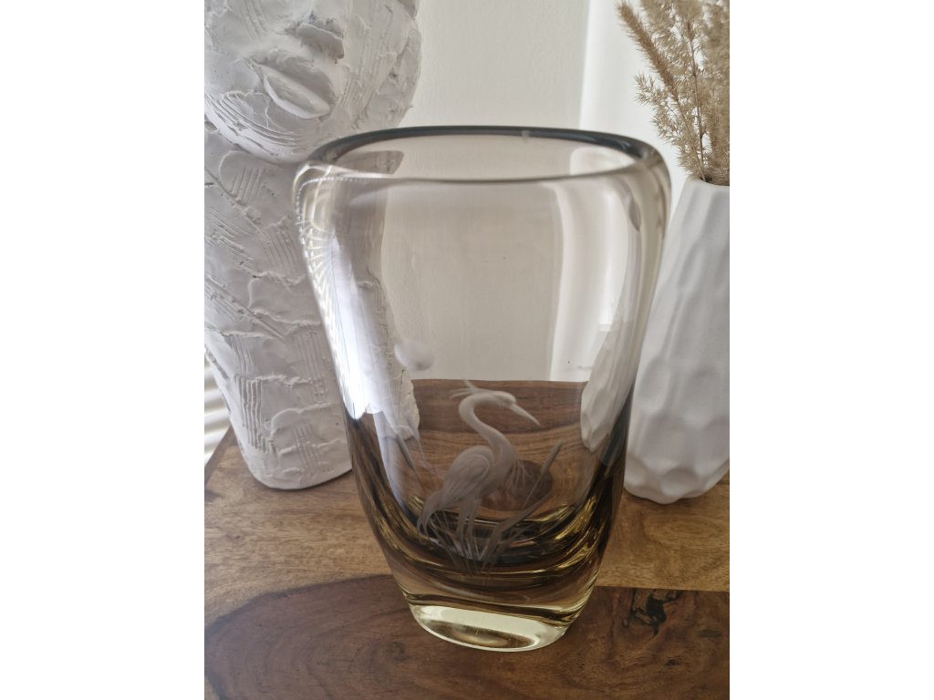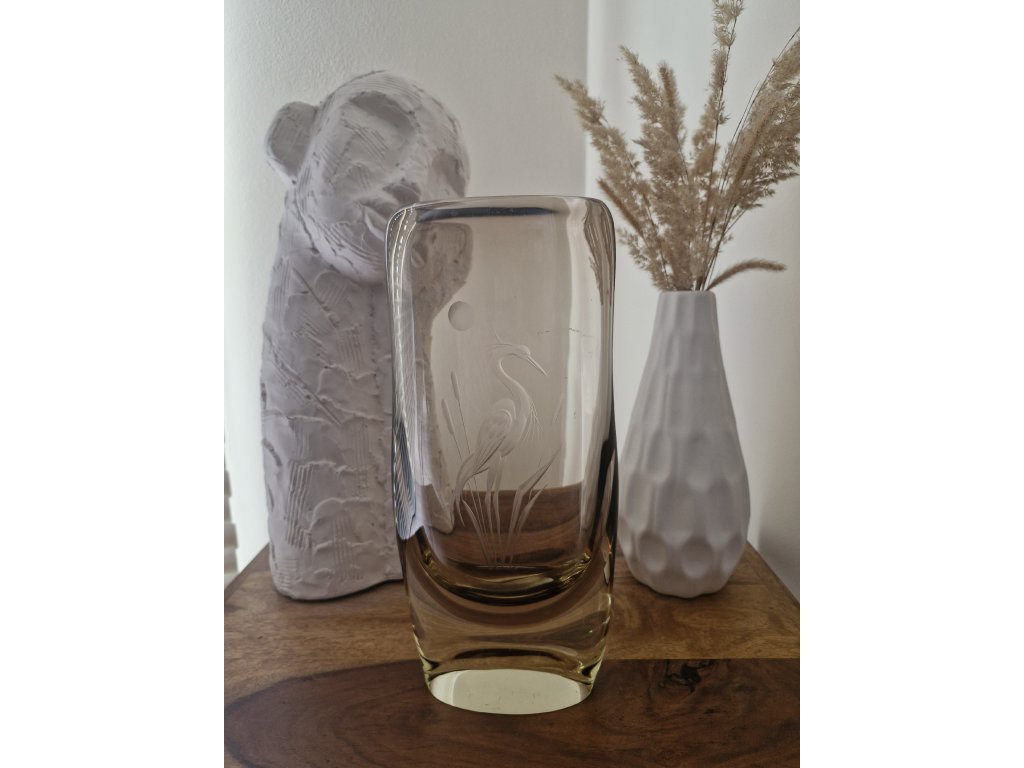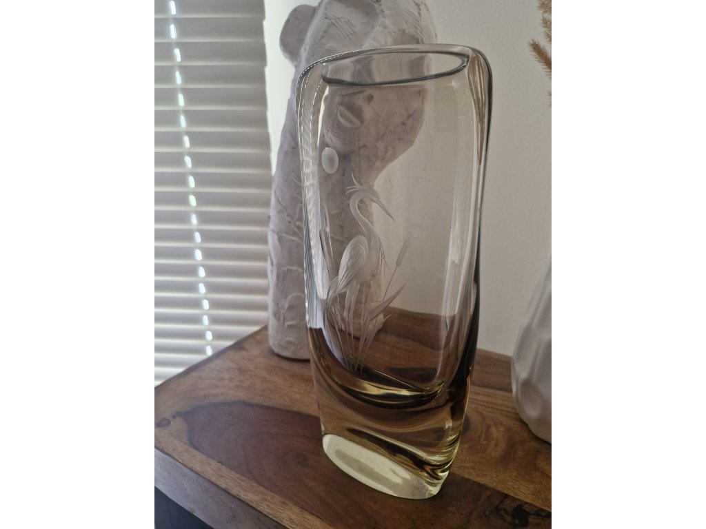 Krásná váza z hutního skla v hnědo - žluté barevné kombinaci s rytinou volavky. Autor návrhu Miloslav Klinger, sklárna ŽBS, 60. léta 20. století. Výška 29 cm. Top stav.