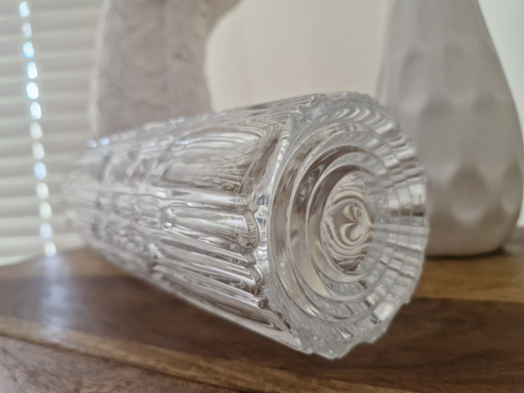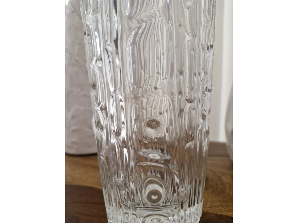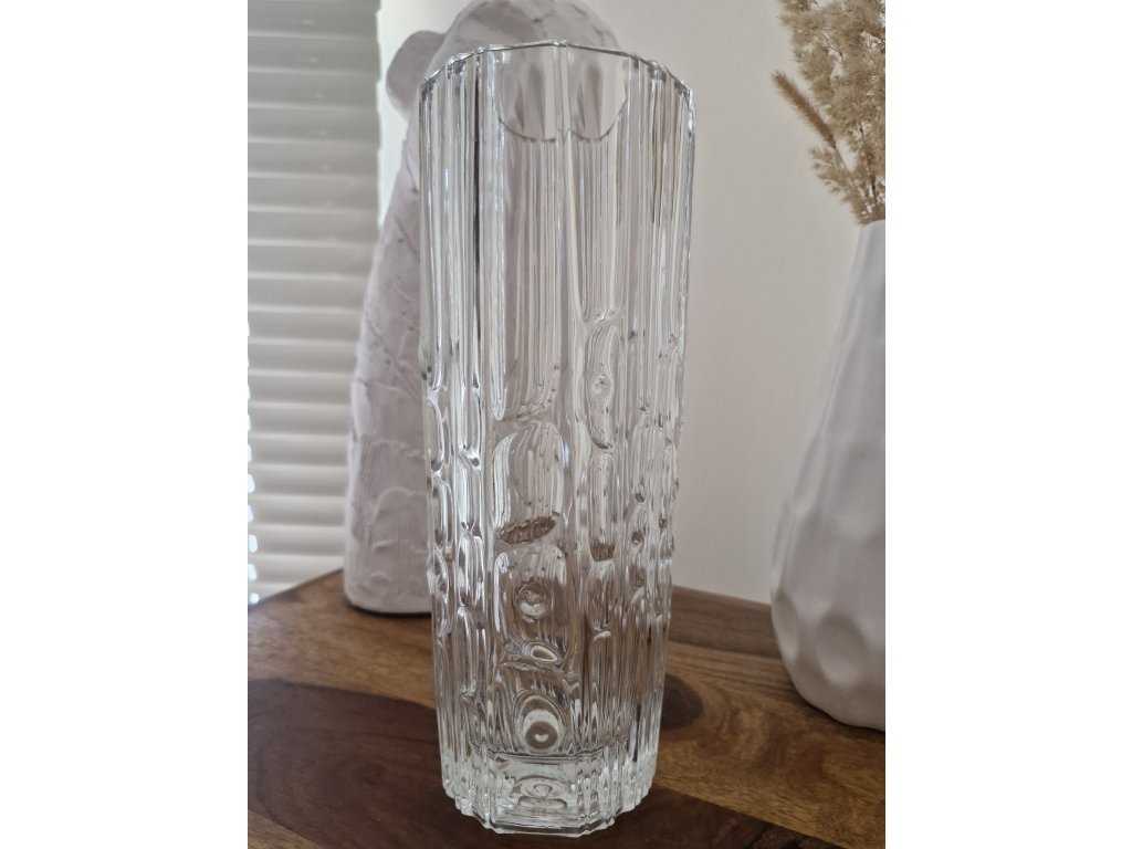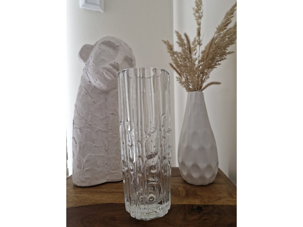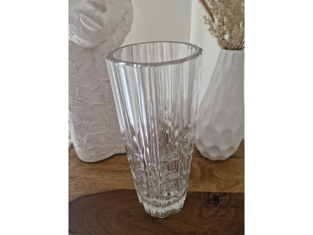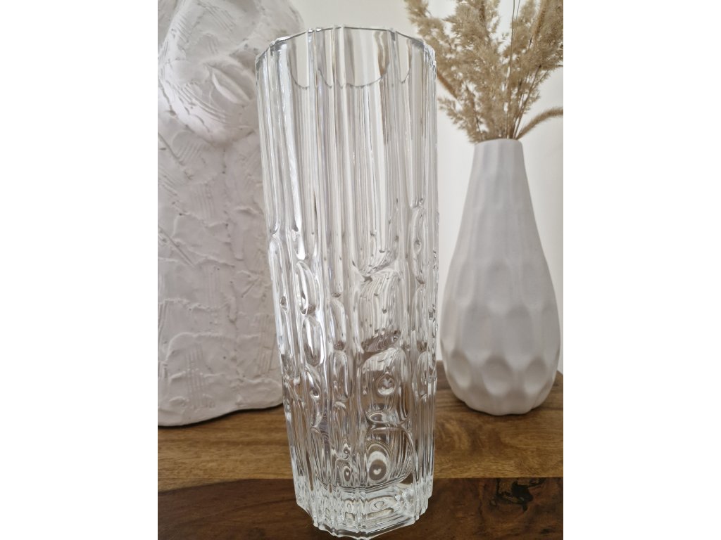 Nádherná masivní váza z lisovaného křišťálového skla zušlechtěna brusem na horní hraně. Autorský návrh Jiří Řepásek, Poděbradské sklárny, r. 1970. Výška 26 cm. Top stav.