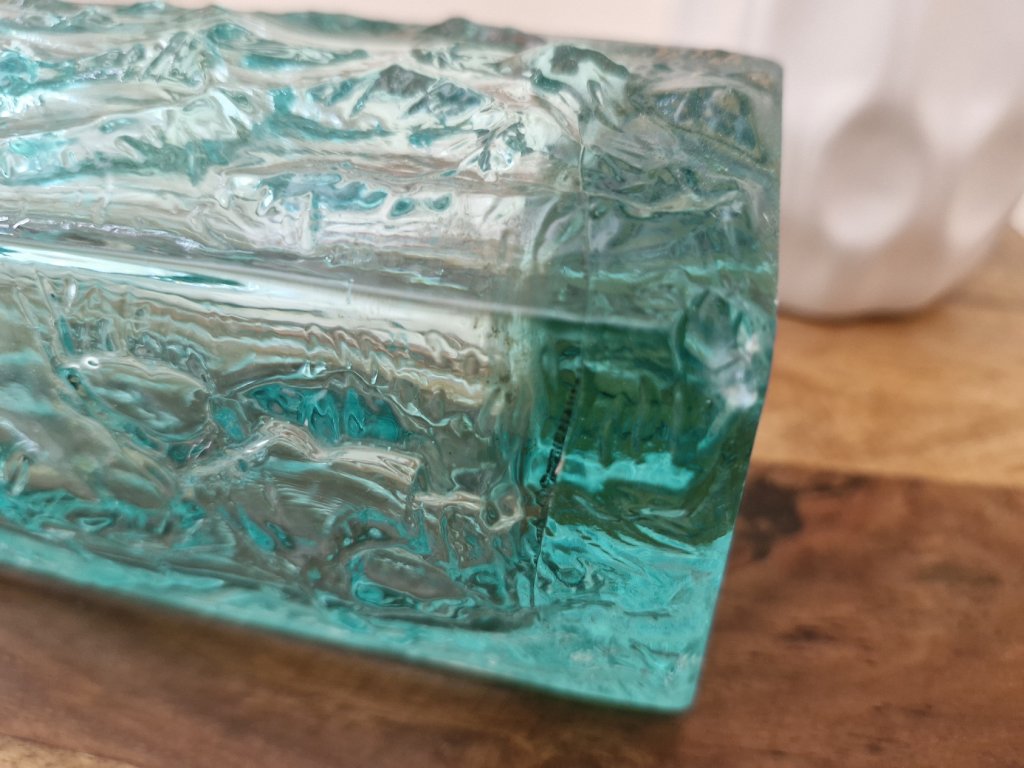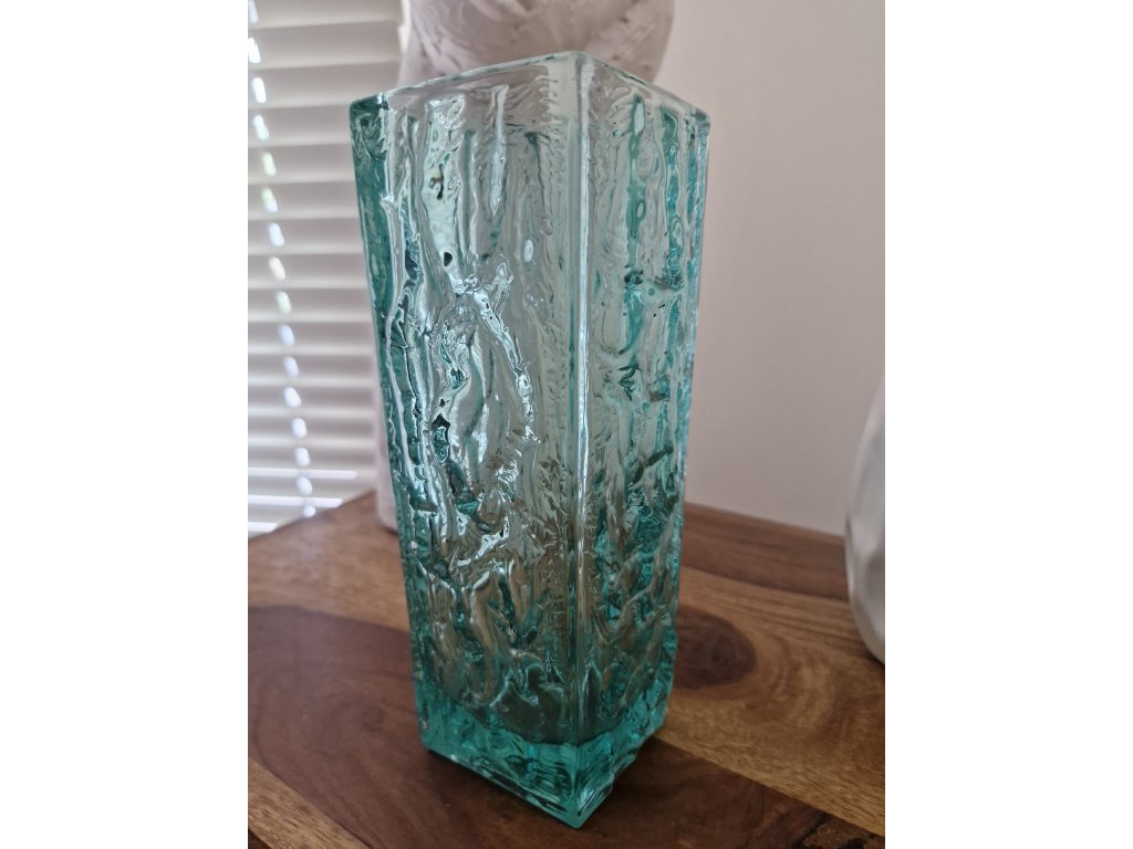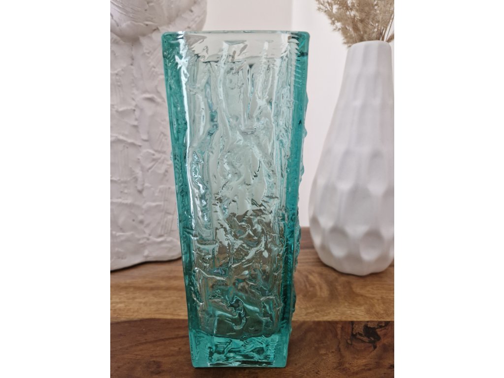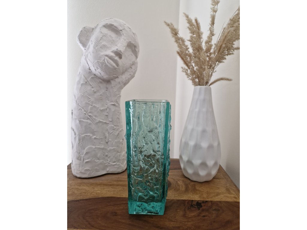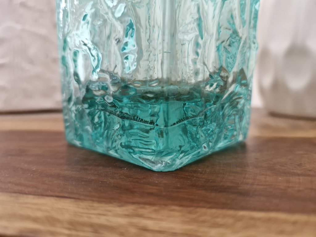 Nádherná váza z lisovaného skla z kolekce MORAVA v luxusní tyrkysové barvě. Autorský návrh Vladislav Urban, sklárna Rosice, r. 1968. Výška 21 cm. Na jedné spodní hraně podsttavy oťuk (ztrácí se ve vzoru, není to nič hrozného)- Tmavá vlásečnice ve spodní části vázy je součásti lisu, není to prasklé.