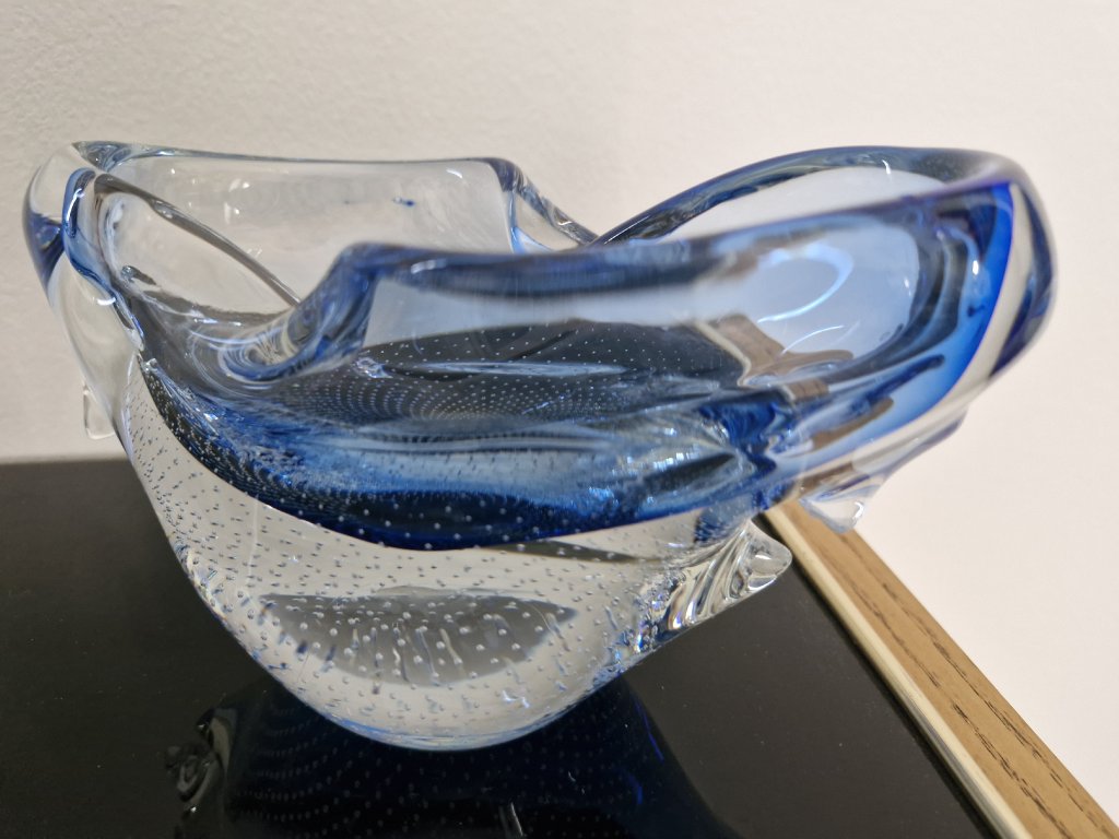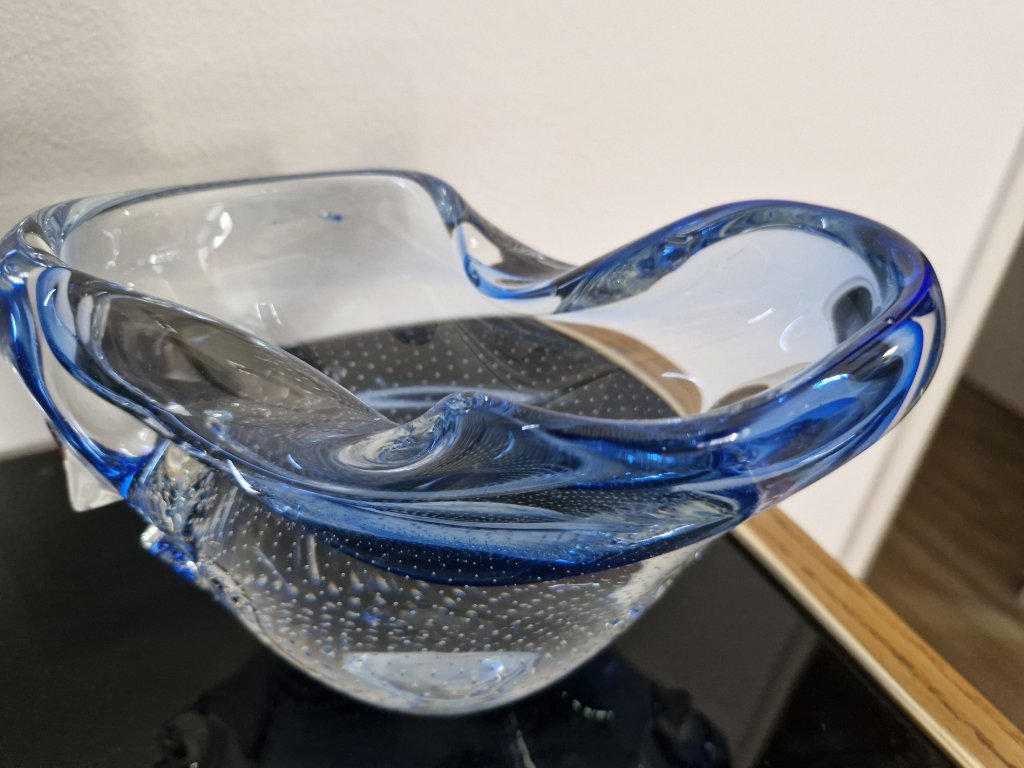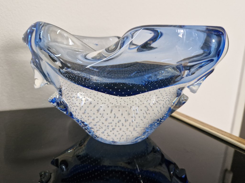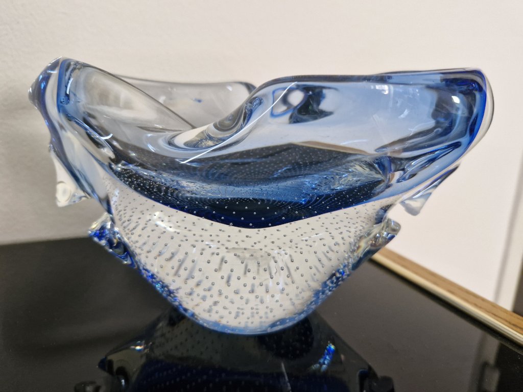Nádherná vzácná žardinka z hutního skla s dekorem řízených bublinek dle autorského návrhu Miloslava Šubrta, Borské sklo, 70. léta 20. století. Výška 10 cm, délka 19 cm. Top stav.