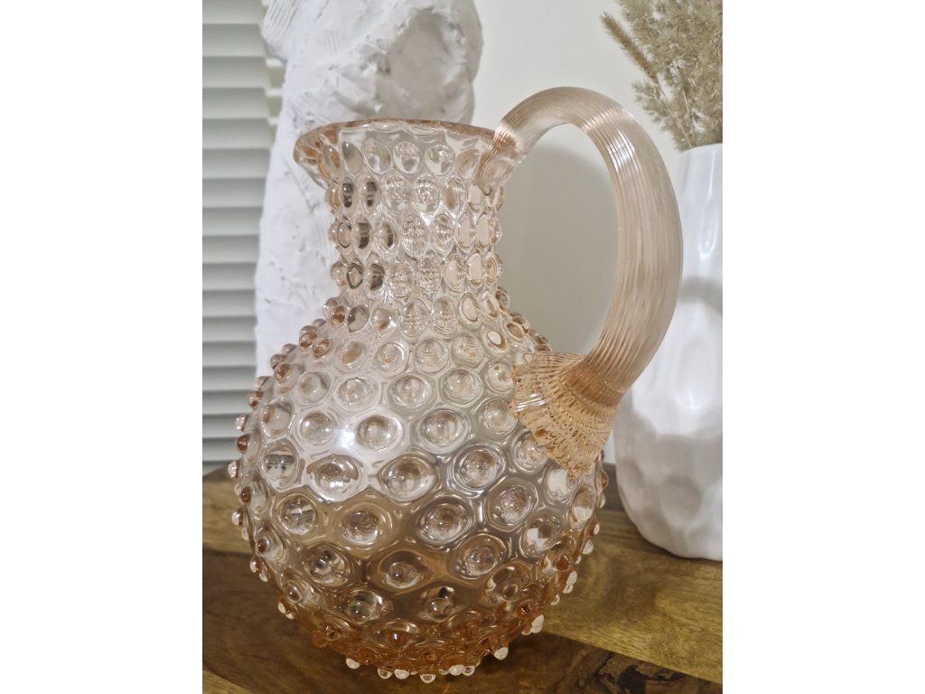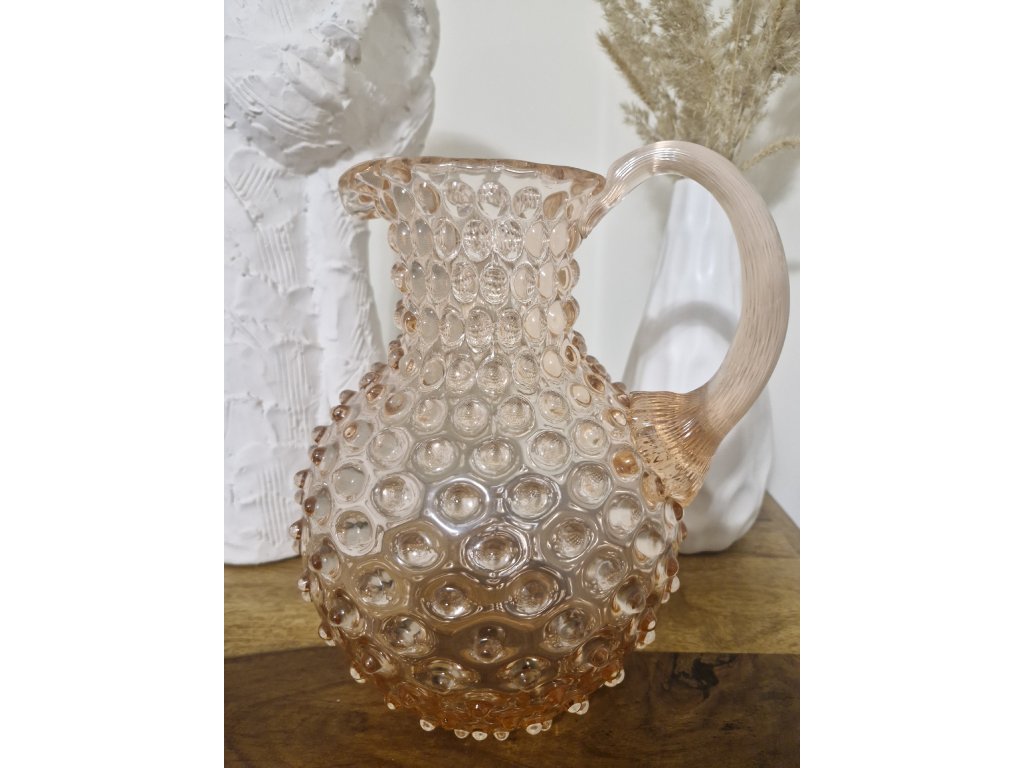 Nádhený džbán z foukaného a litého skla "HOBNAIL" v krásné pudrově růžové barvě z produkce sklárny Jílek, Kamenický Šenov. Výška 24 cm. TOP stav.