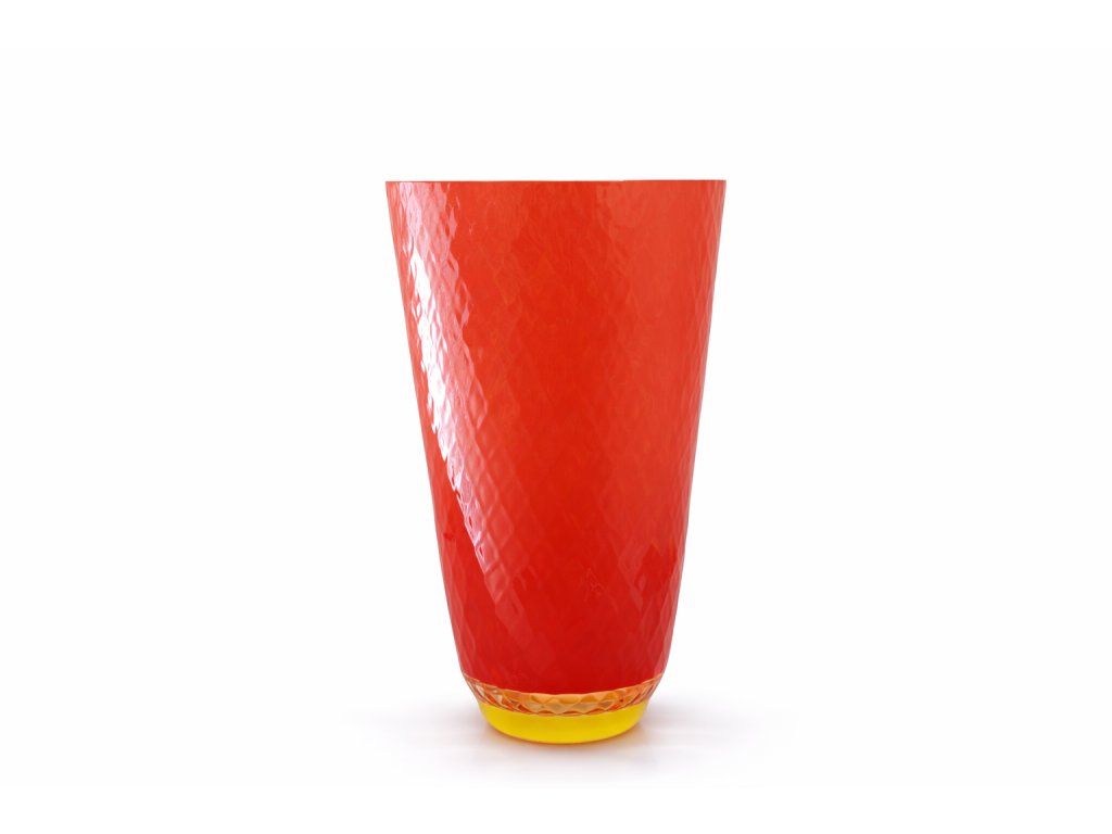 Nádherná oranžová váza z foukaného skla na žluté podstavě s diagonálním šrafováním. Autorský návrh Aleš Valner, sklárna Art Glass PRINC, Žďár nad Sázavou, 90. léta 20. století. Výška 22 cm. Top stav.
