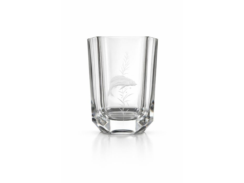 Krásná masivní hranovaná váza z broušeného skla s rytinou rybky a morských rostlin. Rytina je velmi hezká, detailní, kvalitní práce, opatřena monogramem LJ 83. Výška 17 cm, šířka 12 cm. Top stav.