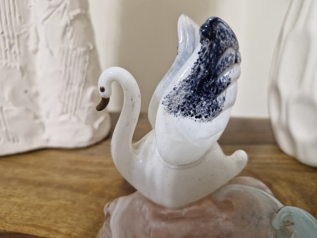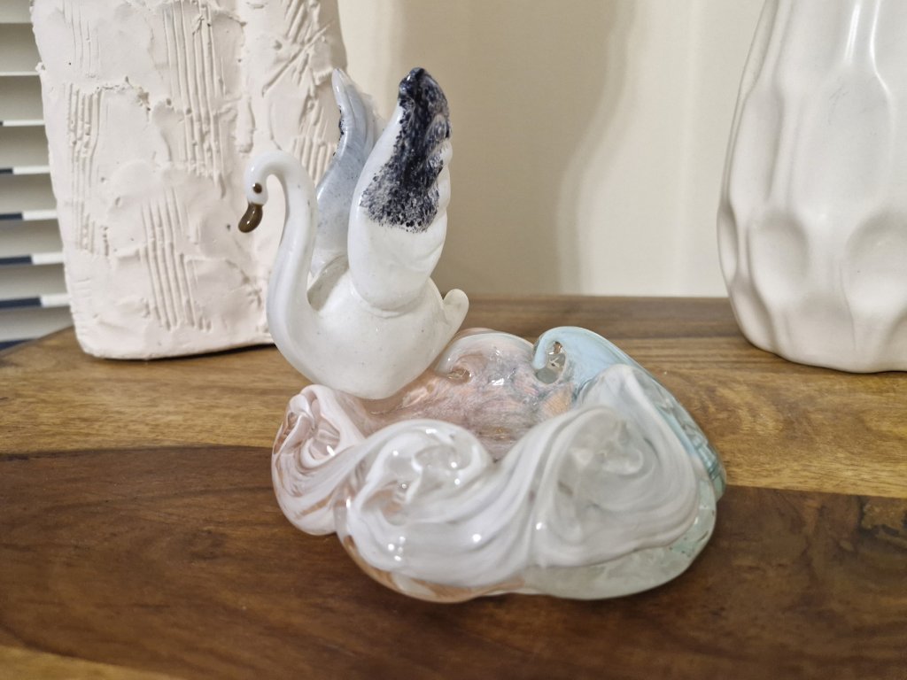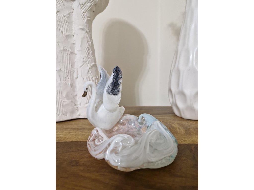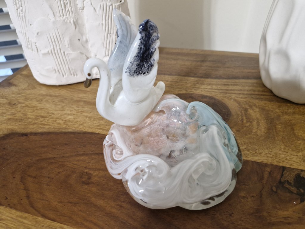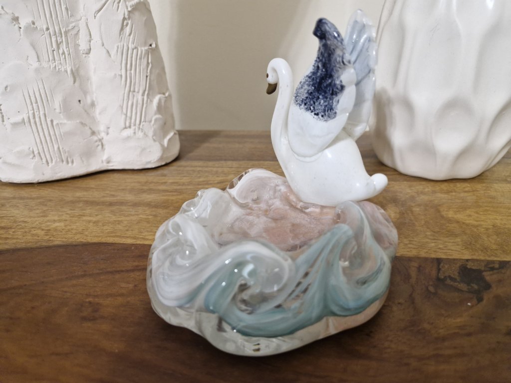 Nádherná skleněná miska s labutí dle autorského návrhu Jaroslava Brychty, sklárna ŽBS, 60. léta 20. století. Výška 11 cm, šířka 12 cm. Top sběratelský stav.