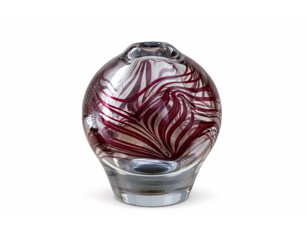 Výjimečná váza z hutního skla v krásné jemně modré barvě skloviny s bordovým dekorem pásů. Autor návrhu Ivo Rozsypal, Borské sklo, 70. léta 20. století. Výška 15 cm. Top stav.