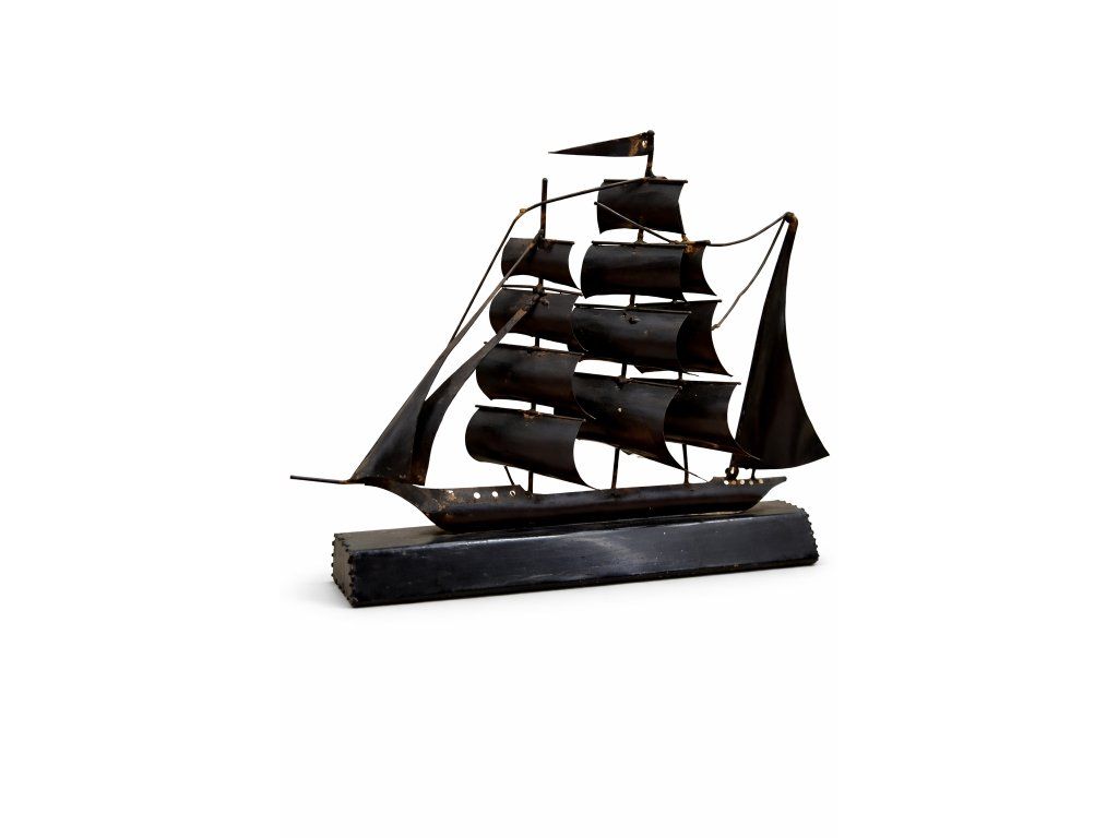 Krásný detailně propracovaný plechový model plachetnice. Výška 24 cm. délka 34 cm. Vynikající původní stav.
