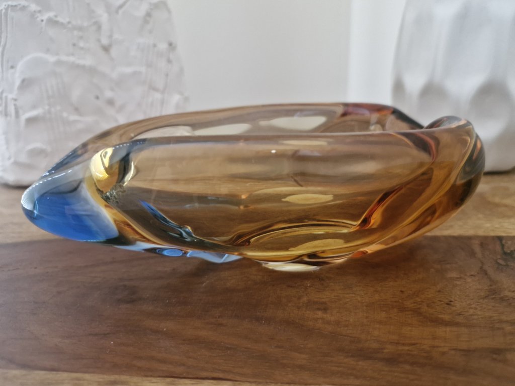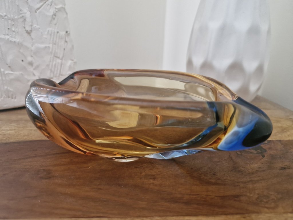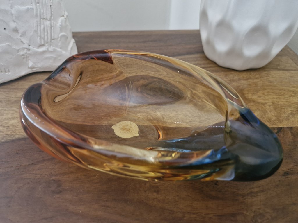 Málo vídaný popelník ve tvaru listu z hutního skla z kolekce ROMANA, dizajnérky Hany Machovské, sklárna Moser, Karlovy Vary, r. 1960. Výška 6 cm, délka 18 cm. Na podstavě původní nálepka sklárny.TOP stav, pouze na podstavě několik jemných škrábanečků.