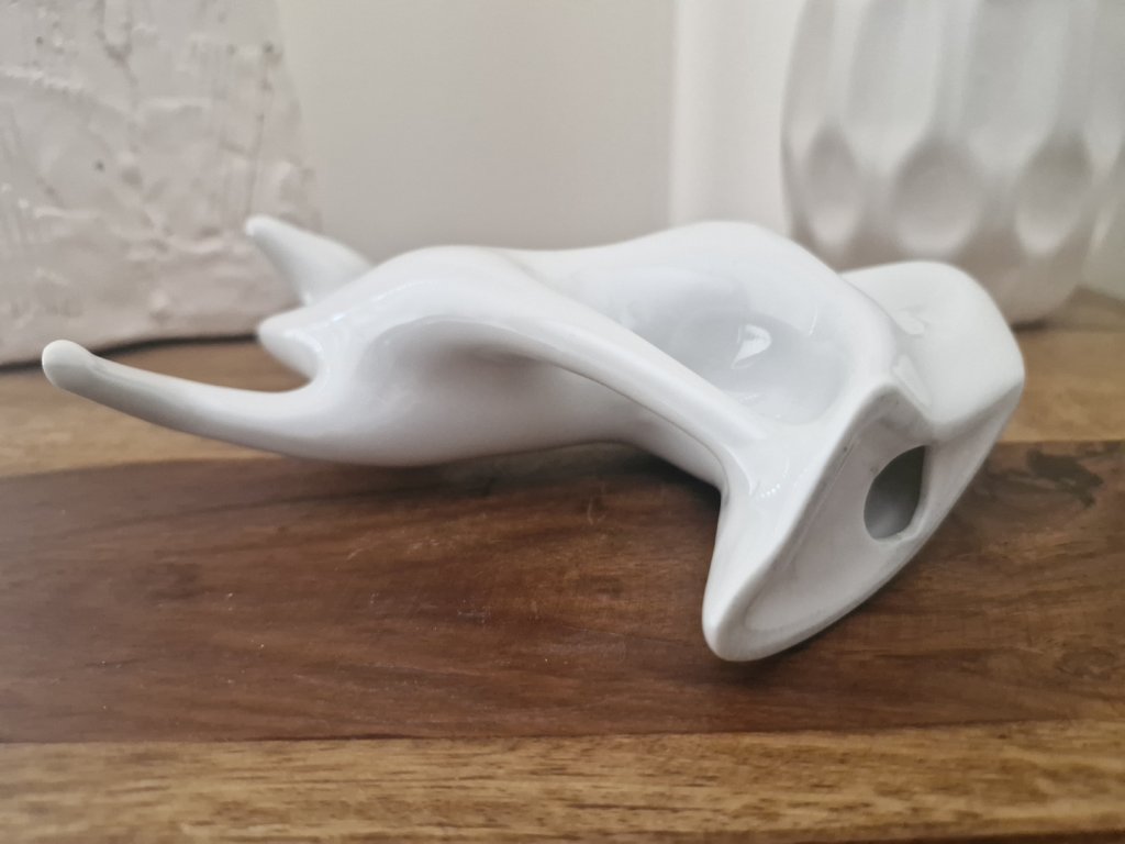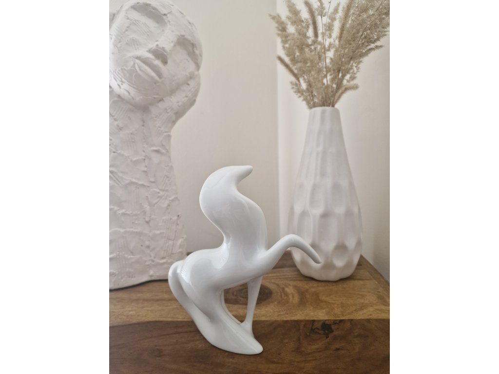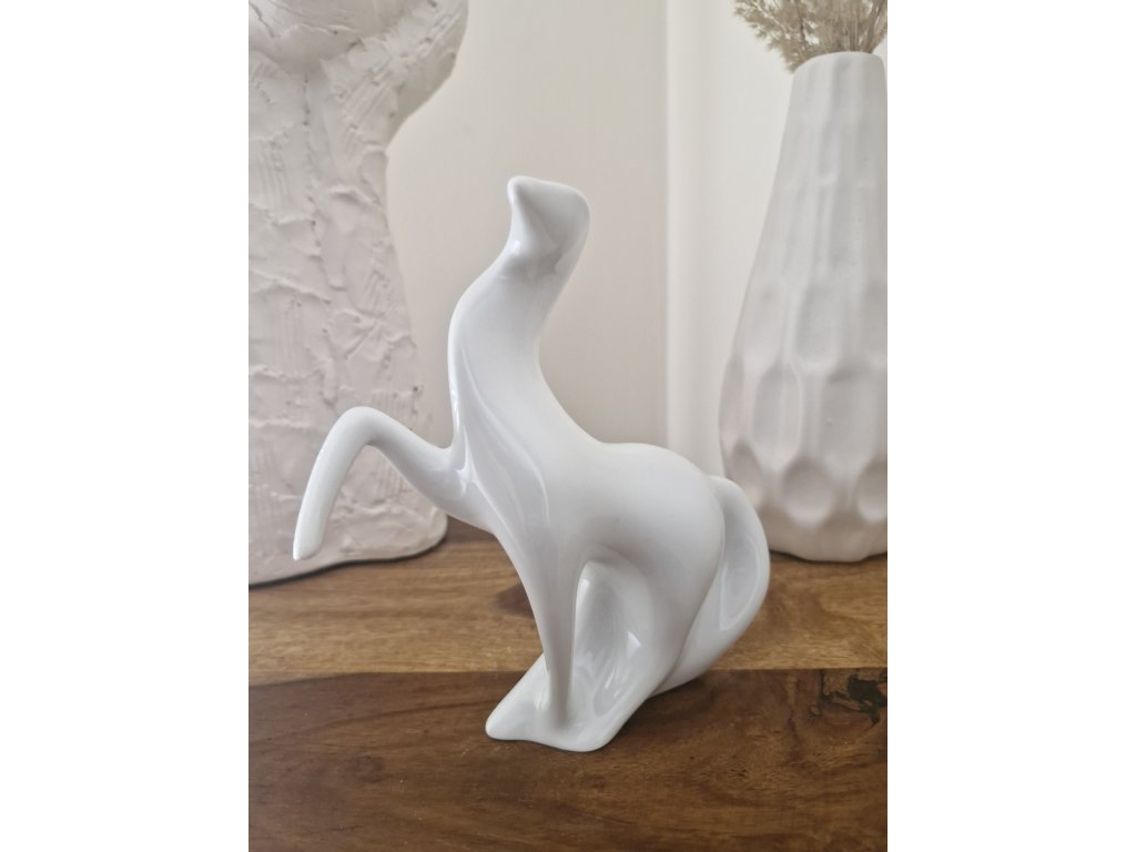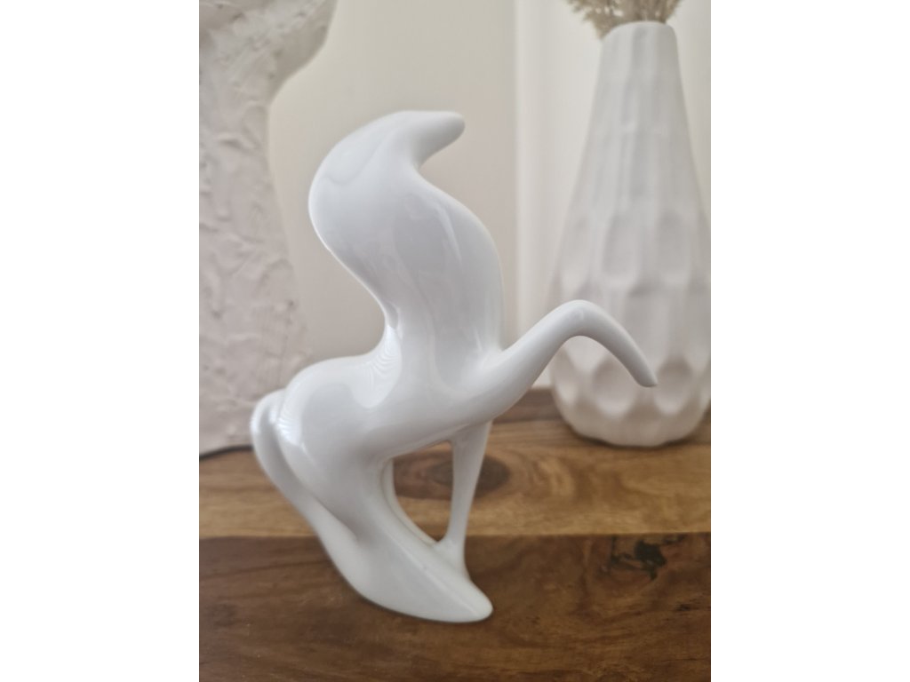 Levotočivý hřebeček z bílého glazovaného porcelánu z kultovní série tří porcelánových plastik Klisnička a hřebečkové, které patří mezi nejznámější a nejlepší práce významného československého designéra Jaroslava Ježka (1923-2002). Figurky byly vystaveny v roce 1958 na Světové výstavě EXPO 58 v Bruselu a získaly prestižní Zlatou medaili. Z produkce Royal Dux