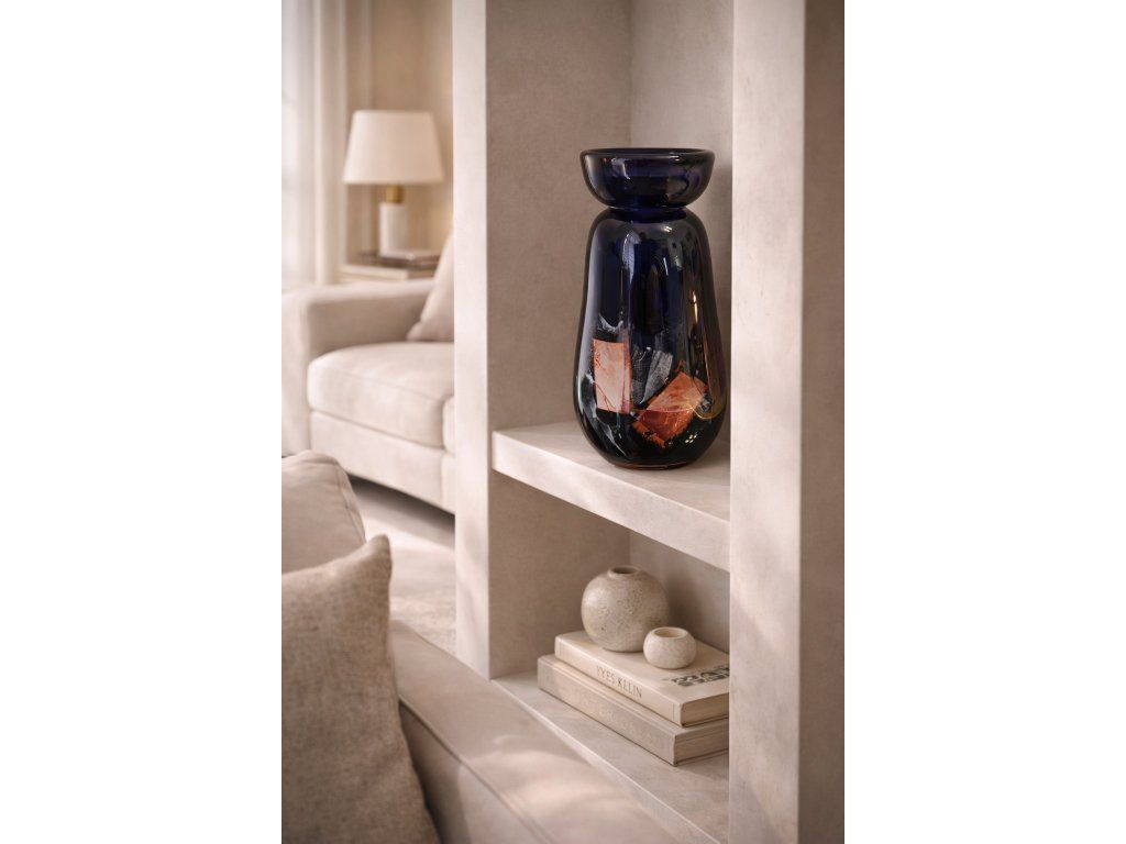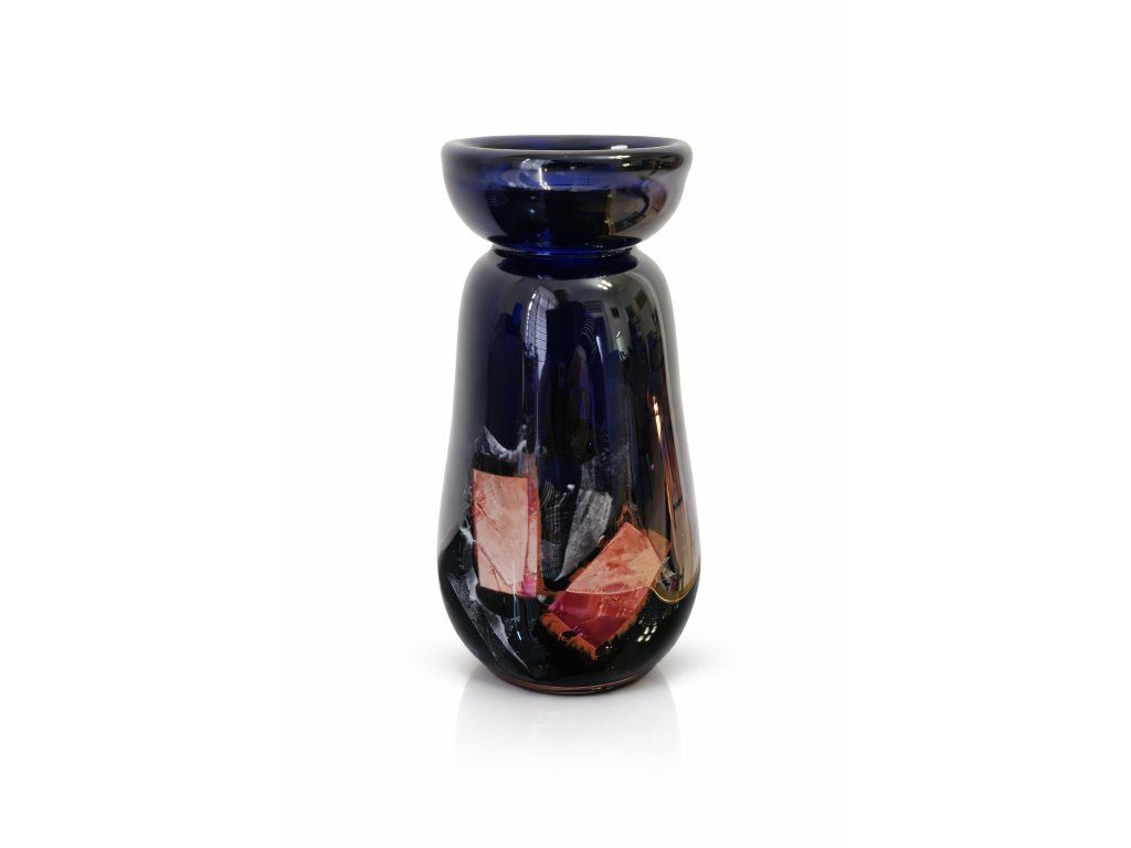 Nádherná vzácná váza z hutního skla s kovovou zataveninou dle autorského návrhu prof. Jaromíra Špačka, sklárna Crystalex, Nový Bor, 60. léta 20. století. Jedná se o opravdu výjimečný kus. Prof. Špaček vynalezl a zdokonalil metodu kovových zatavenin ve sklovině. Výška 21 cm. 100% TOP stav.