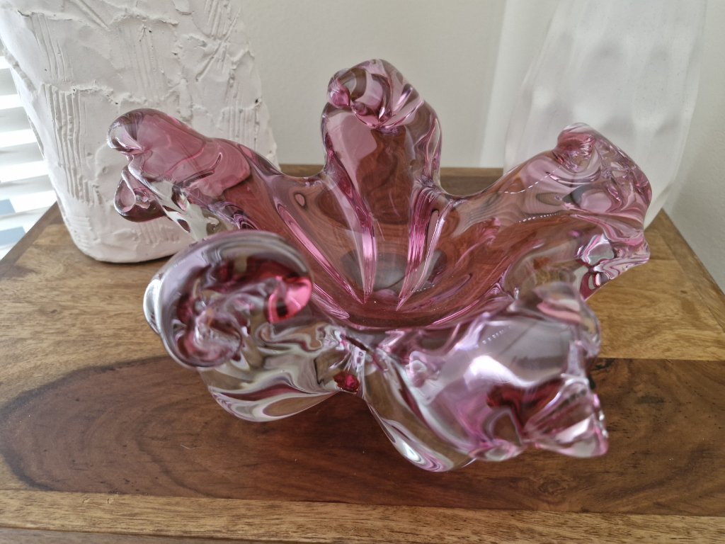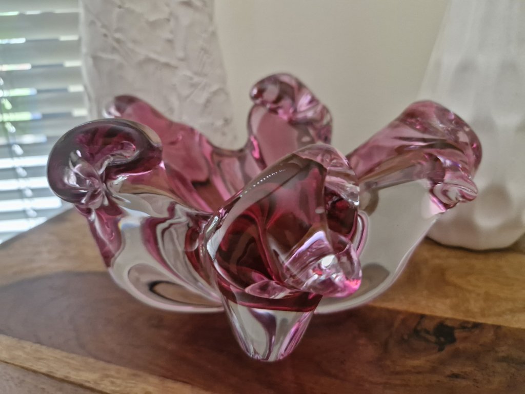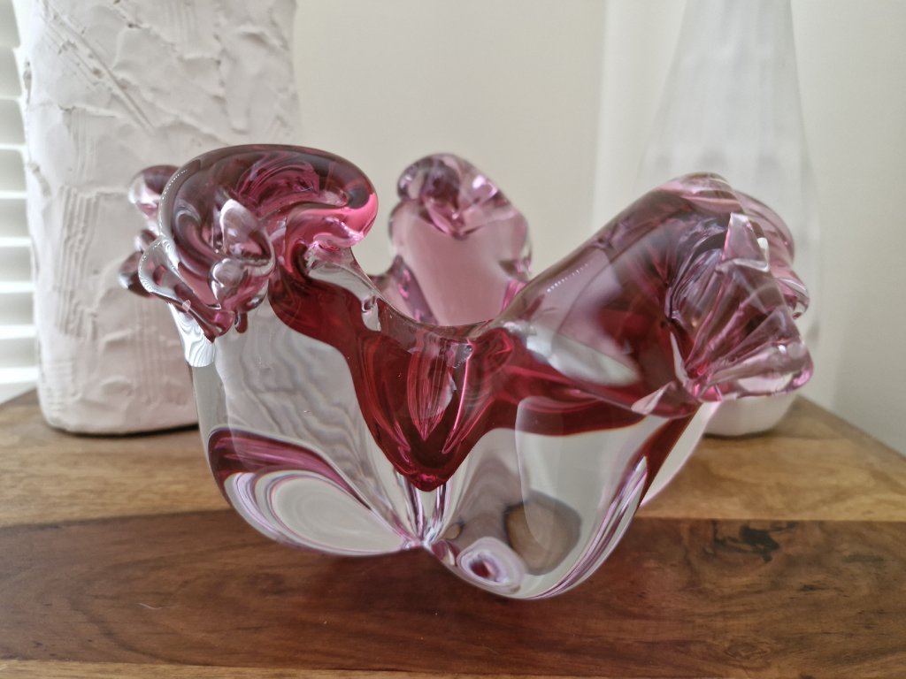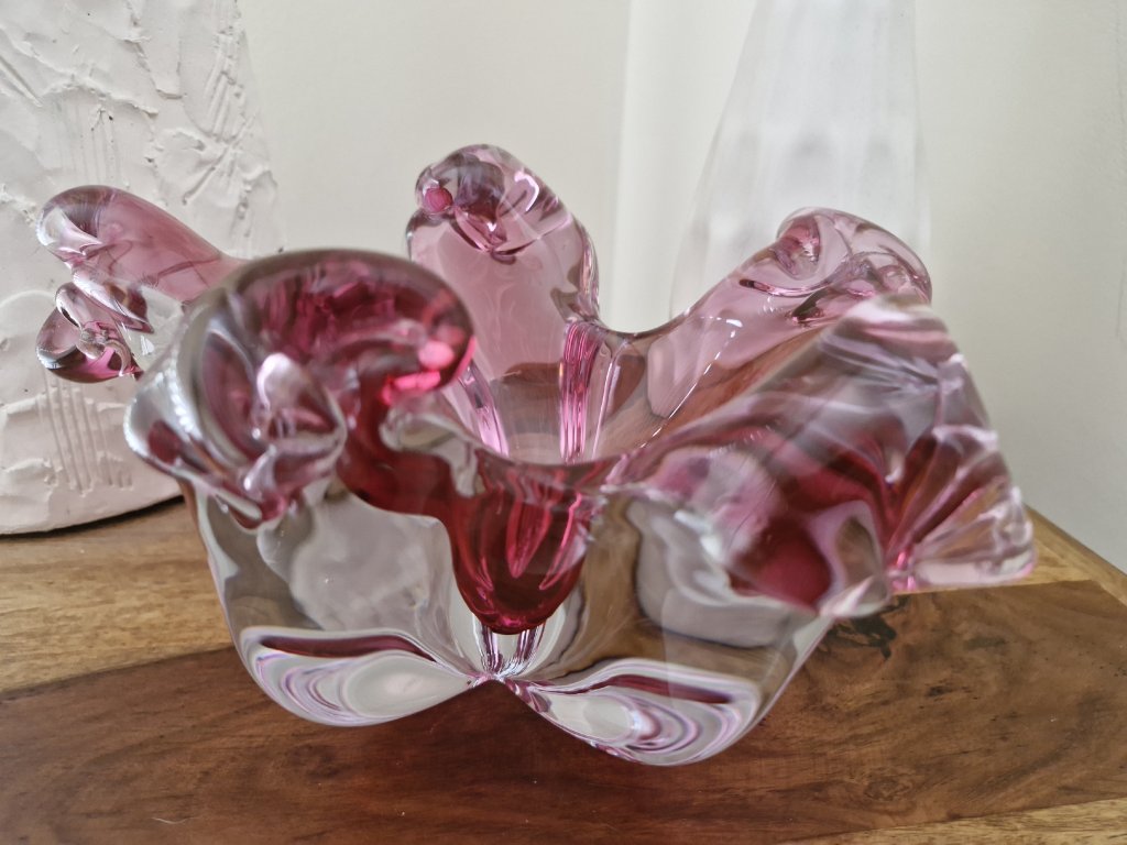 Nádherná mísa z hutního skla ve velmi výjimečném a vzácném tvaru. Autorský návrh Josef Hospodka, sklárna Chřibská, 60. léta 20. století. Výška 13 cm, průměr 24 cm. Top luxusní stav.