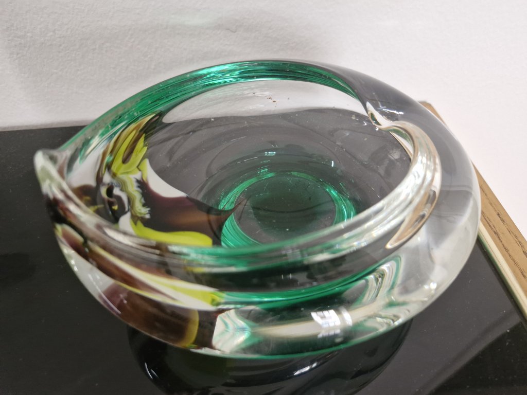 Krásná sada z hutního skla sestávající z vázy a popelníku se zataveným barevným dekorem ve tvaru pavího pera. Autor návrhu Jiří Šuhájek, sklárna Crystalex Nový Bor, 70. léta 20. století. Váza výška 15 cm, popelník výška 8 cm, délka 16 cm. Top stav.