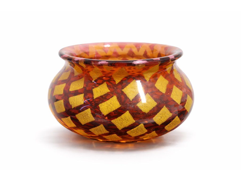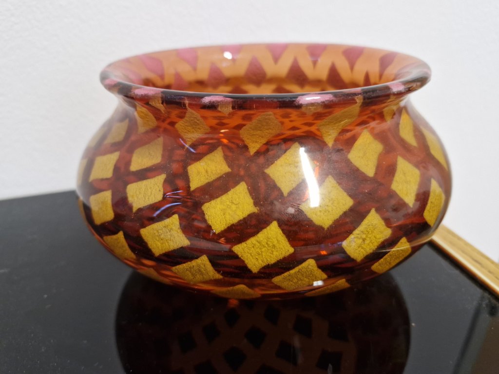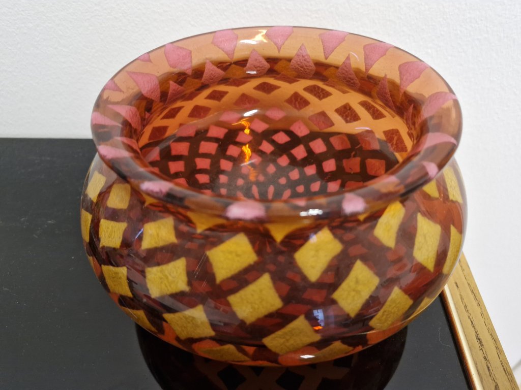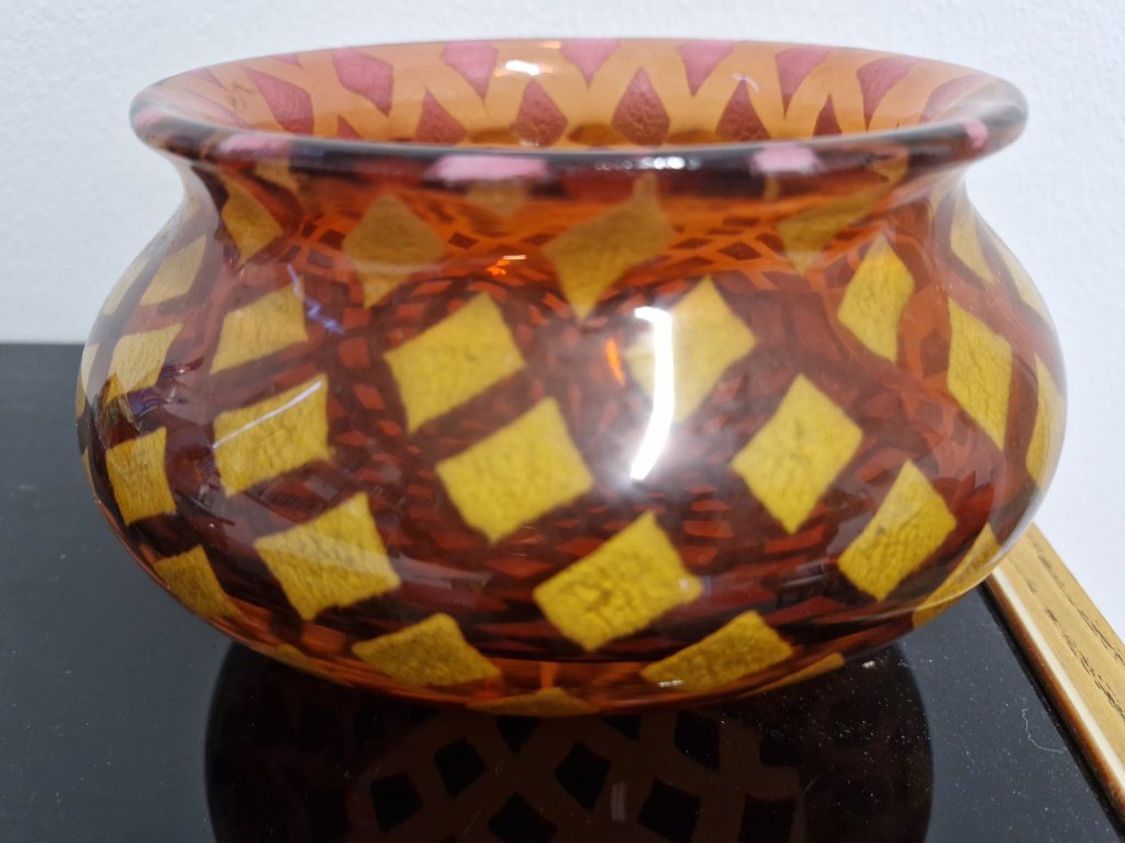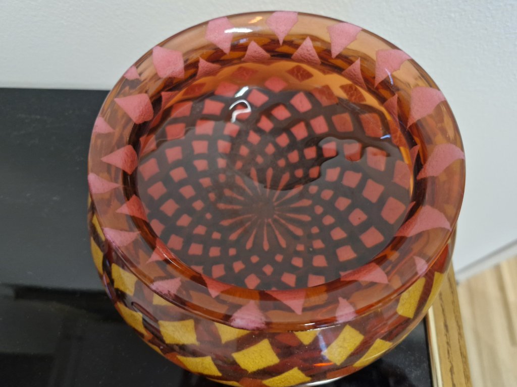 Dokonalá masivní mísa z hutního skla v růžové barvě skloviny se žlutým geometrickým vzorem. Autorský návrh Josef Hospodka, sklárna Chřibská, r. 1966. Jedná se o mimořádně raritní kousek. Výška 12 cm, průměr 20 cm. 100% TOP sběratelský stav.