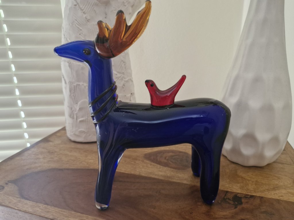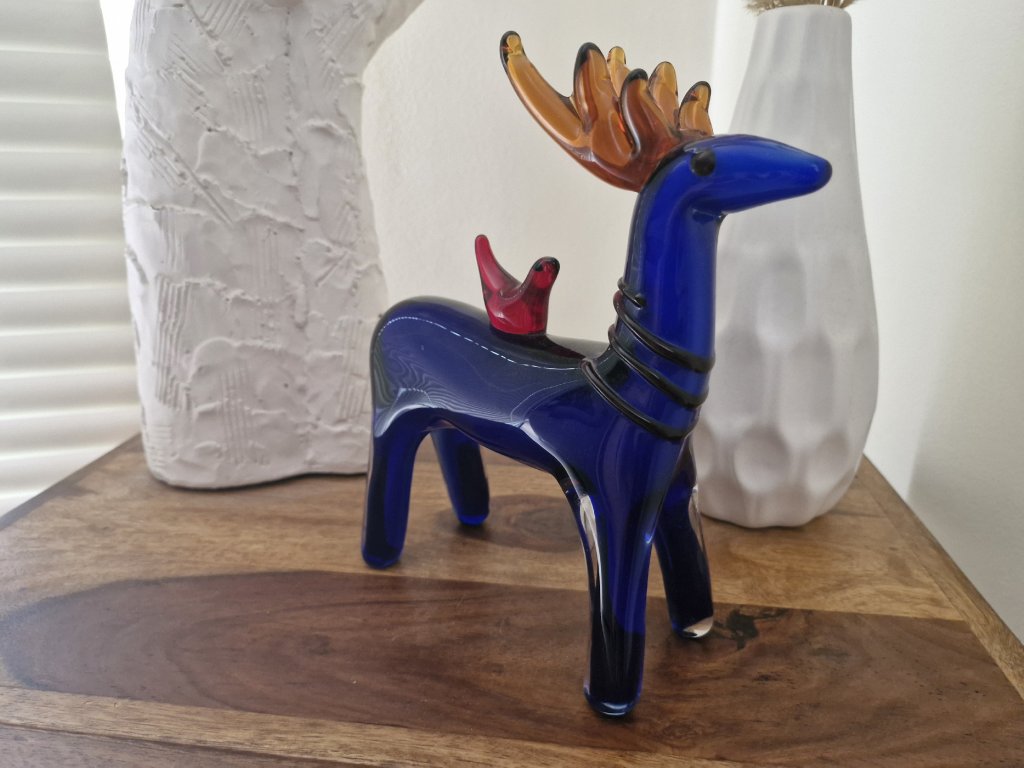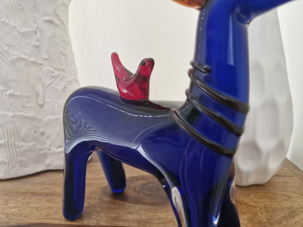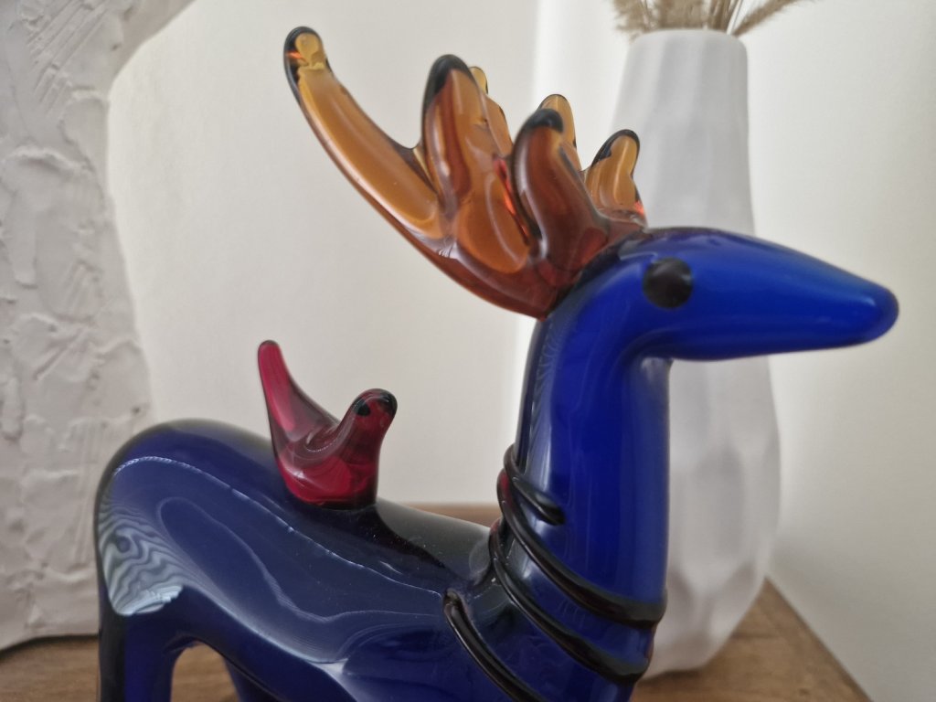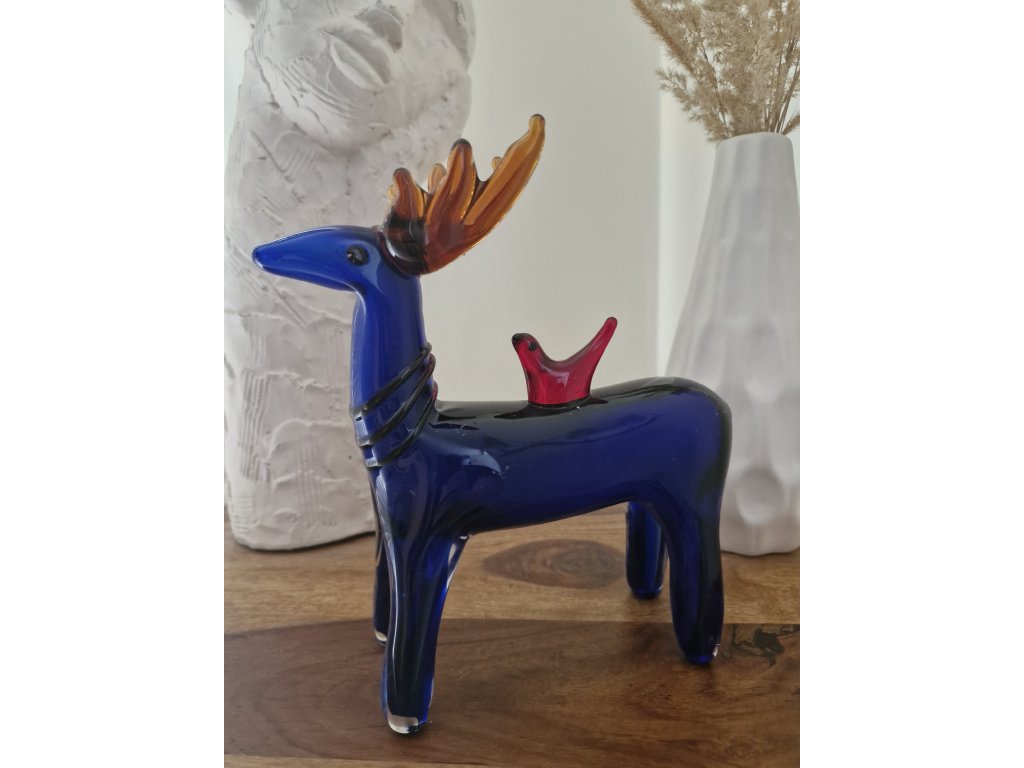 Nádherná kombinace vtipu a šikovných sklářských ručiček :) Krásný jelen s ptáčkem na zádech oživí každý interiér a očarí svým jedinečným vzhledem. Výška 21 cm, délka 20 cm. Top stav.
