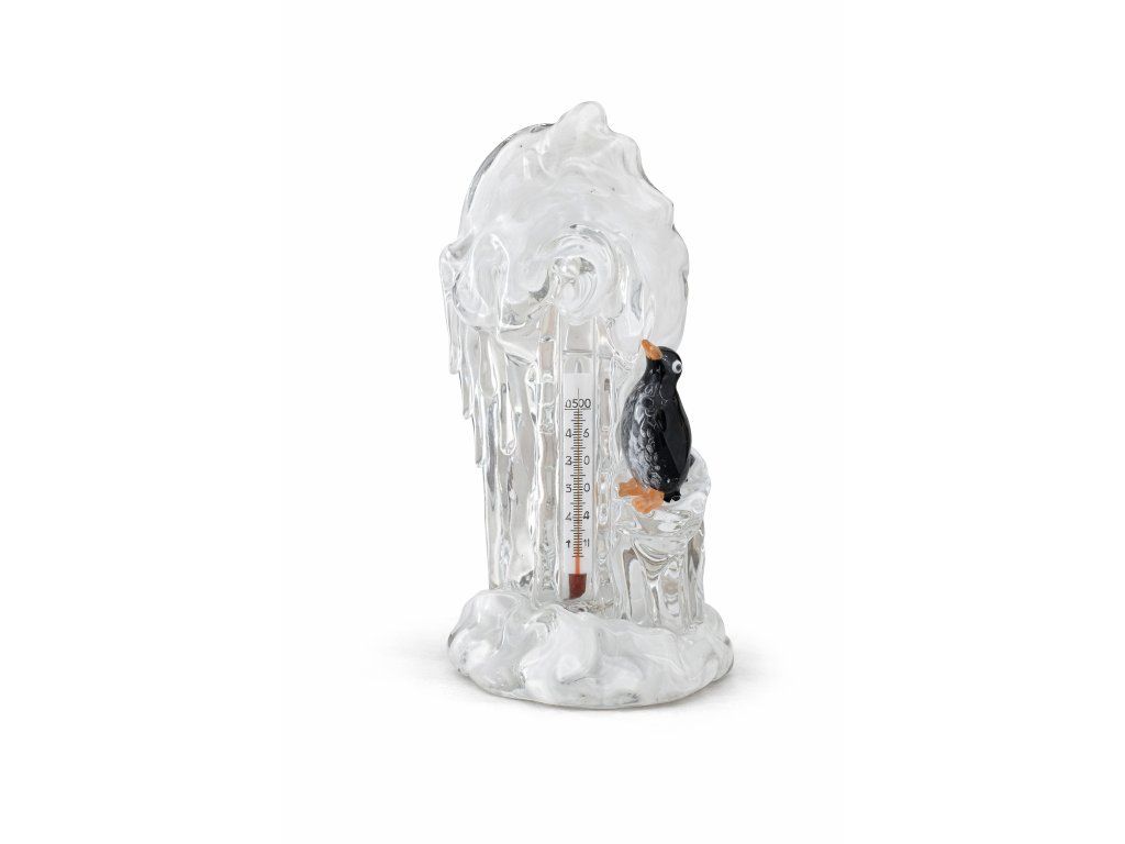Parádní skleněný teploměr s tučňáčkem dle autorského návrhu Jaroslava Brychty, sklárna ŽBS, 60. léta 20. století. Výška 18 cm. 100% TOP stav, bez jakéhokoliv poškození. Teploměr je plně funkční.
