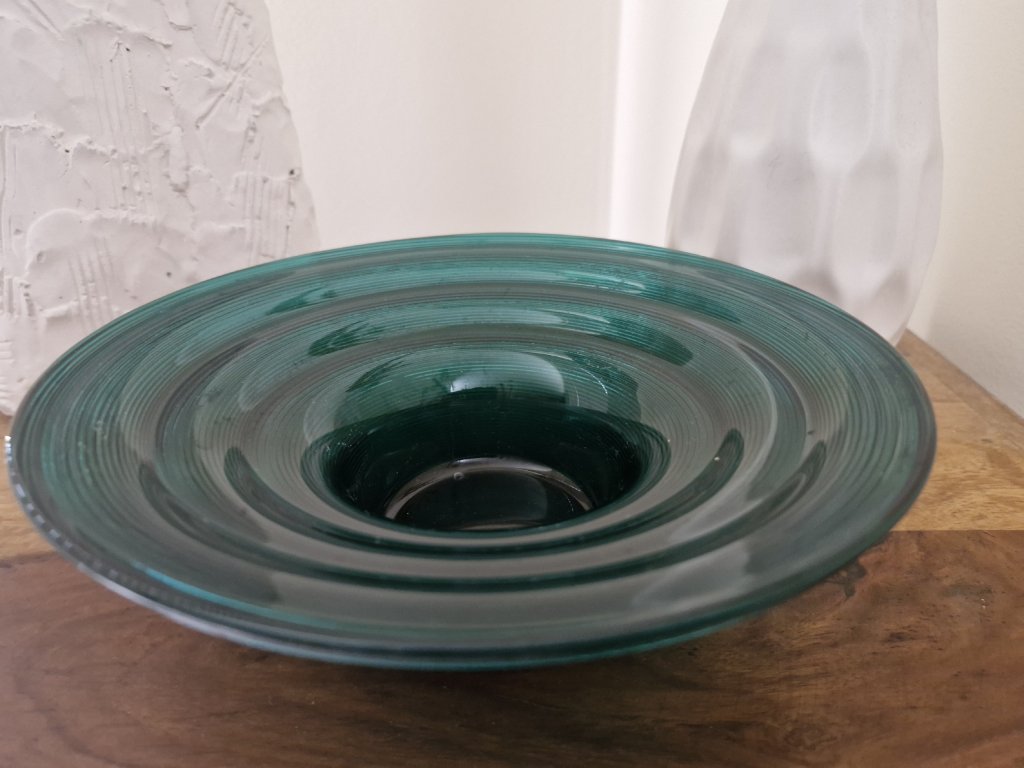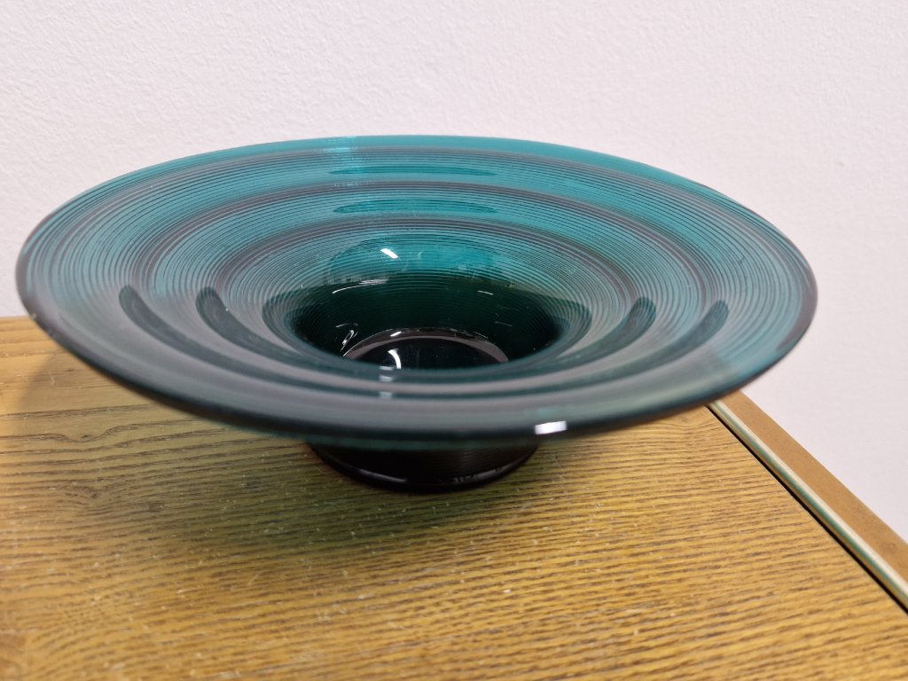 Krásná smaragdová mísa vyrobena technikou litého odstředivého skla dle autorského návrhu Jiřího Šuhájka, Crystalex Nový Bor. Výška 7 cm, průměr 20 cm. TOP stav.