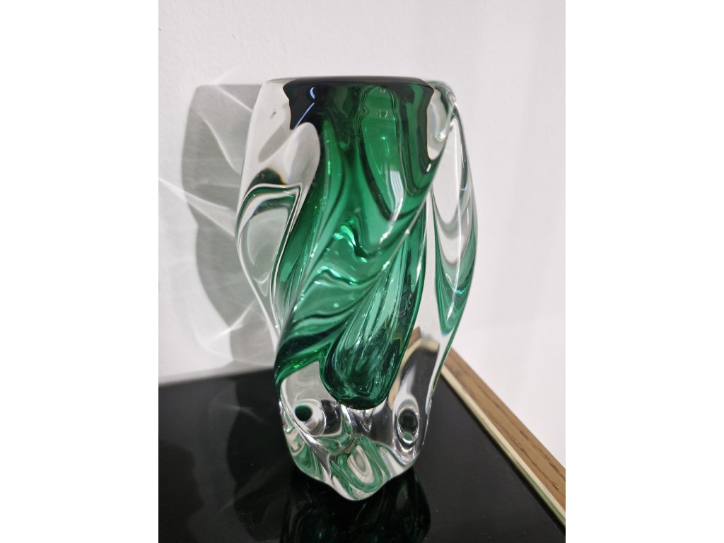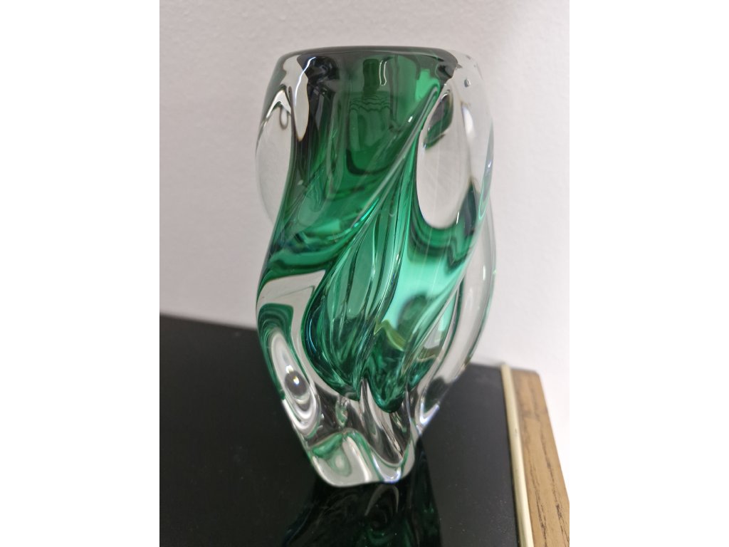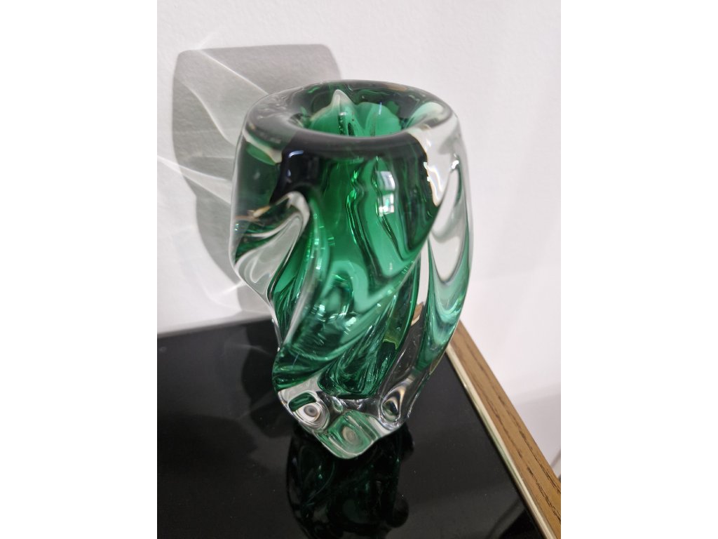 Nádherná smaragdová váza z hutního skla, tzv. "Vrtule". Autor návrhu Josef Hospodka, sklárna Chřibská, 60. léta 20. století. Výška 16,5 cm. Top stav.