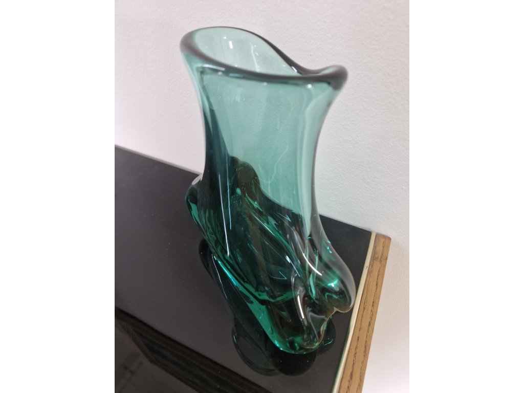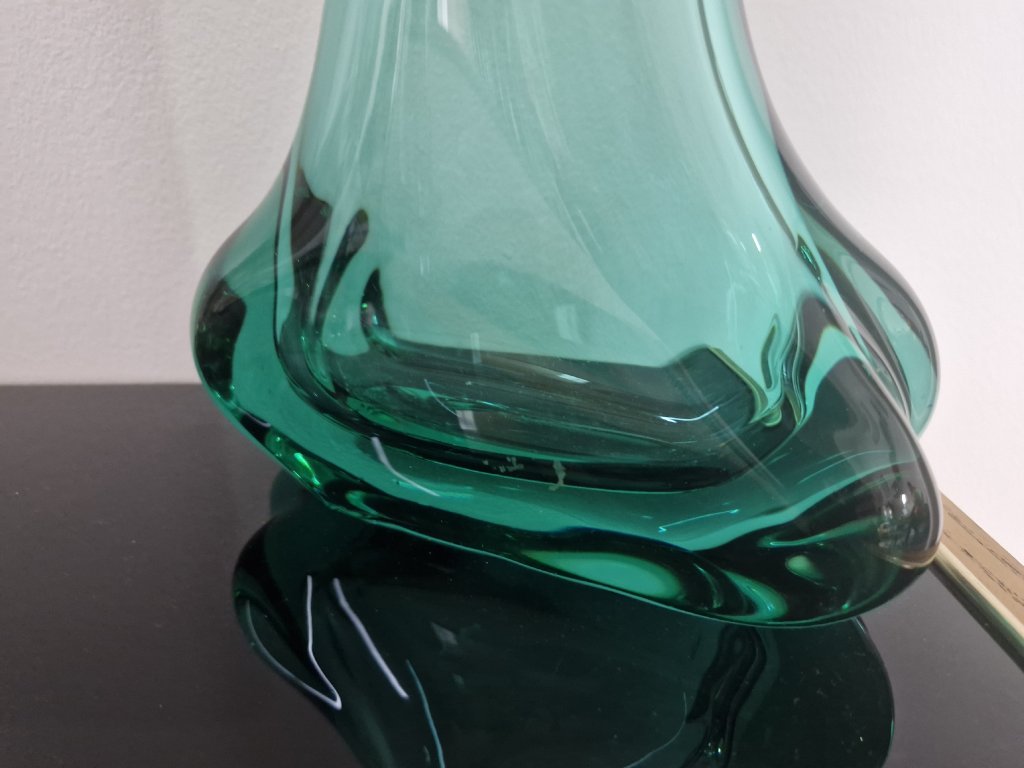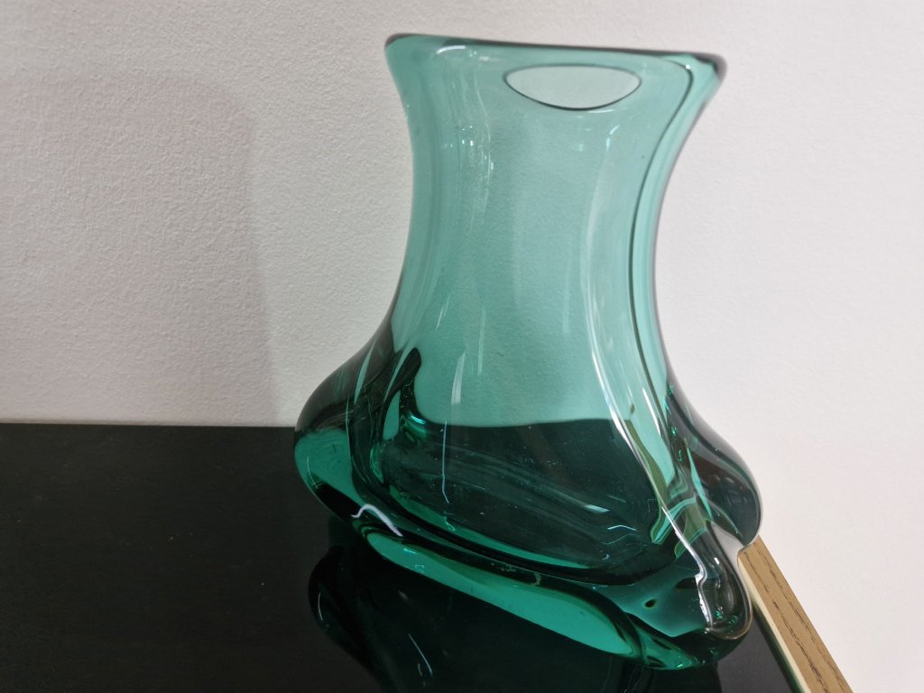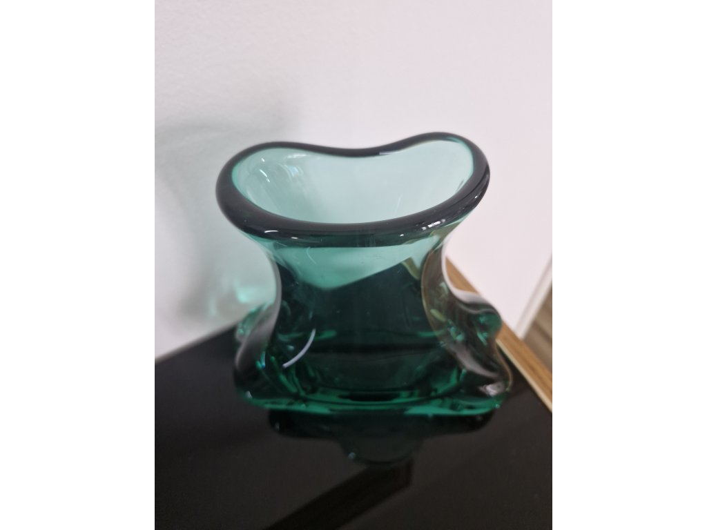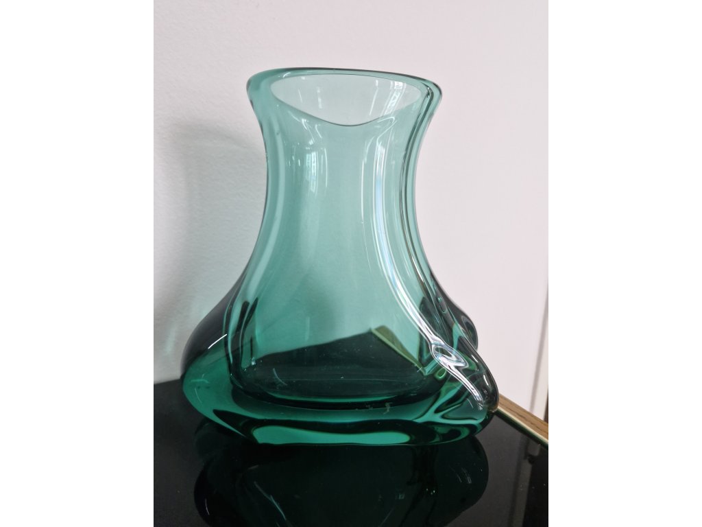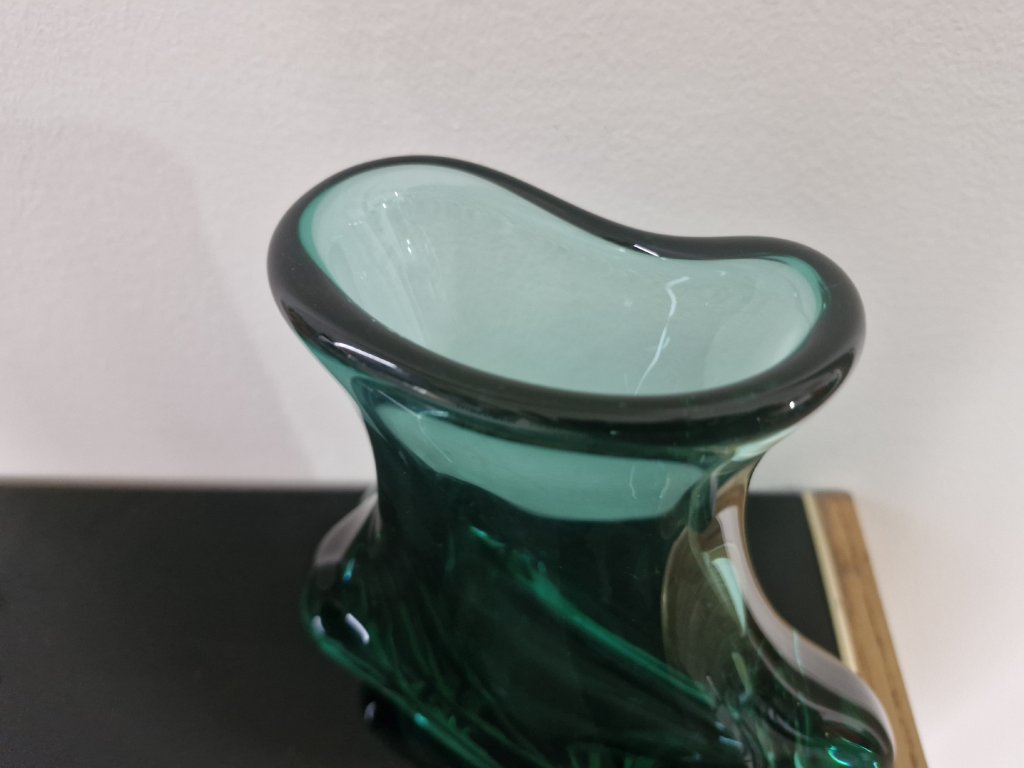 Nádherná smaragdová váza z hutního skla dle autorského návrhu Miloslava Klingera, sklárna ŽBS, 60. léta 20. století. Výška 23 cm. Top stav.