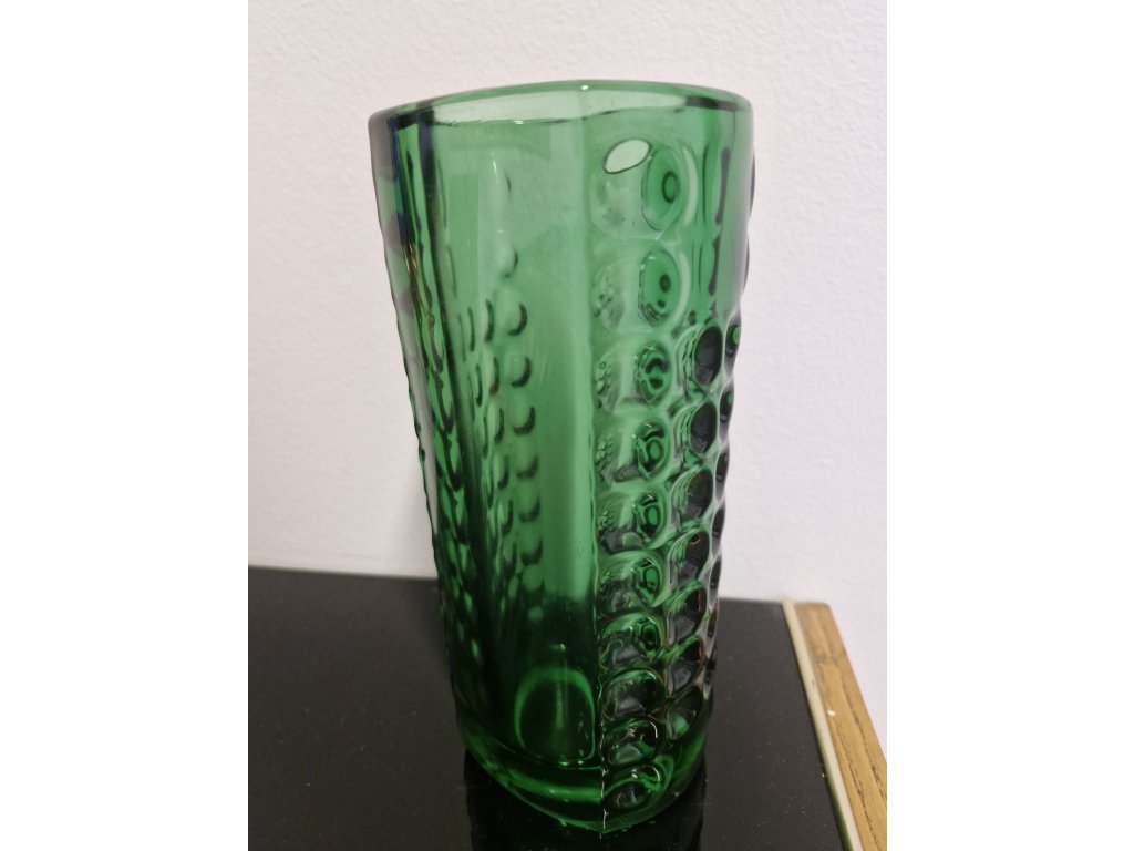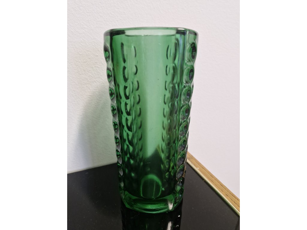Krásná váza z lisovaného skla dle autorského návrhu Rudolfa Jurnikla, sklárna Rudolfova huť, r. 1963. Výška 20 cm. Bez poškození.