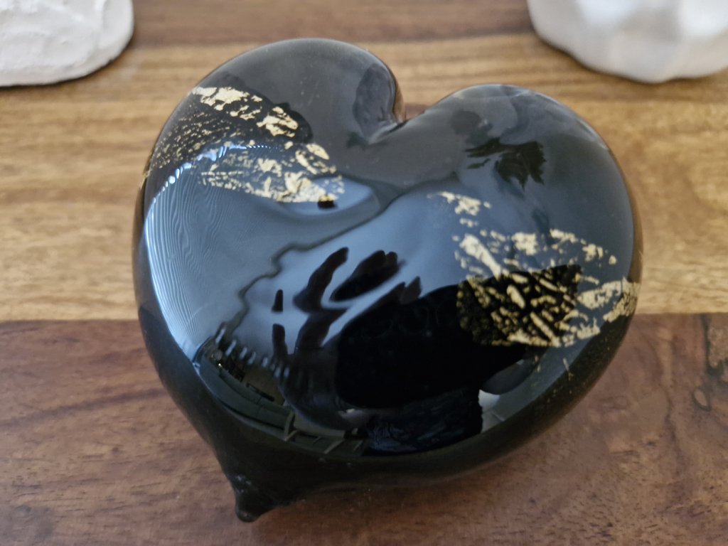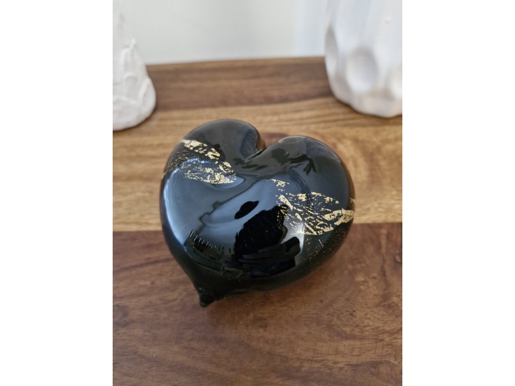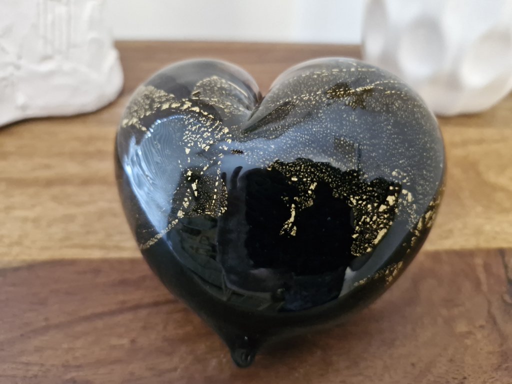Krásná interiérová dekorace - srdíčko z foukaného skla se zlatými částečky, které vytvářejí moderní mramorový vzor. Z produkce sklárny Jílek, Kamenický Šenov. Rozměry: 12x11 cm. Top stav nového zboží.