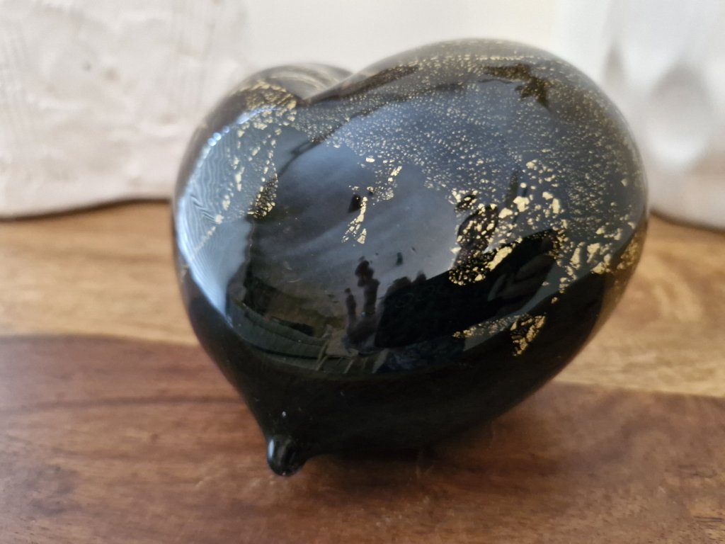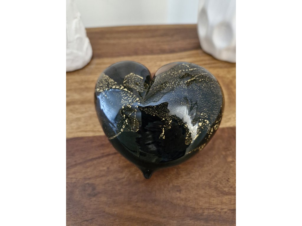 Krásná interiérová dekorace - srdíčko z foukaného skla se zlatými částečky, které vytvářejí moderní mramorový vzor. Z produkce sklárny Jílek, Kamenický Šenov. Rozměry: 12x11 cm. Top stav nového zboží.