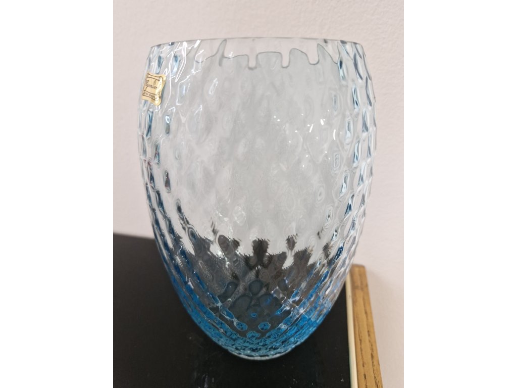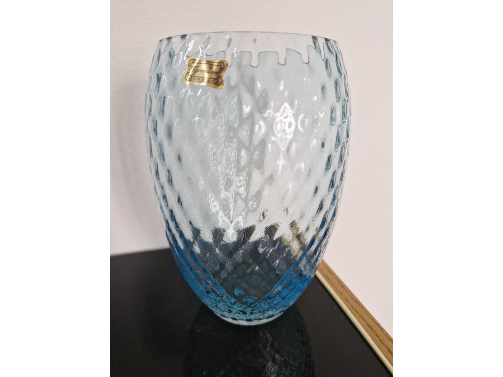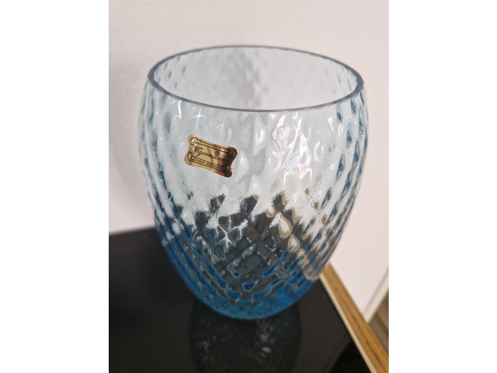 Nádherná tyrkysová váza z foukaného skla s dekorem diagonálních pruhů inspirována původním návrhem Maxe Kannegiessera, kolekce NEMO. Provedla sklárna Egermann, Nový Bor, 2. pol. 20. století. Výška 21 cm. S původní nálepkou sklárny. Top stav nového zboží.