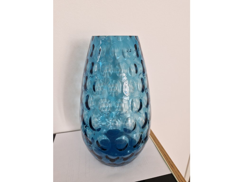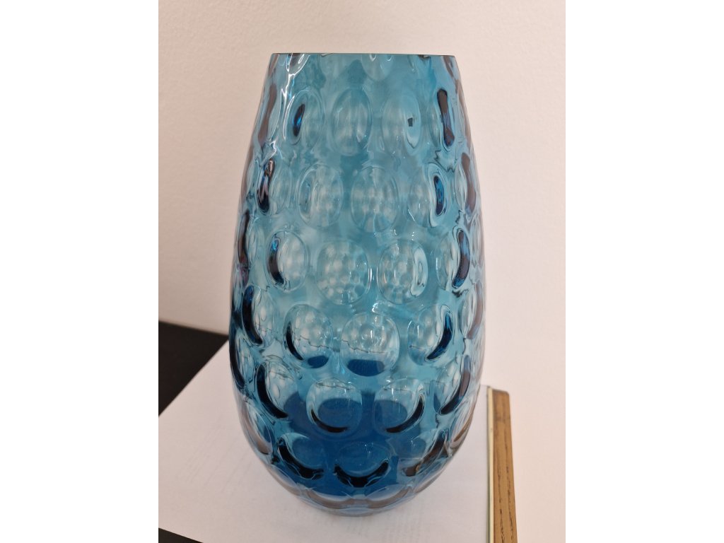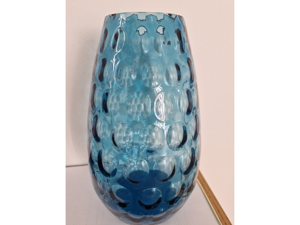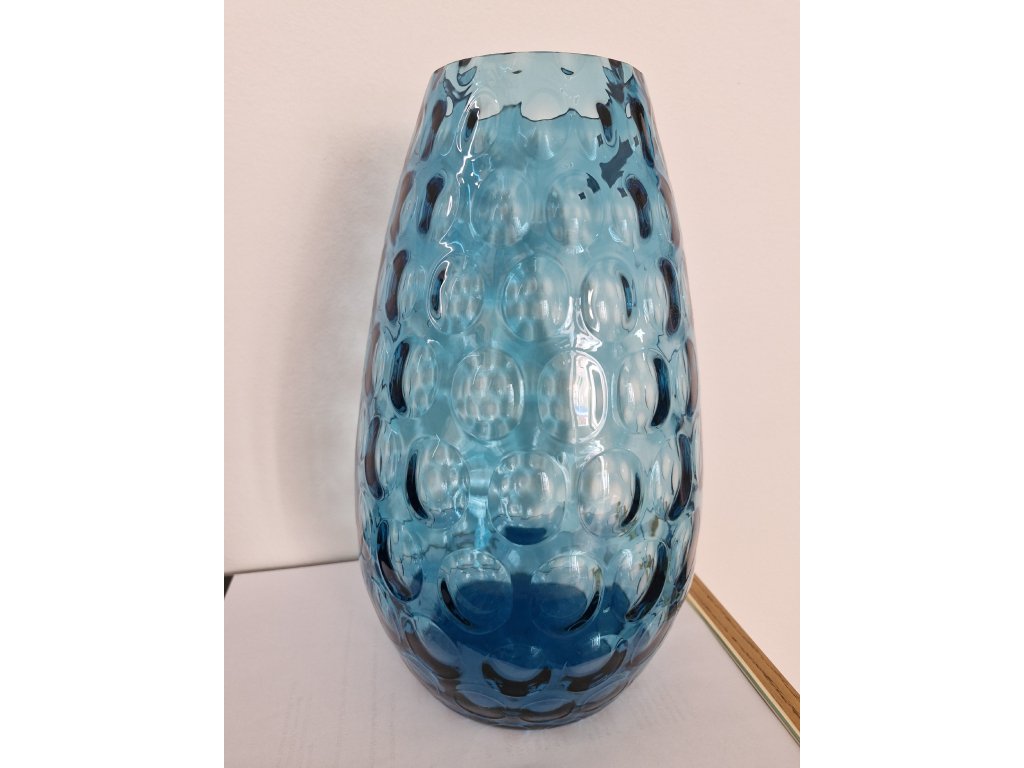 Nádherná tyrkysová váza z foukaného skla ve vysoké variantě s dekorem optických čoček dle apůvodního návrhu Maxe Kannegiessera, kolekce NEMO. Provedla sklárna Egermann, Nový Bor, 2. pol. 20. století. Výška 31 cm. S původní nálepkou sklárny. Top stav nového zboží.