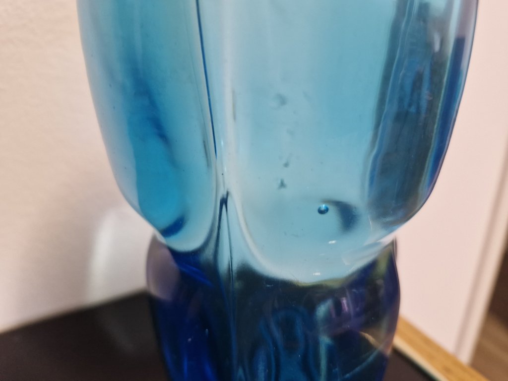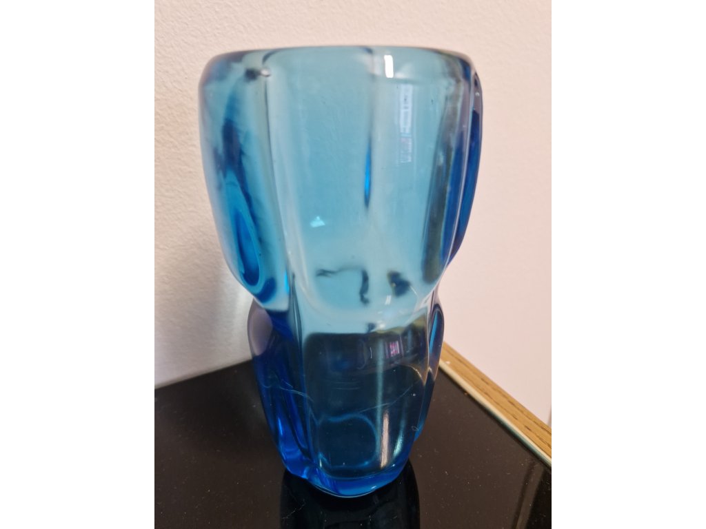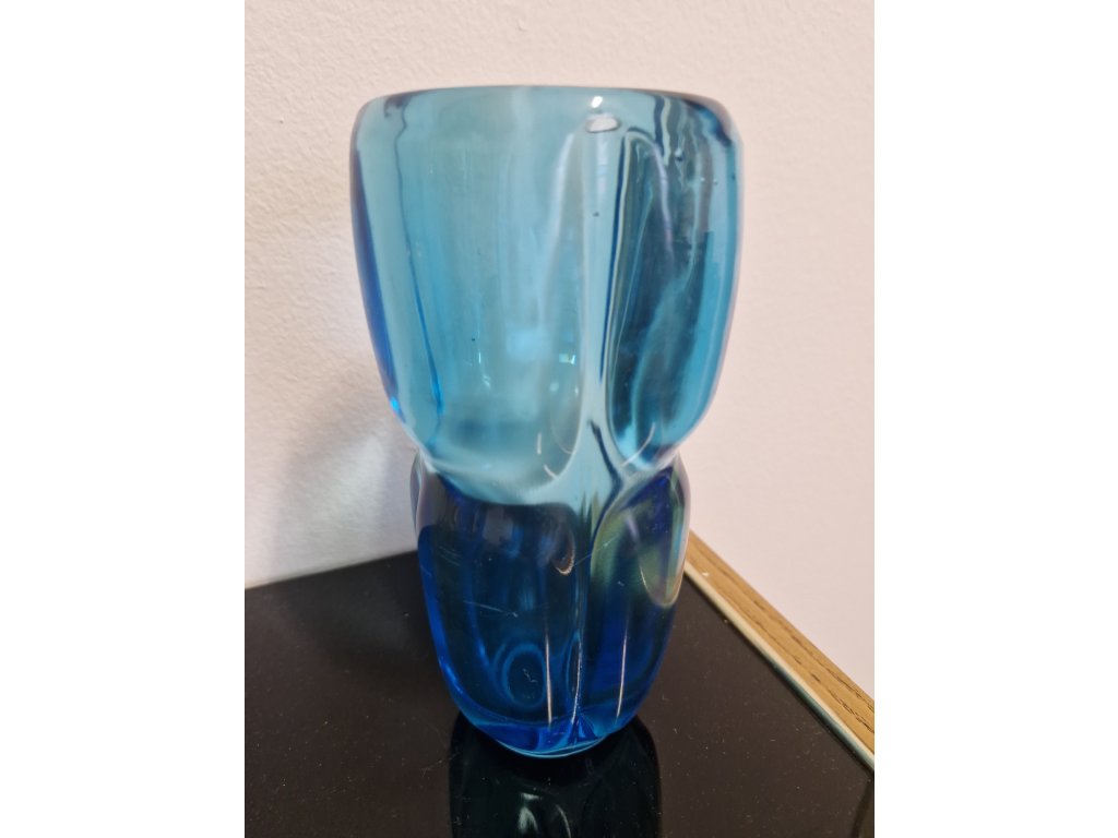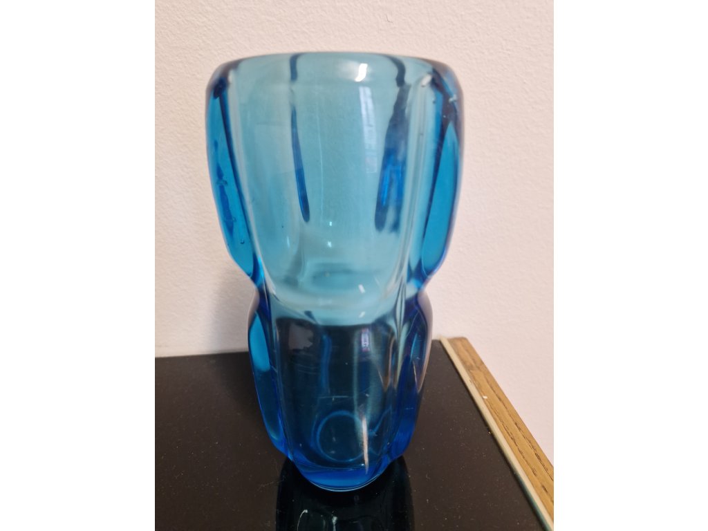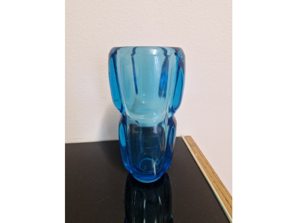 Krásná váza z lisovaného skla v tyrkysové barvě. Autor návrhu Frnatišek Vízner, sklárna Rudolfova huť, r. 1962. Výška 18 cm. Na boční straně několik mikroskopických oděrků - nic hrozného, vyfotila jsem to.