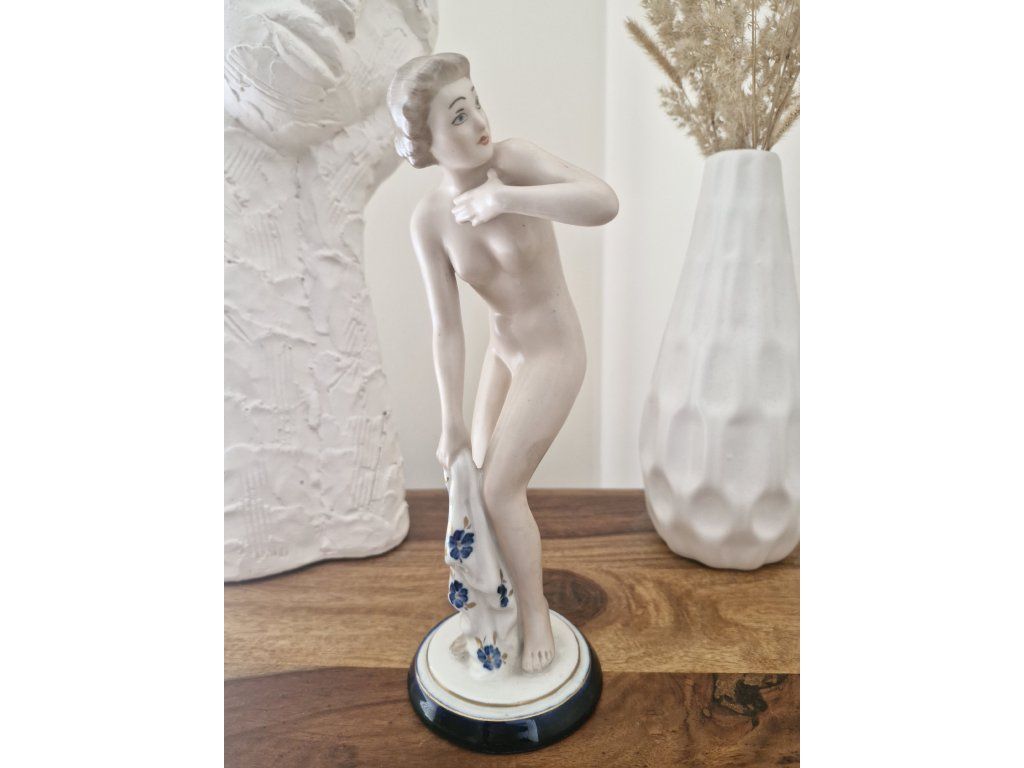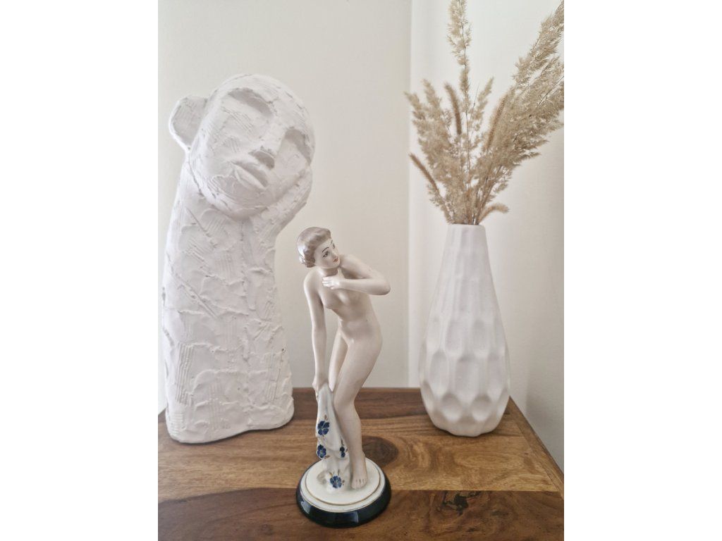 Unikátní figurální plastika "Dáma s ručníkem" dle autorského návrhu Elly Strobach Königové, cca polovina 20. století. V 100% top sběratelském stavu.